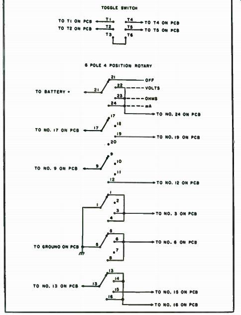 The 5-digit display is controlled by the digit multiplexer internal to IC3. An LED to the immediate left of the display is on for negative measure ments. The circuitry is complicated by the requirement of an accurate positive and negative voltage reference for dual-slope integration. A "flying capacitor" technique is used to bias all input voltage to IC11 to + 1 volt. This way, a ground level appears to be - 1 volt, and only a positive reference is required. Another complication is that IC3 does not have the drive capability for the numeric readouts. Therefore, a 7447 decoder driver must be added for segment and discrete transistors must be used for digit drivers. Resistors are required to limit base currents and additional resistors are required to limit segment current. In order to control the variable gain amplifier, sample switch and autozero circuit, analog switches must be used. The three analog switch packages are powered from a ±- 8.2v supply. The control input to these switches must also be ±8.2v. Therefore, a level converter is necessary to convert the +5 ground level of IC3 to ±8.2v. The three LM339 ICs were added for this purpose. Leftover portions of the LM339s were used for gating functions. IC3 has inputs which provide the capability of changing the upper and lower limits of the auto-range circuitry. Since all three functions use different limits, a 4052 (IC4) multiplexer was required. IC4 senses the mode of operation and applies the desired range limits to IC3. For example, the upper range for volts in nnnn.n and the upper range for ohms is nn.nnn. The ±8.2volt supply was developed experimentally. A 555 (IC7) oscillator drives the primacy of a transformer. Each side of the center-tapped secondary forms a half-wave recitifier circuit with one being positive and the other being negative. Each voltage is regulated at 8.2 volts to limit the maximum output voltage. Since IC3 is a digital multimeter, not a digital voltmeter, use of existing circuitry to measure resistance and current is simplified. In addition to providing two inputs to IC3 for the function desired, slight modification to the variable gain amplifier is required. When reading ohms, the unknown resistor becomes the feedback resistor for IC12, and the feedback resistors become the input resistors for IC12. Current measurement is made possible by measuring the voltage drops across a 1-ohm resistor. Construction. The use of a double-sided plated-through printed circuit board simplified construction. For a complete parts list, see Table 7-2. The most important decision, prior to inserting parts as shown on the assembly drawing (Fig. 7-20), is to consider the mounting of the PC board. The front panel is 3/4 " from the board. It was with this in mind that most capacitors were mounted on the bottom side. The transformer also presents a problem and is mounted on the bottom. The four 18-turn pots can be mounted on the bottom. This will permit calibration without removing the front panel. The rotary switch must be insulated from the board using nonconducting washers. Do not remove the nut on the switch; doing so can change the stop pin for the switch. Wiring from the switch to the PCB is simple, since the points on the board contain the same number as the points on the switch. The common lugs are slightly recessed. When wiring to a common lug, go to the number specified and use the recessed lug (the one closest to the shaft). Switch lug-to-switch lug wiring should be done according to the switch wiring diagram (Fig. 7-17). The AC/DC toggle switch should be wired as shown in Fig. 7-17. The PCB is marked for easy switch-to-PCB wiring. Be careful when installing this switch in the panel as it is easy to put it in upside down.