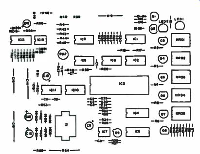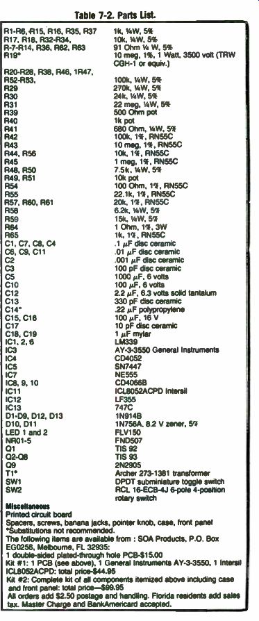 Use caution when inserting the ICs. Note that pin 1 is located away from the NRO, except for IC4 and IC5. T1 wiring is aided by PCB marking. The white, black and yellow leads are dosest to the NRO. Only the yellow and white leads are used (marked Y and W). The white, blue and red leads are connected to the W, B and R points marked on the PCB. Calibration. The most critical adjustment is R40-the 1.0000-volt reference. This is the one calibration point where it is desirable to borrow an extremely accurate voltmeter. An easy point to pick up this line is switch 2 lug 15. Simply adjust R40 until a 1.0000-volt reading is measured. With the DMM in the volts mode; short the voltage input to ground and adjust R48 for a zero reading on the DMM display. Connect a known-value AC voltage to the voltage input, and adjust R50 for a proper reading on the DMM display. Make sure the AC/DC switch is in the AC position. Insert a 1k to 1.799k precision resistor across the ohms input (AC/DC switch in DC position), and adjust R39 so that the DMM display gives the correct value for the resistor. If an accurate voltmeter cannot be obtained, then calibration can be accomplished by the following procedure: • Short out the voltage input leads, set the meter to DC volts and adjust R48 for a zero reading. • Obtain a precision resistor above 1800 ohms (10k to 17.9k desirable), set the meter to the ohms mode and connect the resistor to the meter leads. Adjust R40 until the DMM gives the proper value. • Obtain a precision resistor below 1800 ohms (1k to 1.79k desirable), set the meter to the ohms mode and connect the resistor to the meter leads. Adjust R3 until the DMM gives the proper value. • Set the DMM to read AC volts. Connect the voltage probe to SW2 pin 15 and adjust R50 until the DMM reads 1.0000 volts. ----------------- ![]() Table 7-2. Parts List. R1- R6, R15, R16, R35, R37 R17 Ri8, R32-R34 R-7-R14, R36, R62, R63 R19* 1k, 1/4 W, 5% 10k, 1/4 W, 5% 91 Ohm 1/4 W, 5% 10 meg, 1%, 1 Watt. 3500 volt ( TRW CGH-1 or equiv ) P20-P28, R38. R46, 1R47, R52-R53, 100k, UW, 5% R29 270k, 1/4 W, 5% R30 24k, 1/4 W, 5% R31 22 meg, 1/4 W, 5% R39 500 Ohm pot R40 1k pot R41 680 Ohm, 1/4 W, 5% R42 100k, 1%, RN55C R43 10 meg, 1%, RN55C R44, R56 10k, 1%, RN55C R45 1 meg, 1%, RN55C R48, R50 7.5k, UW, 5% R49, R51 10k pot R54 100 Ohm, 1%, RN55C R55 22.1k, 1%, RN55C R57. R60, R61 20k, 1%, RN55C R58 6.2k, 1/4 W, 5% R59 15k, 1/4 W, 5% R64 1 Ohm, 1%, 3W R65 1k, 1%, RN55C C1, C7, C8, C4 1 µF disc ceramic C6, C9 C11 01 µF disc ceramic C2 001 µF disc ceramic C3 100 pF disc ceramic C5 1000 MF, 6 volts C10 100 µF, 6 volts C12 2.2 µF, 6.3 volts solid tantalum C13 330 pF disc ceramic C14* .22 MF polypropylene C15. C16 100 µF, 16 V C17 10 pF disc ceramic C18, C19 1 MF mylar IC1, 2,6 LM339 IC3 AY-3-3550 General Instruments IC4 CD4052 IC5 SN7447 IC7 NE555 IC8, 9, 10 C040666 IC11 ICL8052ACPD Intersil IC12 LF355 IC13 747C D1- D9, 012, 013 1N914B D10. D11 1N756A, 8.2 V zener, 5% LED 1 and 2 FLV150 NR01-5 FND507 01 TIS 92 02-08 TIS 93 09 2N2905 T1 Archer 273-1381 transformer SW1 DPDT subminiature toggle switch SW2 RCL 16-ECB-4J 6- pole 4- position rotary switch Miscellaneous Printed circuit board Spacers, screws, banana jacks, pointer knob, case, front panel 'Substitutions not recommended. The following items are available from : SOA Products. P.O. Box EG0256, Melbourne, FL 32935: 1 double-sided plated- through hole PCB-515.00 Kit # 1: 1 PCB (see above), 1 General Instruments AY-3-3550, 1 Intersil ICL8052ACPD. total price-$44.95 Kit 42: Complete kit of all components itemized above including case and front panel total price-$99.95 All orders add $2.50 postage and handling. Florida residents add sales tax. Master Charge and BankAmericard accepted. -----------------------------