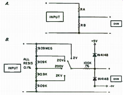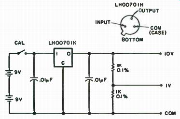 Calibration is quick and easy once you are set up. Obtain a DC voltmeter calibrator that is at least 0.01 percent accurate. Or, lacking that, you can build the calibrator shown in Fig. 7-4. It is designed around the National LH0070IH 0.01 percent 10 volt reference, which sells for about $5.00. Circuit Specialists might be able to get one for you. Power is supplied by two 9 volt batteries. Lacking this calibrator, you can either calibrate your voltmeter against another DVM, OR (shudder) with a 1.34 volt mercury battery. The battery is a last resort, because you might be able to get only about 1 percent accuracy or so, depending upon the condition of the battery. It should be fresh and unused. With that out of the way, connect up the voltmeter and apply power. Let it settle down for about 20 minutes or so and then short the input leads together. Adjust the zero pot, R2, for a 000 reading. You'll see the meter read something like 087-093-097-098-099-000-001-002 if all's well. Once the zero is adjusted, apply either x2.000 volts from the commer cial calibrator (preferred) or + 1.000 volts from this calibrator. This is assuming you have the basic 0 to 2 volt unit; for other units increase the input voltage by x10, x 100 or whatever. Then tweak RI, the calibration pot, for a 1.999 to . 000 reading (or 1.000 with a 1 volt calibrator). Go back and short the input leads to check the zero; if it is necessary to adjust zero, recheck the calibration, too. These adjustments interact somewhat. I hope you like your new digital voltmeter. It really adds a touch of class to have equipment in the workshop with digital readouts. The price is right, too. You probably spent about one-quarter as much for your meter as you would have for a commercial unit! Build a 3 1/2 Digit DVM If you have been looking for something to update your meter, but the price of a new one and the price of a portable digital voltmeter has scared you away, you'll love this project.