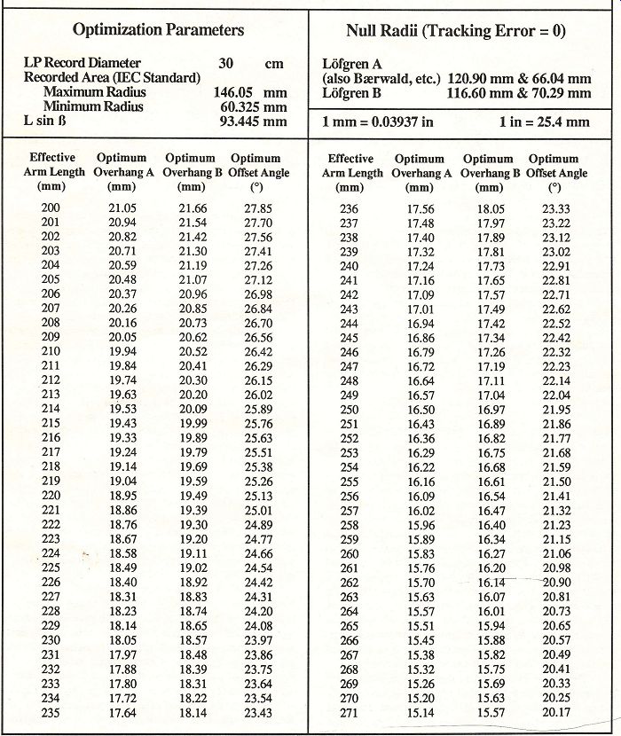 Phonography: Lateral Tracking Alignment Revisited (Maybe Your Overhang Is Wrong After All); Bonus Filler: Diagram of Protractor for "Lofgren B" Alignment; Metric Table of Optimum Overhang and Offset Angle Alignments for Pivoted Tonearms ------- ![]() above: This is a bonus filler for those who may be a little bewildered by the article on the "Lofgren B" alignment for optimum lateral tracking geometry and are wondering where to begin the fabrication of a protractor. The above diagram is drawn to scale but not printed accurately enough to be used as a cutout. Make it from scratch out of reasonably stiff cardboard and lay out very accurately the two null radii marked by the "cross hairs." Dimensions are rounded off to the nearest 0.25 mm. -------- A re-examination of the key papers published so far on lateral tracking geometry in pivoted tonearms reveals total consensus and consistency, but the granddaddy of all the researchers also suggested an alternative optimization that tends to rock the boat, as it may well be superior to what everybody is blithely using today. As the tuned-in element in the audio world is well aware, The Audio Critic exerted considerable influence in its early years (especially 1977 and 1978) over the unofficial but almost universal standardization of tonearm geometry that later became more or less taken for granted. We were not the only ones who tried io bring order to the chaos of conflicting practices prevailing at the time; others who were quite vocal on the subject included Mitchell Cotter, Sao Win, Dave Hadaway, Frank Dennesen and Mike Goldstein, the last three of whom even devised and sold various ready made alignment gauges. What made our own contribution unique, however, was an unintended development we were never really comfortable with. It seems that the alignment tables and instructions we published in Volume 1, Numbers 4 and 6 were so handy and comprehensive that they soon became widely accepted as the gospel on the subject and the starting point for all sorts of new designs in tonearms, gauges, protractors, record players, etc. Now, it is true that we had researched the situation rather thoroughly and gave our readers the best information obtainable anywhere, at least until the present moment. Even so, our intention was to help audiophiles at home and dealers in their stores, not to provide a free R-and-D package to equipment manufacturers. If it had been our plan to de sign and manufacture expensive phono products, we would have immersed ourselves even more deeply in the subject and hopefully come up with the findings we are only now reporting. (If you wanted to make reflecting telescopes for astronomers, you would not go to the science section of The New York Times for your prime reference, marvelous as it is.) Enter Graeme Dennes, the elucidator. While we were planning and writing the Winter 1982 83 issue that was never published, we had the good fortune to become acquainted with a remarkable Australian named Grzme F. Dennes, who at the time was working in the American Aerospace industry in California and Georgia. (Meanwhile he is back in Australia, to the best of our knowledge.) As an avocation, Graeme had delved into the theory, mathematical fundamentals, literature, history and implementations of lateral tracking alignment more thoroughly than any human before or since; his mission was, like Captain Kirk's, to go where no man had gone before- in that particular universe of investigation. He brought to this recreational obsession a scientific impartiality and mathematical savvy that provided desperately needed relief from the effusions of untutored techno-hysterics collecting in our mailbox. His massive thesis, "An Analysis of Six Major Articles on Tone Arm Alignment Optimization and a Summary of Optimum Design Equations," dated March 1983, is a minor masterpiece of comparative elucidation, even if it contains no previously unknown material and has not been printed anywhere, as far as we know. Originally, Graeme wanted us to publish this heavily mathematical paper in The Audio Critic, but we told him that it would be understood and appreciated only by a small minority of our readership, since it really belonged in the journal of an engineering society. Intent on exposing his work to a broader segment of the audio community, he then wrote a clear and nonmathematical overview of his findings and sent it to us in the form of a letter to the Editor. When he found out that our Winter 1982-83 issue was not happening and that we would not be able to print his letter, he sent it to Audio magazine, where it appeared in the May 1983 issue with a postscript by Barney Pisha, another recognized student of the subject. Dr. Pisha's otherwise thoughtful and receptive comments included the astonishing observation that "with the advent of the compact digital audio disc and the laser beam stylus, all this, of course, becomes moot as it is relegated to the pages of history"-as if new phono cartridges and tonearms were not being sold anymore and mounted on new turntables every day with a need for correct alignment. There can be no doubt that we are witnessing the waning days of the phono arts and that the century-old technology of a hinged stylus mechanically driven by a rotating spiral groove has a limited future. That does not mean, however, that the millions and millions of music lovers who continue to depend on that technology for their home listening pleasure cannot benefit here and now from the work of a Graeme Dennes. The fact is that the very reason for this article arises from a little-known alternative approach to lateral tracking optimization that nobody but Graeme has ever analyzed comparatively, let alone discussed in print, since its publication 49 years ago and that even he tended to treat only in passing until we started pestering him for more information. It is anything but "moot," as you will see, but first let us summarize the overall thrust of his w