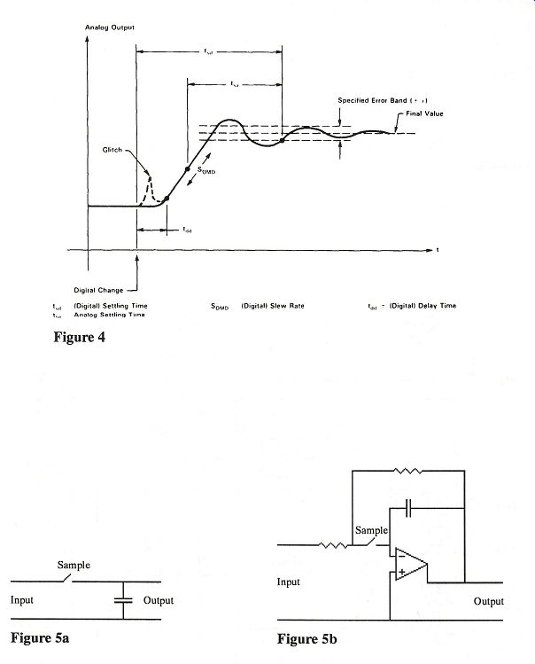 Figure 4 shows the dynamic response of a DAC to a step change in the digital input code. The glitch is a short, undesirable transient in the analog output following a code change at the digital in put. The glitch area, the time integral of the analog value of the glitch transient, should be as small as possible in DACs used in audio applications that do not in corporate a deglitching circuit. The settling time of a DAC (t_sd in Figure 4) is the total time required for the analog output to settle within an error band around its final value after a change in the digital input. The error band is usually +1 LSB wide. However, settling characteristics to wider error bands are important if the DAC is to function without a sample and-hold circuit. The value of settling time varies with the magnitude of the change in the digital word value. The conversion period is the time between successive digital codes being applied to the DAC. The conversion period should equal or exceed the settling time. The number of words presented to the DAC in one second is called the word rate. The word rate is a reciprocal of the con version period. The Best DACs Only the Burr-Brown DAC729KH digital-to-analog converter has a guaranteed 16-bit differential linearity error of one bit (it can be externally adjusted to 1/4 LSB) and an integral linearity error of 1/2 LSB for 16-bit resolution. The DAC729 can also settle within 1/2 of a 16-bit LSB when it is sampled at a 4x interpolation rate. Unfortunately, the DAC 729, which is not designed for consumer audio, sells for $197 (in quantities of 100). It is not a single monolithic chip. Rather, it is a hybrid circuit incorporating numerous state-of-the-art custom designed chips. The price of the DAC729, a product of hybrid technology, is 10 times greater than the maximum price a DAC in a high-end CD player would cost. The $12,000 Stax DAC-X1t digital to-analog processor uses a similar hybrid circuit, the DAC D20400 manufactured by UltraAnalog. The UltraAnalog circuit guarantees 18-bit differential linearity, but no specifications are supplied for integral linearity or settling time to a 16-bit LSB. The differential linearity specification holds only at room temperature. The Stax unit uses tubes in its output stage; thus the DACs may not perform to specs because of elevated operating temperatures. The distortion specifications of the Stax unit show that the very low distortion at the output of the UltraAnalog DAC is compromised by the tube output circuit's nonlinearities. [Ha-ha!-Ed.] Although typical specifications for differential and integral linearity are given for a consumer DAC, these ratings are not guaranteed. Instead, a set of THD values is specified. In this test, a sequence of digital words which represent sine waves of different amplitudes is transmitted to the DAC, and THD at the output is measured. Quoting from [Burr Brown 1989], "THD is the measurement of the magnitude and distribution of linearity error, differential linearity error, noise and quantization error. Distortion, attributable to quantization error, can be eliminated if a dither is added to the sine wave {Lipshitz and Vanderkooy 1988}.] There is a correlation between the THD and the square root of the sum of the squares of the linearity errors at each dig ital word of interest. However, this does not mean that the worst-case linearity error of the D/A is directly correlated to the THD." The DAC with the lowest guaranteed THD levels is the UltraAnalog DAC D20400 hybrid. Since the THD of a DAC can be difficult to measure be cause of the low absolute value of the distortion products, an alternate, simpler test is often used to assess DAC linearity. This test is called gain linearity. Gain linearity is the measurement of the deviation of the amplitude of the sine wave's fundamental component from the ideal value, for sine wave signals of varying amplitude ranging from full scale to be low an LSB. This is commonly called the linearity test, and the errors are reported in LSBs. This test, widely used by audio magazine reviewers, should not be con fused with the more stringent integral and differential linearity tests. Philips re searchers have developed a test signal which explores differential linearity over a wide dynamic range [Dijkmans and Naus 1989]. The test uses a 400 Hz sine wave recorded at -80 dB in combination with a .03 Hz sine wave at -20dB. This test will expose differential linearity errors that are not found using single-tone THD measurements. If a DAC does not have a low glitch energy, or if it does not settle within a small percentage of the sampling period, it must be followed by a sample-and hold circuit. The sample-and-hold samples an analog input signal value and then holds the instantaneous input value upon the command of a digital control signal. Figure 5a is an idealized sample and-hold circuit. In the sample mode, the switch opens and the capacitor stores the value of the input voltage at the point the switch opens. The circuit samples the output of the DAC after the converter has nearly settled to its final value. This val ue is then held on the capacitor when the next data word is presented to the DAC. Figure 5b shows a simplified circuit dia gram of a sample-and-hold. In the sample mode, the circuit acts as a unity-gain inverting amplifier. In the hold mode, the capacitor holds the value of the output at the time the switch is opened. As will be discussed, the implementation of this particular circuit has its problems. Ulti mately, it is not possible to build a cost-effective sample-and-hold that does not distort the input signal. All of the current DACs designed for use in high-end CD players operate without a sample-and-hold circuit. These include the Philips TDA1541A (16-bit resolution), the Burr-Brown PCMS56P (16-bit resolution), the Burr-Brown PCM58P and PCM61P (18-bit resolution), the Analog Devices AD1856 (16 bit resolution) and AD1860 (18-bit resolution). The PCM56P 