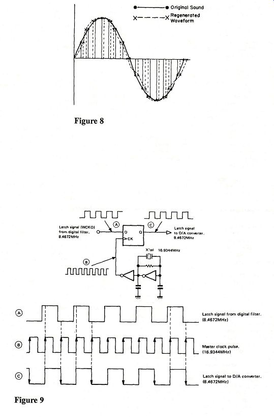 ----- Figure 10; Figure 11 [...] [Papoulis 1980]. Coefficient modification routines are well-known and give good results. Wadia, Krell, and Theta claim that the method used by the monolithic chip manufacturers is less than ideal. In the case of the Theta, the coefficients are also adapted, depending on signal conditions. The Wadia and the Krell perform the interpolation function directly in the time domain rather than the frequency domain. As none of these companies have published their current algorithms in the open literature, it is impossible to assess their methods. Wadia has published information on an earlier time-domain algorithm using Lagrangian interpolation [Moses 1987]. The performance criterion for a digital filter that performs interpolation and smoothing is the Mean Square Estimation Error (MSEE) [Papoulis 1984]. None of the manufacturers have published any data showing that their filters have a lower MSEE than a low-cost monolithic filter. [Touché!- Ed.] Time-domain interpolation algorithms have the major disadvantage of not rejecting the out-of-band spurious signals with as great attenuation as a FIR filter [Cezanne 1988]. Martin Colloms has found this problem in his measurements of the Wadia 1000 and the Krell units [Colloms 1989], [Colloms 1990]. The Wadia sales literature points out that the digital impulse response of the Wadia system rings less than a standard digital brick-wall filter. The amount of ringing in the impulse response is directly related by the Fourier transform to the stopband rejection of the filter. The lack of ringing in the tails of the digital impulse response curve for the Wadia system is a direct result of the poor stopband rejection. The sampling theorem requires that the signal at the input of an analog-to digital converter must be bandlimited to one half the sampling frequency. An analog or digital brick-wall filter must be included in the digital tape recorder to satisfy the sampling theorem. Thus, the impulse response of a complete digital audio system (analog in to analog out) will be that of a brick-wall filter regard less of the response of the playback system to a digitally generated unit impulse. [Touché again.-Ed.] Martin Colloms also found that the frequency response of the Wadia 1000 and the Krell units was down by 3dB at 20 kHz. This indicates that the Wadia and Krell algorithms have not been optimized for maximum pass band flatness. In a recent piece of promotional literature, Wadia implies that the results of the sampling theorem cannot be applied to music signals. They argue that in the derivation of the sampling theorem the Fourier series is used. They claim the Fourier series cannot be used to represent the stochastic music signals. This statement is completely false. It has been shown that the sampling theorem is equally valid for bandlimited random signals [Papoulis 1984]. One hopes that the Wadia copywriters misunderstood the Wadia engineers. Wadia has implemented the glue circuitry in a programmable gate array manufactured by Xilinx. The interconnection of the circuitry is controlled by software programmed into a programmable ROM (PROM). The circuitry for the SPDIF de coder (see below) is also implemented in the programmable gate array. Wadia can thus correct errors or upgrade the circuit configuration of the decoder box by changing the code in the PROM. Phase Jitter and SPDIF A sampled data system's performance is critically dependent on the accuracy of the sampling time interval. Variation in the absolute timing of successive spacings is called phase jitter (or Jitter). A sampled sine wave signal corrupted with phase jitter will, when examined on a spectrum analyzer, appear as a narrow Gaussian-shaped band of signals. The resulting signal spectrum is very similar to that of an analog signal reproduced from a turntable or tape deck with flutter. The effect of jitter on the time domain plot of a sine wave is shown in Figure 8. The crystal oscillator which generates the clock signal is generally jitter-free. Time-base jitter can arise if the power supply signals to the crystal oscillator become noisy. Kenwood proposes that clock noise induced by the CD tracking system gives rise to time-base jitter. According to Kenwood, this explains the claim that CD rings and disc stabilizers change the sound of a CD. The obvious solution is to ensure that the supply to the crystal oscillator is well-regulated. A problem is that the crystal oscillator circuit is often incorporated in the digital filter IC. Noise on internal chip power supply lines cannot be removed. The solution to this problem is to build the crystal oscillator as a separate circuit and drive the digital filter with the output of this circuit. This approach is used by Stax, Sony, and CAL, among others. Another source of time base jitter occurs when the crystal oscillator signal is divided down to the word rate of the DAC in the digital filter chip. The source of the jitter is again power supply noise. Resyncing (realigning) the edges of the clock waveform at the out put of the digital filter with the master clock will reduce this timing jitter mechanism. Sony, in its CDP-508/608/X7ESD players, performs the resyncing with a custom IC, the CXD8003. Kenwood uses a similar chip called DPAC (Digital Pulse Axis Control) in its DP-8010 player. The basic DPAC circuit is shown in Figure 9. The system in Figure 9 al lows the latch signal to the DAC to change only on the rising edge of the master clock. The practical implementation of the DPAC circuit is significantly more complex than the circuit shown in Figure 9. JVC has found [JVC 1989] that additional sources of jitter include noise