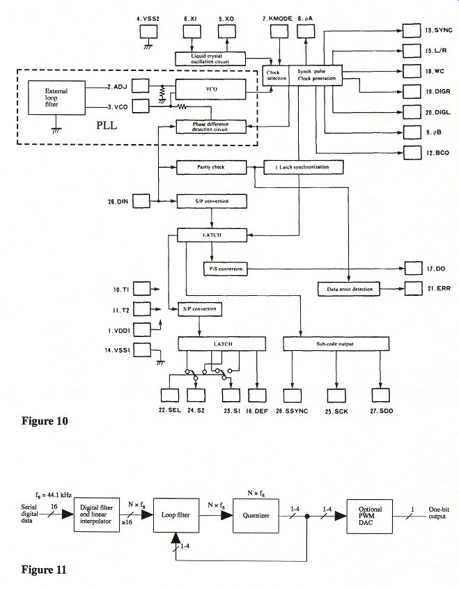[8] Staggered configuration with 2 DACs per channel provides 2x increase in conversion rate. [9] External adaptive PLL filter is used. Crystal oscillator is stopped when phase lock is achieved. [10] Bit shifting circuit is used after the DACs.