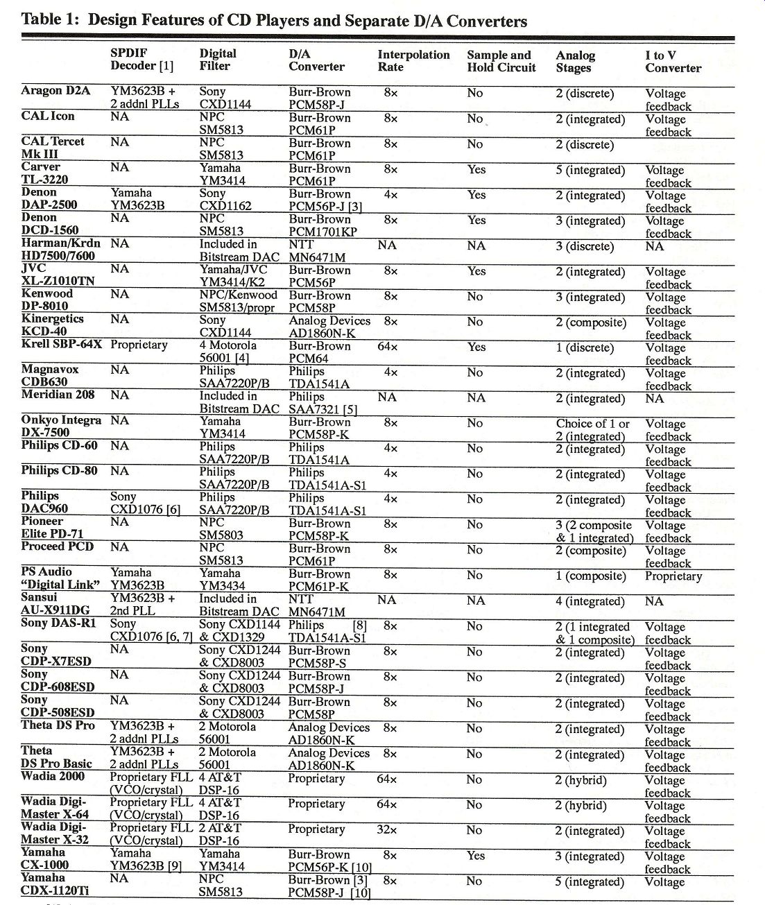 Table 1: Design Features of CD Players and Separate D/A Converters SPDIF Digital D/A Interpolation Sample and Analog ItoV Decoder [1] Filter Converter Rate Hold Circuit Stages Converter [1] Applicable only to outboard con verter boxes and digital preamplifiers. [2] Total number of regulators in unit (outboard converters naturally require a smaller number than complete CD players [4] General-purpose DSP (digital sig or digital preamplifiers). nal processor) with custom software. [3] Balanced operation with 2 DACs [5] A proprietary configuration allows per channel. one SAA7321 to be used in each channel. ------ (Blank space signifies unavailable data. See review section for successor models, if any. ) [6] Only the PLL phase detector is integrated on this chip. [7] Clock signal is internally generated when used with Sony CDP-R1 transport.
