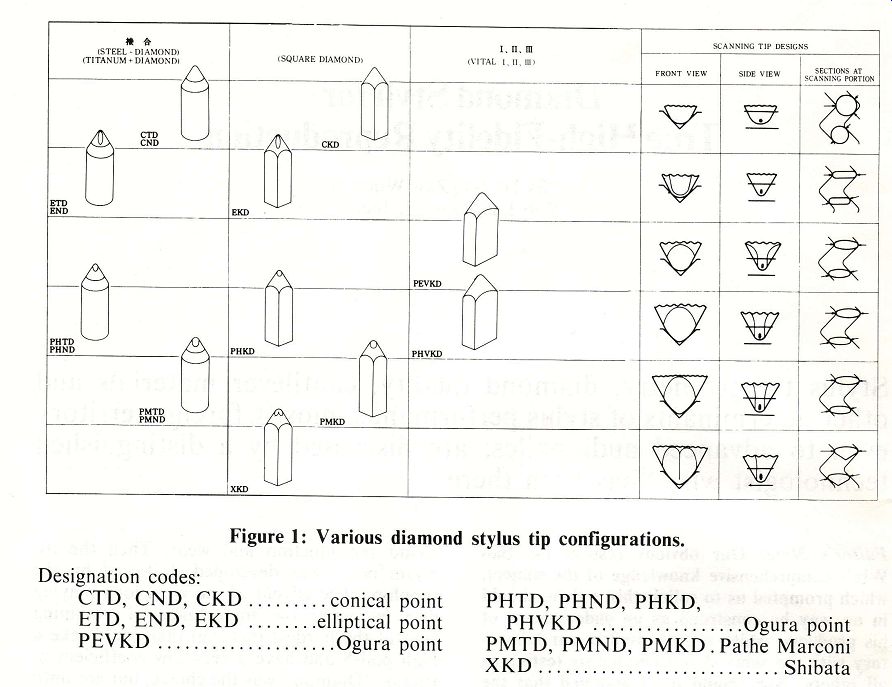 Diamond Styli for True High-Fidelity ReproductionBy Dr. Sao Zaw Win, Win Laboratories, Inc. Stylus tip geometry, diamond quality, cantilever materials and other determinants of stylus performance, mostly foreign territory even to advanced audiophiles, are discussed by a distinguished technologist who “has been there.” Editor's Note: Our obvious respect for Sao Win's comprehensive knowledge of the subject, which prompted us to solicit this article, should in no way be construed as an endorsement of his products, which are received in our laboratory with the same skepticism before testing as all others. Nor should it be assumed that the main thrust of our phone playback investigations is necessarily identical to his; he makes no reference here, for example, to the largely quantum mechanical model of the stylus/groove interface as perceived by researchers such as James V. White, Mitchell A. Cotter and the Teldec group, the purely practical consequences of which appear to be confirmed by our experience. (See also the seminar transcript in this issue.) His basic facts, in any event, speak for themselves. Despite numerous improvements over the years in mechanical and electronic equipment for the playback of phonograph discs, the sound produced still depends firstly on the pickup head and the stylus itself. Therefore, the physical properties of the stylus and the precision with which it is manufactured are of great importance. For many years, the steel needle satisfied most requirements but suffered from disadvantages from the point of view of quality sound reproduction and wear. Then the osmium point was developed, followed by the sapphire. The advent of the vinyl long-playing disc increased the importance of obtaining styli of the hardest material that could take a high polish and have a very low coefficient of friction. Diamond was the choice, but not until 1955 could diamond styli be manufactured commercially on a significant scale. The theory of stylus design. Most performance deficiencies for the re production of discs arise because of the differences in action and nature between the cutting and reproducing styli. It has been more than a decade since low-mass diamond styli first came into practical use for sound reproduction, and while the demand for both spherical and elliptical styli has greatly increased, further improvements have been made both in stylus shape design and production. It is necessary to establish the reasons and understand why these improvements in stylus shape were introduced and why the aforesaid two types of stylus profile have poor potential performance. First, the spherical stylus. It is so named because its basic conical shape is rounded at the tip into a spherical form. The radius of this spherical region is critical because the stylus must fit the groove walls perfectly. (See Figure -------- ![]() Figure 1: Various diamond stylus tip configurations. Designation codes: CTE ONY, EKD 5.6, conical point PHTD, PHND,”PHKD, ETD, END, EKD ........ elliptical point FEPIRERST, O55 00 es Ogura point PENYRI) I., ans suns sates ia Ogura point PMTD, PMND, PMKD . Pathe Marconi BE i thane nmin sings won ams Shibata ![]() Figure 2: Orientation of cube, octahedron and rod; Figure 3: Orientation of cube, octahedron and rod, as seen normal to cube plane. ----------- 1, styli CTD, CND and CKD.) As can be seen, if the radius is too large, the stylus will ride along the top of the groove; if it is too small, the stylus will bottom in the groove. In either case, mistracking will occur; in addition, a bottoming stylus will become fouled with dust dug out from the normally untouched bottom of the groove, thereby increasing noise and distortion. Out of this critical fit two main problems arise: one is tracing distortion and the resultant pinch effect; the second is inner-groove distortion. Tracing distortion occurs because of the way the distance between the groove walls varies with changes in the direction of the groove. This is the result of the flat chisel shape of the cutting stylus; when the deviation from nominal is considerable, the reproducing stylus is forced vertically upwards. Since a stereophonic pickup head is sensitive to vertical stylus motion, this movement due to what is normally called “pinch effect” causes distortion. Inner-groove distortion is also directly linked to the nature of the spherically shaped tip. The outer grooves on the disc are longer than the ones closer to the center, so that the distance covered by the stylus in one revolution at the beginning of the record is far greater than toward the end. To produce modulations of a given frequency on any part of the disc, the cutting stylus must vibrate at a constant rate. However, near the center of the disc there is less space to accommodate the same rate of vibration and, as a result, high-frequency modulations in the inner grooves become so cramped that their radius of curvature may sometimes be smaller than the spherical tip radius. Therefore the stylus will no longer remain in contact with the groove walls and distortion is generated. In order to eliminate the problem, a play back stylus as similar as possible to the cutting stylus was developed. This was the elliptical stylus (Figure 1, styli ETD, END and EKD). With its longer axis across the groove, it is far less susceptible to the problems of pinch effect, and the smaller ends are able to trace the tiny modulations at the inner grooves. There is a serious problem, however: because of the small contact area with the groove wall, the elliptical profile exerts greater pressure on the grooves and can cause damage. (But see also the discussion of contact area and vertical tracking force in the seminar transcript. -Ed.) Here 'effective tip mass'-which is a combination of various factors such as the mass of the stylus, the mass of the cantilever, and the Young's modulus of the cantilever- plays an important part. Technically we can assume that weight 