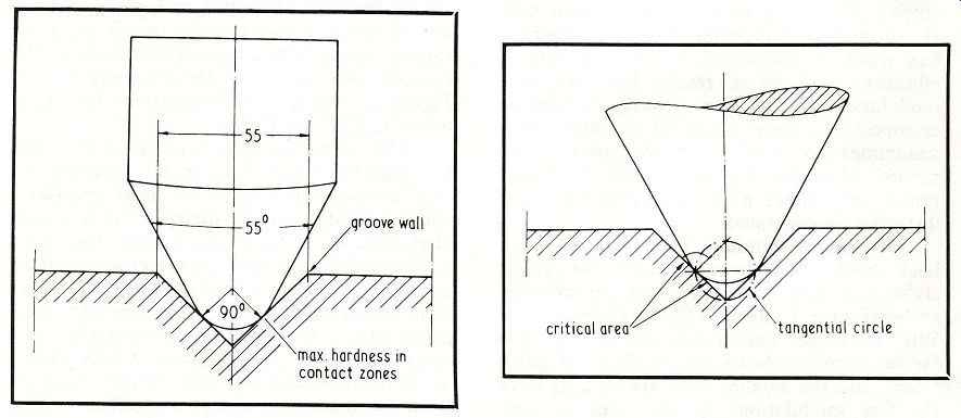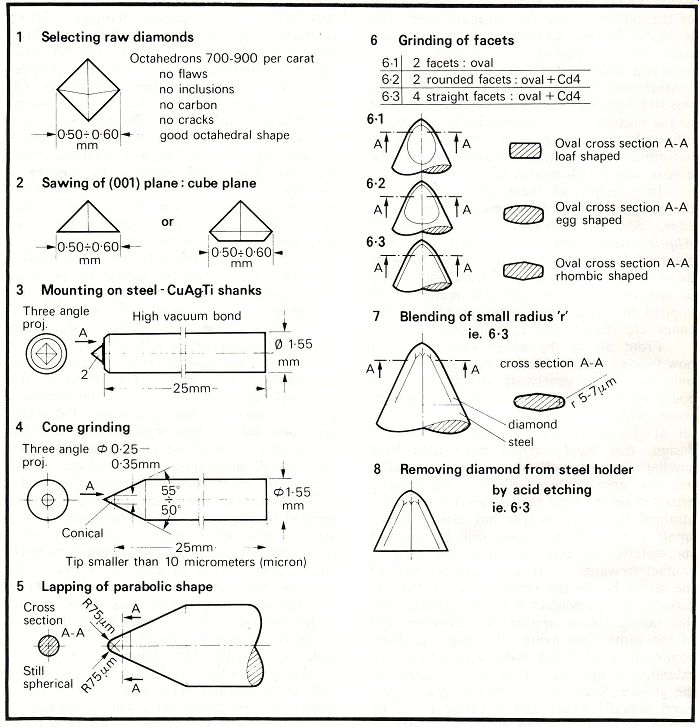 Figure 5: Stylus in correct orientation with respect to groove walls. Figure 8: The tangential area of the stylus in relation to the groove wall. -------------- Figure 1 also shows a Shibata stylus patented by the Victor Company of Japan (see stylus XKD). The shape is very close to that of the cutting stylus; the parabolic front side is created by two facets intersecting a polished cone, and the blending in of the sharp corners creates a small uniform radius over the whole contact area. But, the major radius being large, this stylus profile extends too dangerously close to the bottom of the groove; hence the possibility of mistracking as a result of the tip bottoming and getting pinched out of the groove under high modulation. In principle, all these cuts-the Shibata, the Bang & Olufsen Pramanik, Ortofon's Fine Line, Shure's Hyperelliptical and ADC's Aliptic-stem from the tip shape that was patented for Pathe Marconi in 1954, the only differences being that, to create this shape in the contact area, different methods are applied by using flat facets, rounded facets, cones, etc. (See Figure 1, stylus PMKD.) From all of the above explanations it now follows that an ideal version of the stylus must be cut or generated without facets. It could be described as an intersection of two cones with blended corners. While close to all of the above styli in configuration and design, this ideal version must also have smaller contact radii of 50 microns and 6 microns, ensuring not only that the contact area will be extended beyond what is normally attained by other designs but also that the small groove modulations will be tracked successfully. By also extending the area of contact upwards, so that the greater part of the stylus below the nominal disc surface is actually in full contact with the groove wall, this configuration applies less pressure and at the same time avoids the major problem common to all CD-4 styli, which have tips extending dangerously close to the bottom of the groove. Such an ideal stylus tip configuration actually exists and is called Paroc by Weinz of Germany and Vital by Ogura of Japan. This type of cut has only one disadvantage: since the oval cross section cannot be detected under low magnification in a microscope such as is needed to handle the stylus, mounting on the cantilever becomes very expensive and difficult. Special provisions and tooling have to be made. Diamond selection and fabrication. Diamond styli are produced in three different qualities, which depend upon the size and nature of the natural diamonds. Three diamond sizes are used: (1) well-formed, flaw less octahedrons; (2) small, 500-per-carat stones selected from grit; and for the cheapest styli (3) tiny, 1000-per-carat diamonds. (A carat is a unit of weight for precious stones equal to 200 milligrams.) The highest-quality styli are manufactured from octahedrons whose size depends upon the length of the stylus shank required. The initial stage is to prepare a rectangular rod of diamond from an octahedron. The orientation of the rod to the crystal symmetry is of extreme importance. The long axis of the rod must be within 3° of the cube axis, as seen in Figure 2, and the flat sides of the rod must be parallel to the octahedral edge (i.e., the 45° plane joining the two cube axes), as indicated in Figure 3. Square-section blanks are produced in sizes ranging from 0.14 x 0.14 mm cross section by 0.50 mm length, up to 6 x 6 mm cross section by 8 mm length. The larger blanks are produced by sawing a rectangular rod from a well-formed, flawless octahedron. The starting point for the best styli consists of extra fine-quality selected natural crystals of size 100 to 400 per carat, with no chips, flaws, carbon or other inclusions. (See Figure 4.) Orientation of the longitudinal axis is normally parallel to one main axis of the diamond crystal, in other words from 4 point to 4 point or in the (001) plane in crystallographic terms. The orientation can be done by means of X rays; however, on the smallest stones of about 0.2 mm diameter, the process takes several hours because of the low mass of the diamond to be penetrated by the X-rays and the low reflection density. This expensive orientation process ensures that the 4 point of the diamond will be well within the radius and that the 2 point (i.e., the 2-fold axis) will be normal to the groove wall when the record is played, thus presenting the hardest and most wear resistant section to make contact. (See Figure 5.) The orientation of the 500-per-carat size is less easy, as these stones are so small that they cannot be processed into rods. Some orientation can be obtained, but it is not al ways possible to arrange that the point of the tip will be within 3° of the cube axis. The smallest crystals (1000 per carat), used in the cheapest styli, are simply tumbled to a usable size; since orientation is impossible, it is a matter of chance whether the hardest part of the tip will be in contact with the groove walls. ------------------