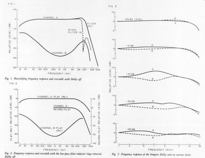 Incidentally, Bob Tucker, TAA 's national advertising representative, distributes the Integrex in the USA. I think our mutual relationship to this magazine has not biased my view. CONSTRUCTION Most of the components, including switches and front panel controls, are mounted on a large circuit board. A small circuit board soldered to the top of the switches provides additional switch interconnection and mounting for level presets. Pre-tuned inductors and associated capacitors for the 19kHz notch filter arrive already soldered to the main board, on which component locations are well marked. The Dolby processors are the LM1011A IC's. No IC sockets are pro vided, so make sure you correctly orient the microcircuits before soldering. The electronic components appear representative of consumer-grade equipment; however, Integrex provide close tolerance resistors and capacitors where needed. Constructing the simultaneous encode/decode version involves cutting six traces on the small PC board and adding six jumper wires. It is easier to do this before you install the board, rather than afterwards as the instructions recommend. I question cutting traces as a construction technique; jumpers could be used for both versions to avoid the danger of someone stabbing himself in the process. Mechanical assembly is straightforward. The meters and power switch are mounted to a bracket attached to the chassis. The chassis is rather a strange bird. It has welded corners and pre attached nut inserts for securing the circuit board, but is made of almost flimsy aluminum and has no metal top. An aluminum shield does cover the power section and a nicely finished mahogany cabinet encloses the whole thing. The lack of shielding may increase susceptibility to RFI (this is just a supposition, since I haven't noticed any problems and am not equipped for RFI testing). You have to provide a piece of g p p cardboard to insulate the circuit board from the chassis. Aligning the front panel is a matter of trial and error. While not providing step-by-step details, the instructions contain sufficient information to correctly assemble the kit. People with some kit building experience should be able to cope if they are careful. Check cut the Audio articles if you have doubts about your ability. The power wiring diagram erroneously shows the transformer secondary leads running directly across to the terminal strip. They should run straight forward to the meter bracket and then over to the terminal strip to clear the shield over the power wiring. The text gives correct instructions. Integrex say they will clarify the instructions in this area. A couple of points should be re emphasized. Verify that the main switch assembly works properly before installation. It looks almost impossible to ex tract the switches from the PC board sandwich without damage. Make sure the big switch assembly is parallel to the large circuit board before soldering: part of the interlock mechanism prevents one corner from seating flush against the board, so you should raise the other corners an equal amount. The transistors have an unfamiliar shape. Note that the lead diagram is a bottom view. Construction should take about 10 hours. After I corrected a couple of problems of my own making, alignment proceed ed without a hitch. Alignment is limited to adjusting meter amplifier gain and calibration tone levels: you need no external test equipment. Integrex supply no troubleshooting instructions should you encounter difficulty, but they have arranged for a service facility to make repairs at reasonable cost. MEASUREMENTS At first hearing I thought the Integrex noise reducer added harshness and brightness to the sound. Tests revealed a rising frequency response at the high end of the audible range (Fig. I). I tam ed the brightness by removing the slugs from the low-pass filter inductors (L1, L101, L201, and L301), which creates a slight rolloff in the upper audible frequencies and reduces filtering action in the supersonic range (Fig. 2). Fig. 1 also shows the effect of the 19kHz filter. I measured frequency response and crosstalk at the main output using the Aux input for the record/play curves and the tape input for play only. Integrex were not able to reproduce the 1.1dB rise at 12kHz shown in the record/play response of my unit. They do not recommend removal of the inductor slugs because excessive tape recorder bias leakage or other ultrasonic signals can upset the Dolby tracking. I agree that the slugs should not be removed when recording unless your recorder is known to have effective bias traps. Integrex suggest the high frequency rise in the record processor can be reduced considerably by shunting R, and Ros with a 100k -ohm resistor in series with a 1000pF capacitor. Square wave performance at mid and reasonably well behaved. With the inductor slugs install ed there is a half cycle high frequency peak (see Fig. 6).Removing the slugs considerably reduces the peak. Switching in the 19kHz filter produces some ringing at 19kHz. Low frequency square waves show considerable phase shift reflecting the low frequency rolloff. Separation, at a given frequency, is the difference between the frequency response (channel A) curve and the crosstalk (channel B) curve. The maximum separation falls several decibels short of Integrex's typical specification. ![]() TABLE 1 Noise Level Chan. A Condition Chan. (dB below Dolby level) Integrex attributes the low frequency interchannel coupling to the common use of Cz and Cis in the encode decode processors. I conducted the remaining instrument and listening tests with the low-pass filter slugs removed. The record/play frequency response with Dolby encoding/decoding is shown in Fig. 3 as a function of output level. Tracking differences between the Dolby processors produce significant variations in frequency response. No adjustments are provided for trimming the ''companding law." Variations in the ICs apparently cause the mistr