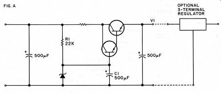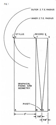 PHONOGRAPH ARM GEOMETRY: A GRAPHICAL METHOD THE TURNTABLE/ARM COMBINATION is the most ill-treated link in the usual playback system's chain of components. I hope this short article will prod you into some fresh thoughts on the subject. I am concerned here with conventional pivoted arms of various lengths assumed to be rigidly mounted to a heavy motor board which also rigidly mounts a spinning platter. Three resilient supports suspend the heavy motor board for a soft ride in an environment not unlike an earthquake. Most discussions of pivoted arms involve accurate measurement of angles in degrees and minutes. I shall mention no angles at all; instead, I shall define some specific dimensions and use them in an easily drawn rectangular chart (Fig. 1). Draw the chart full scale on 1/16" poster board or the equivalent. ![]() A stylus travels across a record in a shallow arc. Should the arm attached to the stylus be of infinite length, this arc would approach a straight line. Since we want to build a real arm, not a theoretical one, we must select something under 3 feet for this length. The straight line is the ideal. Our arc should cross this line at two points of zero tracking error ZTE. Outside these points, the tracking error is in one direction; between them it is in the opposite direction. The inner groove error is negligible. This is superior to the usual procedure of establishing only one ZTE circle at the innermost groove and letting the error increase all in one direction toward the outer groove. A typical LP record has the inner groove at 2 3/ 8" radius, the outer groove at 5 5/8" radius. My two ZTE points are at 3" and 4 3 /4" radii. The stylus of Fig. 1 is at point E in line with line AE. Point F is the record center. Therefore EF = AB = 3". FG equals the distance between our two ZTE radii, or 4 3/4" - 3" = 1 3 /4". Point C is our arm's pivot point. Since lines BC and CD are equal to each other and line BD and FG are also equal, then lines CF and CG must be equal forming an isosceles triangle FGC. With the pivot at C, as stylus E traverses the record you will note that line EG will always cross the record center. True EG will deviate slightly in either direction as it traverses, but with a 16" or longer arm the deviation is small indeed. Moving across Fig.1's record radii from E on the inner ZTE radius to the outer ZTE radius, point G assumes the center of turntable position perfectly for another ZTE position. You may well ask, where is the arm on all of these lines? This decision is up to the builder. The arm may be straight, S-shaped, or any shape to connect pivot C to stylus E, with one qualification: the vertical movement of the arm must always swing on pivots on a line parallel to line AD. This point was missed by four arm builders known to me-in other words it is an easily overlooked but important point. Do not goof here or your cartridge will roll on its AE axis with any vertical movement, thus destroying the Westrex 45/45 tracking. Another natural question is, how long is line AE? An reasonable length the builder wises to select, with no need to change the rest of our chart at all. AE is a freely chosen variable. When installing your completed arm, use a plastic drafting triangle lined up with axis AE and EG. mark point F on the triangle and locate the arm with this mark exactly over the center of the turntable. This may sound a bit tricky, but don't worry about it: it's a snap. While the triangle is thus located, traverse the arm and note how small the error is. Line EG will stay almost over the center of the turntable spindle. Be careful with the stylus during assembly and alignment; perhaps you should place a guard or other protective device over it. By using this simple graphical layout method, you will be able to build a low-tracking-error arm. I feel this is a basic improvement in a heretofore neglected area of the total audio system. BOB GOODMAN; Livingston, TX 77351 SLOWING PLOPS TURN-ON/TURN-OFF transients are a common problem encountered in both home-built and commercial audio equipment as one result of the almost universal acceptance of op amp circuitry. Although turn-on/off boxes will work as they are intended ( see Walt Jung's article, "The Speaker Saver"-TAA, 3/77, p. 4--or Robert Borden's Audio Aid, ''A Turn On/Turn-Off/Warmup Transient Eliminator--TAA, 1/78, p. 45), they will not help when an additional unit is turned on or off. The following solution is both simple and effective. Each offending piece of equipment may benefit from these changes. To eliminate turn-on transients in low level units, preamps, equalizers, etc., modify the power supply so it turns on slowly enough to be inaudible. Fig. A shows a slow turn-on supply: the time constant of R1 C1 controls V1 's rate of increase during turn-on. If you want better regulation, this circuit will turn on a three-terminal regulator just as slowly. Vary R,/C, to meet your needs: R, may be much larger and C, smaller. You can achieve quick turn-off by changing the power switch to a 3PDT as shown in Fig. B. MARK. C. SHULTS; Madison, WI 53711 ![]() ![]() DIODE DIMENSIONS FOR PEOPLE LOOKING to reduce noise, I suggest the use of higher rated diodes. This applies to signal, rectifiers, and zeners. I recommend subbing 1 amp for 1/4 amp, and 3 amp for 1 amp. For zeners, I use 1 watt for 1/4 watt, and 5 watt for 1 watt. You might consider this overkill, however, in some cases the improvement can be dramatic, not to mention the resulting increased stability. [The Jung-White exploration of the PAT-5/WJ-1A (3/79) report similar findings. -Ed. ] JOHN GRANFELDT Tualatin, OR 97062 --------------------- VERY FREE SUBSCRIPTIONS Why pay out money for a subscription to this rather expensive journal when you can earn money writing for it instead? Offset the high cost of TAA by writing up those nice shortcuts, circuits, modifications, tips, techniques, and good ideas that your fellow readers would deeply appreciate hearing about