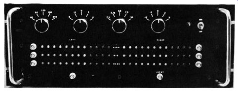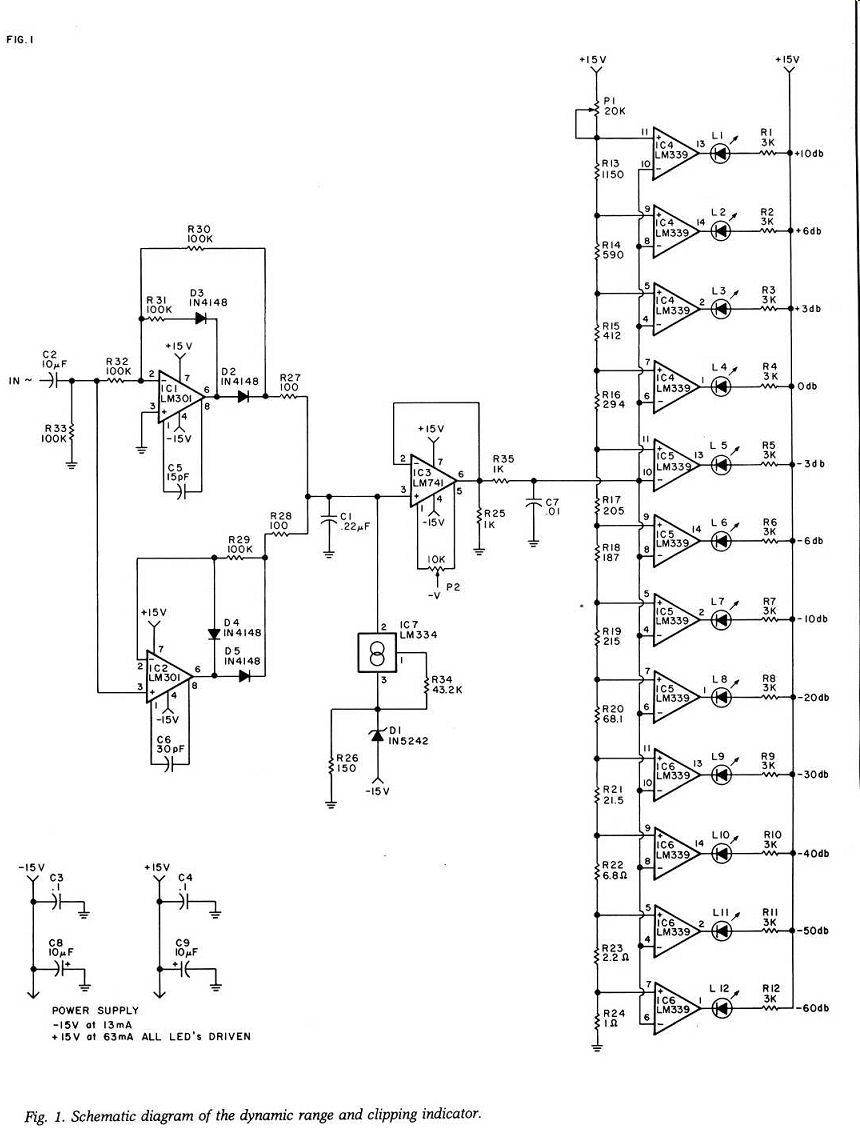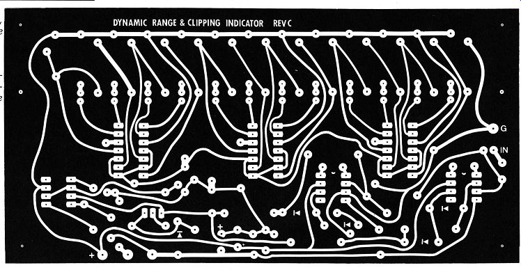 Fig. 2. Top, full sized negative of the etched circuit card the indicator. ------- ![]() Fig. 1 ... but they also allow you to measure surface noise on records and tape hiss. The - 6dB and - 3dB LEDs tell you when you are close to clipping. The + 3and + 6dB levels are valuable to tape recordists, while the + 10dB level is useful for measuring output and distortion ahead of the power amps. If you decide to change the voltage divider values be sure to take leakage currents and turn-on points into consideration. The display block consists of the 12 LEDs and their current limiting resistors, R1 - 12 . I set their value at 3k to minimize current requirements. Six boards monitor the inputs to my six amplifier channels. If I were using 20mA in each I would need a 1.5 amp supply. A 3k resistor will allow 4.3mA of current through the LED, as the LED has a forward voltage drop of about 2V. Do not use a resistor of less than 650Ohm for current limiting. Increasing the current in the LED only seems to increase the brightness off-axis. I chose green LEDs for -60dB to -6dB, yellow for -3dB, and red for 0dB to -10-dB. The power supply block consists of capacitors C3 , 4 , 8 , and 9 . C3 and C4 are 0.1uF disc for high frequency bypass while C8 and C9 are high quality tantalums to eliminate the LM339 turn on oscillations which make IC3 to run rail to rail and cause a 1MHz power supply oscillation. ASSEMBLY AND SET UP Assembling the unit is straight forward. Refer to Fig. 4 for component layout, pinouts, and orientations. I laid out the board so you can use 1 /4 or 1 /2 watt resistors in most places and .3" or .4" capacitors. If you wish, you can, use vector board to space your LEDs out from the board and use the same holes to mount the unit to a front panel (see Fig. 00). The board also has mounting holes top and bottom to allow LED orientation in either direction into a panel. The board is single-sided to keep costs down and yet maintain simplicity and performance. Maximum power supply requirements are 13mA @ -15VDC and 63mA @ + 15VDC. I strongly recommend using a separate supply for this indicator to avoid signal supply modulation. Please note the current requirements are for one channel only. The power supply in the Jung White PAT-5 modification is excellent for this use (see TAA 1/78, p. 7). Whatever you use, it should be fairly well regulated. Set up and adjust are also simple and straight-forward. Connect an AC signal generator to the input terminals, set it to 1kHz, connect a sensitive AC VTVM and adjust the signal generator to the 0-dB input of your power amplifier. Most power amps need 1.5VRMS to drive them to full output, although some go as low as 0.75VRMS and as high as 2.25VRMS. Turn pot P1 in the correct direction until the 0-dB LED stops flickering (i.e., just barely on). You will see flashes as the noise reaches the 0-dB point. You'll be surprised how much of the time you clip. Reset the signal generator to -60dB (i.e., 0-dB level divided by 1000). This is the critical and difficult part of the adjustment. Adjust Pot P2 until the -60dB LED goes out. Change directions, turning the pot until the -60dB LED flickers on. On one of the nine boards I built, one of the 301s had such high output voltage (due to offset bias) I could not null it out. Replacing the 301 cured this problem. On another board the - 60, - 50, and - 40dB LEDs all used to light up at the same time: swapping 339s cured this problem, and I added several bypass capacitors so you should have no trouble. I mention it, however, to prevent some poor reader from pulling out his hair trying to correct it. Repeat the adjustments to tweak the board into perfect adjustment. CAVEATS AND COMMENTS A few caveats about using the unit. If ... ----------- PARTS LIST: DYNAMIC RANGE AND CLIPPING INDICATOR ![]() ------------------------------ ![]() Fig. 6. Inside view of the author's unit which combines two three-way electronic crossovers with ±6dB adjustable gain adapted from Walt Jung's versatile 30Hz filter (TAA, 4/75, p. 14), and modified Old Colony crossovers, a Jung ±15V power supply (TAA, 4/74, p. 14), a PAT 51WJ-IA power supply (TAA, 3, 79, p. 24), and six dynamic range/clipping indicators. The six monitor the outputs of the two three-way crossovers. The Jung power supply feeds the six indicator circuits while the PAT-5/WJ-1A supply powers the crossovers and a pair of30Hz high pass filters. ... your preamp does not have a sub sonic rumble filter be sure to use one; otherwise you will measure the warp output of your cartridge-arm combination instead of the dynamic range of your records. The Jung 30Hz filter ( TAA 4/75, p. 14) is excellent. An easy way to determine whether you need a filter is to look at the output of a warped record between cuts. The extended high frequency response will allow you to measure CD-4 carrier leakage and tape recorder bias leakage during rewind if you have these components in your system. This readout should also show if your system is oscillating anywhere. If you use "surplus" LED's from other than the listed sources you may get a great variation in brightness. In such a case, it may be necessary to ...