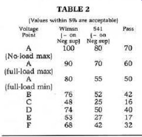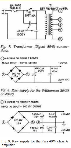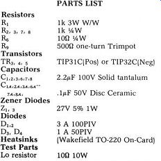 Fig. 6. Negative regulator schematic. AMPLIFIER PROTECTION The regulator protection circuits can also protect the output transistors in the amplifier if you choose the cur rent limit correctly. The TIP 35 and 36 transistors which Old Colony offer for the Williamson amp are rated at 25 amps and 90 watts. Into an output short, with a 68 volt supply, each transistor will see a half-cycle of 32 volts at L (the regulator short circuited current). The RMS dissipation will thus be 16 x 1 sc (which is about an amp for the 4-amp option), or about 16 watts. The full load cur rent of 4 amps is thus only available for sine wave signals which draw less than 4 amps peak. As the 40/40 features its own internal current limit, which would presumably act before the 4 amp sup ply limit was reached, the supply's protection is a backup. The supply's thermal protection still extends to the amplifier if the heatsinks are chosen correctly, however. I discuss the correct values below under Construction Details. Although the 4 amp supply has a transient capability of nearly 6 amps, a pair of 40 watt stereo amplifiers ... Table 1 ![]() ... could potentially draw peak currents of 8 amps. If you intend to power both channels of your amp from a single supply, you must provide for these peaks. Using the values of R4, R5 , TR1 , and TRZ from the Pass con figuration (Fig. 5 and the parts list), we can provide up to 10 amps. Note the value of Isc goes up to about 2 amps with the higher power option, and the foldback point is also much higher; the regulator thus does not af ford the same degree of protection as if a supply were provided for each channel. For the 80W 541 supply, we provide a 12A transient peak, or 8A Parts List ![]() POWERING WILLIAMSON'S 40/40 AMP: CAPACITOR MULTIPLIER VS. REGULATOR WHAT CHANGES CAN WE EXPECT in performance on a 40/40 if we add Reg's capacitance multiplier to the raw supply? What additional benefits are to be gained with a fully regulated supply? The table below details the results, on my own test bench, using the three options available. The capacitance multiplier adds significant filtering, which reduces the noise level at idle. This circuit also provides decoupling, which helps to reduce intermodulation distortion at high levels. In fact, the distortion performance of the fully regulated version is only slightly better than the capacitance multiplier. The full-load power capability of the regulator is much higher, however. This reflects its ability to deliver 4 amperes RMS at 68 volts. The capacitance multiplier supply had dropped to 56V at full load, which was only 2.2A RMS into 8 ohms. Into 4 ohms, the regulator was current limited at 4.5A RMS, while the capacitance-multiplier sank to 48V and 3.5A RMS. These changes result in the figures below: ![]() ![]() Fig. 9. Raw supply for the Pass 40W class A amplifier. Table 2 ![]() RMS, at ±40V. Construction details for this version of the supply will ac company the power amp construction article. The ±32 volt supplies shown for the Pass amp are optimized for the demands for the class A amp. With the recommended resistors and heat sinks, the Pass configuration will pro vide 15 amps for a fraction of a second (transient peaks), dropping to about 10 amps after a second or so. The regulator thus allows for electrostatic or other reactive loads while providing protection from substantial high-power damage. This circuit's operation depends on thermal capacitance in various components, and thus the wattage rating of R, and R5 is important to correct operation ( see box on Thermal Capacitance, below). CONSTRUCTING THE RAW SUPPLY The raw supply feeding the regulator can be any DC supply which gives the desired full-load current and stays within the input voltage limits of Figs. 5 and 6. I think the raw supply described in Pass's article is an admirable choice. We will use a slightly different arrangement than that shown in his article, however, as we must provide a margin to allow regulation and also allow for low line voltage, component variation, and other variables. Connect the secondaries as shown in Fig. 7. If the voltage across the transformer is close to zero, reverse the secondary connections; you should get about 90VAC. To develop the raw supply of 90VDC for the 68V supply, we need about 66VAC, which we obtain from the signal 88-8 as shown in Fig. 7. Fig. 8 shows one sup ply arrangement. Note that the ripple rejection of the regulator is in excess of 120dB; thus a large ripple voltage can be tolerated as long as the minimum voltage exceeds the minimum input shown in Figs. 5 and 6. The 88VCT available using the juncture of the secondaries as a centertap is about right to provide the 60VDC no-load, 50VDC full-load capability we need for the Pass sup ply. For this application, use the con figuration of Fig. 9. SELECTING COMPONENTS Most parts for the supply are the same no matter what voltage and cur rent you desire; Fig. 6, the negative supply, shows values for a negative bi-polar supply, as required for the Pass amplifier. As shown in the construction details, the board is designed to be mounted right on the heatsink. This will keep the lead lengths to a minimum, which is important to improve transient response. Arrange things so the regulator is mounted quite close to the transistor TR2, so good thermal conduction occurs; this will ensure that the regulator can protect the transistor from overheating. ![]() TESTING THE SUPPLY Test each section of the supply before going on to the next section. The pre regulator section is really a completely independent regulator, with fairly good characteristics. If it tests out, we know the zener references Z, and Z2 and the IC overvoltage protection circuits are working correctly. Next we verify the IC voltage. We then test the IC foldback current limit. The final test is a "go/no-go" test of the complete regulator. To test the pre-regulator, mount all the components except TR2 and IC,. With voltage app