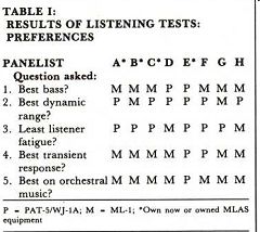 | A SUBJECTIVE LISTENING TEST OF THE PAT-5/WJ-1A by LAURENCE L. GREENHILL, M.D. WALTER JUNG AND DAVE WHITE have published extensive modifications to the Dynaco PAT-5 preamplifier in past issues of The Audio Amateur (1/78, p. 7; 3/79, p. 24). They designed these modifications in two stages: the first emerged from instrumental measures involving both static and dynamic testing, while the most recent changes in circuit design used "ears as arbiters." Specifically, the modifications included major circuit alterations which were a quantum leap beyond the component part changes offered by mail-order stereo equipment up-graders. The "Level 1" modifications produced two new phono cards, a new +/- 15 volt regulated power supply, and extensive alterations to the PC-34 high level cards, as well as the addition of a good rumble filter. (Old Colony Sound supplied parts for this Level I modification $97.50.) The Level II mods advanced the phono preamp to a servo-controlled, direct coupled design with a tightly regulated, wide band power supply, new balance and volume controls, and a "straight-line" function option to have only one switch in the total phono path. (The Level I and II mods cost $240, including the servo control from Old Colony.) The authors made a few subjective auditory claims for this latest design in comparison to the old PAT-5/WJ-1: Transients become more life-like and prominent, with an increased and much more natural dynamic range. Localization and separation of instruments is much more detail ed and stable, with the result that some recordings sound like parallel mono.... Over all, the sonic character is more open and robust, with no suggestion of starvation, or limiting (TAA, 3/79, p. 26). This description, though carefully, worded, differs greatly from the same author's technical treatises on slewing induced distortion. Since their latest electronic designs are based on subjective listening tests, I believe this is the perfect unit to review, using certain methodological "mods" of my own, for increasing the reliability of an audio critic's subjective evaluations (TAA, 1/79, p. 17). METHODS First of all, I decided I would compare the PAT-5/WJ-1A to only one other pre-amplifier, not a large group of competing "state-of the-art" units. I chose the Mark Levinson ML-1 (Serial No. 2221), an early production unit which was extensively factory-upgraded in November, 1978 (new volume control, new shielded wiring, DRF3 power supply filter, PP3 phono modules, new A3X phono cards, and the latest version JCSM-1 "head" amp module). I bought this particular ML-1 used, for it had been previously owned by and critically reviewed for another magazine ( The Audio Critic, Vol. 1, Nos. 2, 5, 6). In general, the ML-1 is highly regarded as a top preamplifier design; like the PAT 5/WJ-1A, it is a "straight-line" design, employing a minimum of switches in the phono path. The second essential part of the listening evaluation was a "blind" comparison of the ML-1 and the modified PAT-5. Blind tests, which conceal the identity of the unit being played, can limit the effect any prejudice (about Mark Levinson equipment or Walter Jung designs) may have on sound perception. David Spiegel's double-blind switchbox was not available for this test, so I decided to use a single-blind test in which I would be II un-blind" and switch manually from unit to unit by plugging and unplugging them quickly (in less than 30 seconds), out of sight of a "blind" listening panel. Although this system is far from ideal, sophisticated switching units add more contacts in the signal path and have recently been accused of "masking differences" between preamplifiers ( The Absolute Sound, Nos. 13, 15). The third essential was a varied listening panel. I ran the test on eight men and women ranging in age from 28 to 62. Two of the men work in "high end" audio stores and value their ability to enjoy the sound of high quality audio components. The four other men have varied occupations, but their avocations consist of building or owning high quality music systems. The final two participants were women. The panel's listening tastes and prejudices were also varied. Three of the men owned Mark Levinson preamplifiers, and they had expressed strong positive or negative opinions about the product at other times. Five panelists knew and respected the work of Jung and White; two of them knew about the modified PAT-5 before being invited. The women enjoyed fine music systems in their homes, but had none of the male panelists' special audio interests. I controlled all independent variables in the listening session by repeating each test in the same order, including the pretest mood questionnaires, the written multiple choice listening questionnaires, the music selections, and the order in which the preamplifiers under test were presented. Both individual open evaluations and single blind panel evaluations took place in a 18' x 11' x 28' room with a volume of 5,544 cubic feet and a truncated cathedral ceiling. The room is sparsely furnished and has a reverberation time of 1.1s. The sound system consists of two Dahlquist DQ 10 loudspeakers (Serial No. 13322, 13323 with mylar capacitors), sitting on pedestals 11" from the floor, 3' from the back wall, 3' apart, and 3 1/2' from each side wall. The listening position is 14' from a point equidistant between the two speakers. A RH Labs subwoofer (Serial No. 765069) sits along the right side wall, 5' from the right speaker and adjacent to a fireplace. The speakers are connected to their amplifiers with Mogami cable, with a "termination network" (consisting of a 5 ohm resistor and a 0.1uF 400VDC capacitor in parallel) attached to the Dahlquist speaker terminals. The subwoofer is driven by a Southwest Technical "Tiger 0.1" (No Serial No.) mono amp. The Dahlquists are driven by a cascode modified Threshold 400A (Serial No. 77086). Both amplifiers are run direct coupled from a Dahlquist DQ-LP1 (Serial No. 001104