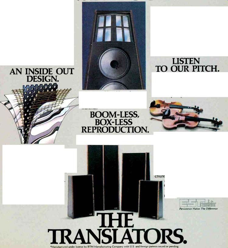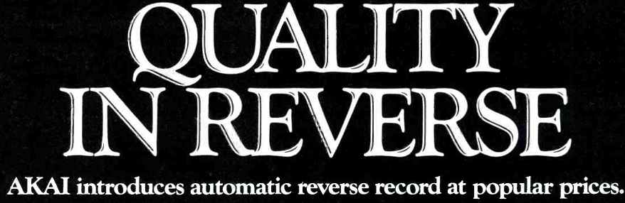 ----------------- AKAI Quality in Reverse ![]() AKAI introduces automatic reverse record at popular prices. Now instead of interrupting great moments in music when it's time to flip the cassette, AKAI's two newest decks automatically reverse the tape and continue to record or play back. In addition, the deluxe GXC-735D is loaded with all the features that make the difference between a good deck and a great one. Things like AKAI's exclusive GX (glass and crystal ferrite) heads, guaranteed for 150,000 hours the equivalent of playing 24 hours a day for 171/2 years. As well as feather-touch controls, Dolby," memory rewind, quick reverse and dramatically recessed red/green illuminated VU meters. Not to mention the kind of specs serious component buyers all over the world depend on AKAI to deliver. (For the more economy-minded, there's the CS-732D. Same great auto reverse record/playback feature, with Dolby, quick reverse and tape selector-- a lot of AKAI quality for not a lot of money.) Hear them both at your AKAI dealer or write AKAI America, Ltd., 2139 E. Del Amo Blvd., P.O. Box 6010, Compton, CA 90224. And see how they can reverse your thinking about automatic recording. ![]() GXC-735D: Wow/Flutter less than 0.08% WRMS; S/N Ratio-better than 58 dB, weighted, at FeCr position, with peak level at 3% THD. Dolby on improves up to 10 dB above 5 kHz. Frequency response 35-17,000 Hz (± 3 dB) using FeCr tape. CS-732D: Wow/Flutter-less than 0.08% WRMS; S/N Ratio better than 57 dB, weighted, at FeCr position, with peak level at 3% THD. Dolby on improves up to 10 dB above 5 kHz. Frequency response38-16,000 Hz (± 3 dB) using FeCr tape. AKAI You never heard it so good. ---------------------- ES Translator ELECTROSTATICS TURNED INSIDE OUT