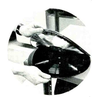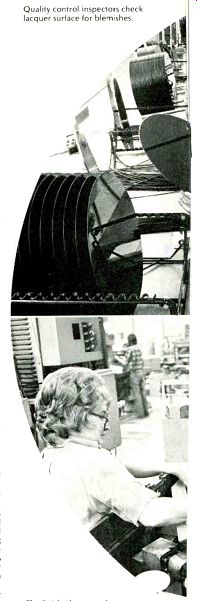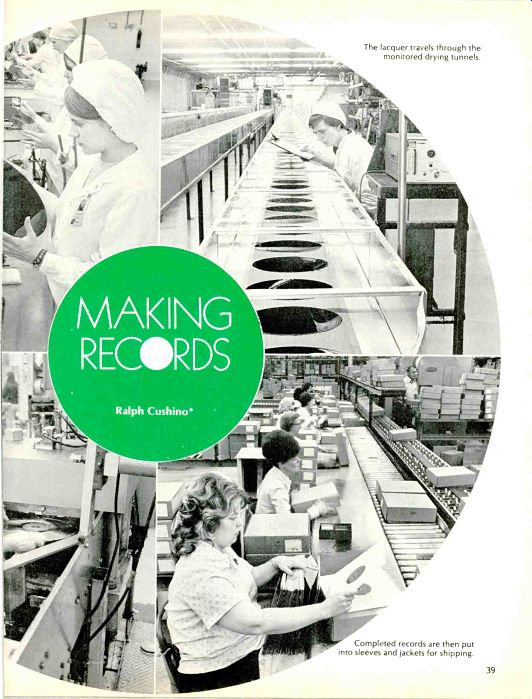 Making Records by Ralph Cushino [ Ralph Cushino is Director of Engineering, Capitol Records, Inc., Hollywood, Calif. 90028. ] ![]() ![]() -------Quality control inspectors check lacquer surface for blemishes. -------The finished stamper is put into the record pressing machine. ------------ The lacquer travels through the monitored drying tunnels. ----------- Completed records are then put into sleeves and jackets for shipping. A RECORD. A simple piece of plastic molded with grooves? Not quite. The vinyl disc you purchase in your local record or hi-fi shop is the end product of a highly critical, multi-step process of precisely controlled timing, temperatures, and chemistry-steps that make a big difference in the sound you hear when you place that innocent black platter on your hi-fi turntable. In fact, the record's journey through lacquer manufacturing plant, recording studio, and record-pressing plant to the sales bin probably took six months or more. And throughout the process, each record has been tested and rechecked at least a dozen times so that you may enjoy sounds as close as possible to those that were recorded by the musicians themselves. While the songwriter is still composing the music, lacquer-coated mastering discs are being manufactured at one of two plants in the United States. These extremely critical discs will bear the impressions made by electronic impulses that ultimately will be transferred through several metal platings to the final mold used n mass production of records. Making A "Lacquer" The base of mastering disc, commonly called a "lacquer," is a smooth, circular aluminum blank, slightly larger in diameter than a finished record and approximately 0.050-in. thick. It has a shiny, highly polished surface because it has been calendered by the aluminum manufacturer to a surface smoothness of 2 micro inches (500 angstroms). At Capitol Magnetics Products' plant in Winchester, Va.-where the accompanying photographs were taken-a unique step is then taken, lapping which consists of grinding away the disc's surface and then re-polishing it one additional time. This insures that no surface imperfections have been ground into the disc's surface in the calendaring. These imperfections, evident in this stage as tiny lines, rolling marks or pits, would show up later in the finished lacquer. Capitol has also found that a lapped surface results in better adhesion between aluminum and lacquer and is the best method for obtaining disc flatness. If the disc is not absolutely flat, it may not cut well and the sound of the final record will reflect the uneven surface. Once the disc has been polished down to acceptable surface specifications, it is nearly ready to receive a coating of lacquer. However, before coating, this smooth disc will have to pass through five chemical baths, a water wash, a drying process, and be checked once again before it is ready to be sent to the coating room. As the aluminum blanks are being lapped, etched, and dried, a special nitro-cellulose lacquer formulation is being blended, filtered, re-filtered and then de-aerated in a series of large tanks in another part of the plant. Samples are tested regularly to determine the lacquer's chemical purity, composition, viscosity, and dispersion and to check for air. Any lumps or bubbles in this complex mixture must be removed before coating or they may later rise to the surface of the coated disc and cause noise clicks, pops or other audible imperfections when the disc is cut. An exact balance of ingredients is also required so that the product will perform reliably through all the various electrical and chemical processes that will be performed on it during the manufacture of a record. For instance, a lacquer must not only cut well in the recording studio, but also process well once it has been cut and then sent to a manufacturing plant for plating and creation of the molds from which multiple copies of the record will be made. The lapped, cleaned, and dried discs come together with the lacquer in the coating room, an environment controlled "white room"' filtered for Class-100 Air-the same standard of air cleanliness necessary for space components and surgical drugs. Air in this room must have less than 100 particles of dust, all less than 0.3 micron in size, per cubic foot of air. People working near the coating machine wear dust free lab coats and caps and at no time touch the disc's surface. They also do not allow two discs to touch; if one disc even leans against another, the surface will be ruined. The disc is coated on one side at a time and then carried by conveyor belt through several hundred feet of drying tunnels. Long, slow drying at correct temperature is necessary for even evaporation of gases and solvents used in blending materials which make up the lacquer. Rushed drying at high temperatures would boil off solvents too quickly, creating pin holes and blemishes on the surface. A quality finished lacquer has the smoothness of ground optics or 100 angstroms (0.4 millionth of an inch) in order to provide optimum low-noise properties. After drying, the lacquer disc is [...] [...] room specially designed for the proper acoustics, where engineers record the musicians, producing a master [...] Once the reference lacquer is finished, it is sent back to the recording studio where the artists, producers, anrd cnunrf PneinPers listen to it. If [...] ![]() -------- The silver mother is carefully stripped from the master lacquer. ... final plate from which the records will be made. Since the final mold must be a negative impression (the lacquer master was a positive impression, the silver a negative, and the nickel mother was positive), the nickel mother is sent back to electroplating for a final nickel mold called a "stamper." Later this stamper will be inserted in a pressing machine and used to stamp out records. Several stampers are usually made from each mother since stampers wear down during the manufact