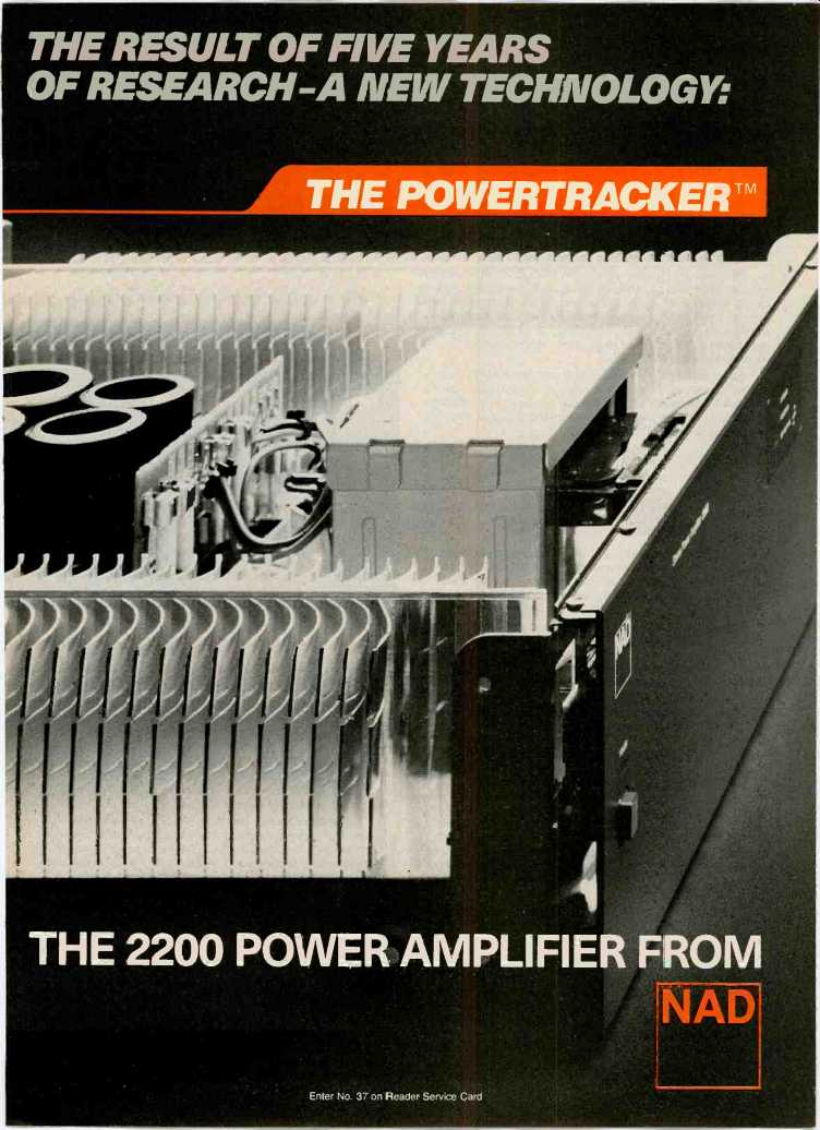 The 2200 virtually re-defines the concept of dynamic head room. Its high power reserves are available, not only for the short 20-millisecond bursts used in the standard IHF dynamic headroom test, but also for musical surges and climaxes lasting ten times longer. Even with compressed recordings of rock music in which the peaks may be only 8 dB higher than the average power, that may be enough variation to allow the 2200 to operate at high efficiency and maintain a clipping level above 500 watts per channel into the 4-ohm impedance that is typical of real speakers. SPECIAL FEATURES: The appeal of the NAD 2200 may be based mainly on its combination of high dynamic power and low cost, but there are other noteworthy aspects of its design, too. Transparent sound. The audio circuitry of the 2200 is based on the same principles that gained worldwide praise for other NAD amplifiers. In the 2200 the circuitry is scaled up substantially in speed and power, using the finest selected parts available today-individually tested filter capacitors and ultra high-speed transistors for wide bandwidth and extremely low distortion. The output stage is a fully complementary parallel circuit using high-gain 25MHz transistors with over 10 times the "safe operating area" of transistors used in typical 100 watts/channel designs. High-voltage, high-current design. Current flowing through the voice-coil is what causes a speaker to produce sound, and NAD was the first manufacturer to emphasize the importance of high output current capacity-unrestricted by so-called protection circuits-to cope with the complex, reactive impedance that many speakers present. The NAD 2200 can produce peak output currents exceeding ±50 Amperes on demand, together with peak output voltages of ±95 volts to handle the most dynamic signals. --Continuous sine-wave output conservatively rated at 100 watts per channel. --Produces 400 to 800 watts per channel of dynamic power for music (depending on Impedance). Generates peak sound pressure levels above 115 dB with most speakers. --Bridging circuit yields 400 watts continuous sine-wave output, over 1200 watts dynamic power for music. --High-current output stage delivers peak currents up to 50 Amperes for precise control of voice-coil motion. --Similar in size, weight, and cost to conventional 100-watt amplifiers. --------The dashed line in this simplified PowerTracker diagram shows the flow of current from the power supplies to the loudspeaker. At normal signal levels the 125-volt supply provides all current. When the audio signal rises above the 140-watt level a controller turns the "gate" transistor on, lowering its resistance nearly to zero so that maximum current can flow from the 190V supply. If the demand for current remains high, a second controller gradually shuts off the flow from the 190V supply to prevent overheating. Inverted channels for powerful bass. The greatest power demands commonly occur at low frequencies. Bass signals are in-phase (and virtually monophonic) in most recordings; thus when the bass waveform is strongly positive in the left channel, it usually is strongly positive in the right channel at the same time. As a result both channels draw current simultaneously from the positive half of the power supply, while the negative half sits idle. During the negative half of the waveform, both channels draw from the negative supply while the positive supply sits idle. In the NAD 2200 the right channel is internally inverted in polarity. When a bass waveform causes the left channel to draw current from the positive supply, the right channel draws its bass power from the negative supply, and vice-versa. This efficient usage halves the instantaneous drain on either supply, allowing much stronger bass to be reproduced without draining the supply. Bridging. The NAD 2200 is so powerful in the normal stereo mode that few listeners will ever need more. For special situations the two channels of the 2200 can be bridged to form a mono amp of truly immense power. Its rated continuous sine-wave output is 400 watts, while its dynamic power output exceeds 1200 watts into 8 ohms and 1600 watts into 4 ohms. Two 2200s in bridged mode (delivering over 3 kilowatts into a pair of 4-ohm speakers) would cost about the same as an ordinary 400-watt amplifier. Quiet circuitry. The delicacy and purity of low-level musical information is as important for realism as the power to handle climaxes. The signal-to-noise ratio of the 2200 (relative to its rated 100 W/ch output level) is greater than 111 dB. No fan noise. In most power amps that are capable of the same 500 W/ch output on musical signals as the 2200, a noisy fan must be used to dissipate excess heat from the circuitry. The efficient 2200 is totally, blissfully silent in operation. Close-tracking Soft Clipping: The newly improved Soft Clipping-circuit in the 2200 accurately tracks the available peak power, regardless of speaker impedance. Older Soft Clipping circuits tended to reduce the available dynamic power by 1.5 to 2 dB in order to ensure that continuous output would always be free from harsh distortion (even when the amplifier was over driven). With the new PowerTracker-circuit, this limitation no longer applies. Now the amplifier's sound remains subjectively clean and transparent right up to the maximum output level. It continues to sound good even at levels 2 to 3 dB above the amplifier's rated maximum output, since the Soft Clipping circuit gently rounds off the waveform corners and prevents any distortion due to power-supply modulation as well as reducing high order harmonics which may damage tweeters. "Audible Clipping" Indicator. To enable the user to make the fullest use of the dynamic power of the 2200, a front-panel "Overload" LED indicator illuminates whenever the amplifier is driven into clipping (or exhibits any other distortion) for a long enough time to be audible. Its calibration is based on psycho acoustic studies showing