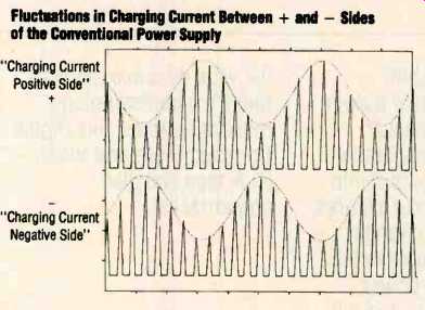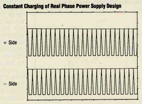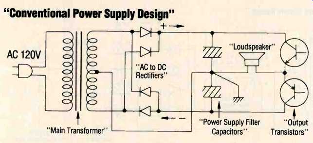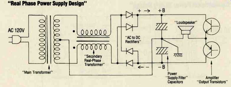 ------------ Impedance Characteristics for IHF Reactive Speaker In conventional amplifiers, the power supply and amplifier stage have been designed with a simple resistive load of fixed impedance, quite unlike the reactive load actually provided by high fidelity loudspeakers. Recently, some amplifiers have been designed to operate into a wider range of load impedances, as the actual impedance of a loudspeaker varies with frequency. However, the power supply design of these amplifiers still treats the loudspeaker load in a simple resistive fashion. The IHF A-202 reactive loudspeaker load model, shown in Fig. 1, consists of a circuit configuration designed to simulate the reactive load normally found in today's loudspeakers. The graph in Fig. 1 shows the impedance variation with frequency caused the IHF A-202 reactive loudspeaker load, with an impedance peak of 23.7 ohms at 50.3 Hz. ![]() ![]() -------Figure 2 "Conventional Power Supply Design" ![]() -------Fig. 3 Degree of Current Phase Shift to Voltage vs. Frequency (Degree) ![]() -------Fig. 4 Fluctuations in Charging Current Between of the Conventional Power Supply and Sides ![]() ------Fig. 5-------"Real Phase Power Supply Design" Conventional Power Supply Design Fig. 2 shows a conventional power supply design. The 120 Volt AC home supply is reduced by the main transformer to a lower level. The AC to DC rectifiers convert the AC pulses to DC pulses, and the filter supply storage capacitors smooth the ripples into a steady DC supply. This DC source feeds the amplifier's output stage with the energy required to drive the speaker load. Unfortunately, if the speaker load connected to the amplifier output stage is reactive in nature, and not a simple resistive impedance, a phase shift between the amplifier output voltage and the loudspeaker drive current will occur. Fig. 3 shows the amount of phase shift between the amplifier output voltage and the loudspeaker drive current caused by tie reactive loudspeaker load model. Fig. 4 shows the fluctuations between the charging current values at the positive and negative sides of the conventional power supply. The peaks and troughs of the + " and "- " sides are 180 degrees out of phase with each other. This charging current fluctuation prevents the power supply from delivering a steady DC source to the amplifier output stage and loudspeaker load. Onkyo Real Phase Power Supply Design Fig. 5 shows the Onkyo Real Phase solution. A second power transformer, called the "In-Phase Transformer" is connected between the "+" and "-" sides of the main transformer's outputs. Any potential between the "+" and "-" charging current is cancelled out by the In-Phase transformer, and a rock-steady DC supply current is supplied to the amplifier output stage, regardless of the actual loudspeaker load. Fig. 6 shows the constant, non-fluctuating charging current of the Onkyo Real Phase power supply. The Real Phase power supply design ensures that the amplifier's output stage has a continuous DC supply, free of the fluctuations caused by phase shift between the amplifier output voltage and loudspeaker drive current. Considerably increased power output into any loudspeaker load assures maximum dynamic range and impact. Transient details are not blurred by power supply fluctuations, and full power reserve is provided for the wide dynamic range of today's high technology musical sources, like Digital Compact Discs and Video Hi-Fi tape and disc soundtracks. ![]() -----Figure 6--Constant Charging of Real Phase Power Supply Design The Onkyo Real Phase M-510 Power Amplifier is the first amplifier to incorporate this unique technology, with other Real Phase Onkyo components soon to follow. The Onkyo M-510 represents the state of the art for solid-state amplification, conservatively rated at 300 Watts per channel, minimum RMS at 8 ohms, both channels driven from 20 Hz to 20 kHz, with no more than 0.005% THD. However, this specification is derived with a simple resistive load, using sine wave signals of fixed intensity. The IHF Dynamic power test, using low and high level signals, more closely simulates the actual performance obtainable with actual loudspeaker loads and music signals, and the Onkyo Real Phase design contributes to the exemplary performance: The Onkyo Real Phase Amplifier Technology will soon be available in two new integrated amplifiers, the A-8057 and A-8067. Rated at 65 and 80 watts per channel respectively, these models feature the ability to drive difficult loudspeaker loads with ease; both models feature substantially increased power output into loads as low as 2 ohms. Onkyo Industry Innovations 1975 Affordable Quartz Digitally Synthesized Tuning 1976 Quartz & Servo Locked Tuning 1977 Straight Low Mass Tonearms 1978 Auto Accubias 1979 Super Servo & Linear Switching 1980 First Cassette/Receivers 1981 High Speed Dubbing Cassette Decks, Real Time Counters 1982 Receivers with CX Decoders 1983 Delta Power Supply, Digital Ready Amplifiers, Automatic Precision Reception, Triple Stage Isolation Systems 1984 First Compact Disc Player with FOUR Power Supplies, First Cassette Deck with all Noise Reduction Systems; Dolby B-C NR HX Pro, dbx, First Receiver with dbx and Dynamic Bass Expander, First Dual Auto Reverse Dubbing Cassette Deck 1985 Real Phase Technology Dual Recording Selector Polysorb Acoustic Vibration Absorbing Compound for Turntables & CD Players First Affordable Audio/Video Remote Control Receiver Artistry in Sound ONKYO. 200 Williams Drive, Ramsey, N.J. 07446 (adapted from Audio magazine, 1985; EDWARD TATNALL CANBY) = = = =