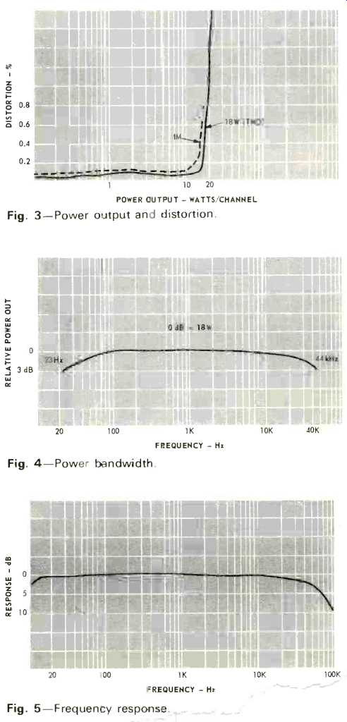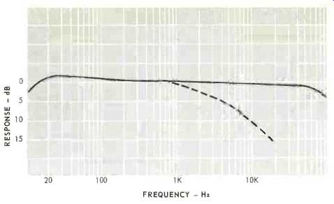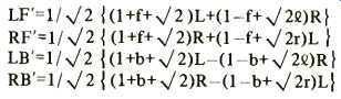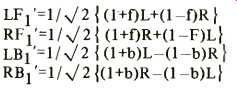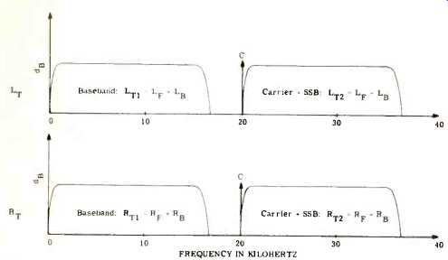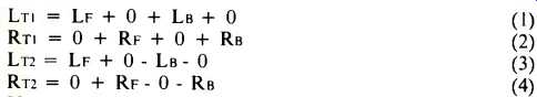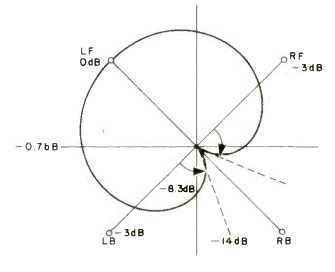 The direct approach for placing four independent audio signals on a two-channel medium is by time-division multiplexing or by using carrier methods. When we began our carrier efforts we were aware of the potential capabilities and pitfalls of this approach, having had an occasion about a decade earlier to master a stereophonic test record, the STR 120, which spanned the frequency range of 10 Hz to 50,000 Hz. (The STR 120 is currently unavailable for sale since all the metal parts for stamping this record have been exhausted.) Since even the most advanced disc cutters do not operate efficiently above 20 kHz, it is necessary to slow down the recording turntables in order to scale down the frequencies; which in turn creates trouble at the bass end, and requires the use of specially lapped styli with miniscule burnishing facets for the shortened wavelengths, which tend to produce a noisier lacquer than conventional styli and to fracture unexpectedly in the middle of a cut. Nevertheless, despite this prior information, it was our contention that carrier methods should not go unexplored and thus our initial work on quadraphonic disc systems at CBS Laboratories was based on the use of carriers. As shown in Fig. 1 each disc channel was provided with a baseband of 20-15,000 Hz, and to this we added a 20 kHz carrier, single-sideband modulated (SSB) from 20,000 to 35,000 Hz. In this manner four independent channels, LT1 and RT1 on the baseband and LT2 and RT2 on the carriers, each with a capacity of 20-15,000 Hz, were obtained. On these we recorded a linear combination or "matrix" of four input signals, LF (Left-Front), RF (Right-Front), LB (Left-Back) and RB (Right Back), in the following manner: ![]() Upon replay and detection, we recover the four left-hand side signals of Equations 1-4. The original four signals can now be obtained as follows: ![]() It should be noted that this "discrete" disc is not naturally discrete but is responsive to a matrix action: "Discreteness" is attempted by signal cancellation, which at no time is ideal. Moreover, we found that the matrix according to Equations (1) and (2) presents an inadequate stereophonic portrayal of the quadraphonic field. Constant power distribution around the quadraphonic circuit results in a concentration of energy in the extreme position of the stereophonic field with diminished center fill, resulting in a ping-pong type presentation; motion between side channels, of course, is lost. Now we … matrixes are available for the baseband wing the SQ matrix later to be ….at this time, however, is that no matter what mixture 'of four original signals is employed with a system which has four independent channels, it is always possible to recover the original signals identically as long as the matrix equations are non-trivial and are linearly independent. If the solution is carried out by means of Cramer's rule', this means that the determinant of coefficients in Equations (1)-(4) must not vanish. We were fully aware, of course, that a 15,000 Hz top end in the system depicted in Fig. 1 would not meet the needs of high-fidelity reproduction, but our view was that we should begin by working within this range and look for further improvement later if the approach proved out. We knew we were already stretching the limits of available technology and any greater demands upon the system simply would compound its difficulties. And the difficulties were many. In addition to the technical recording problems enumerated above, we knew in advance that a linearization process would be required for the baseband and the carrier signals, to minimize distortion. The record player required the use of costly filters to separate the basebands from the carriers, and two detectors were needed, followed by the de-matrixing circuit. Furthermore, previous experiments had alerted us to the fact that even with the costliest of pickups, high frequency response beyond 20 kHz would leave much to be desired.' This situation continues to be prevalent even today as exemplified by the graph in Fig. 2.
