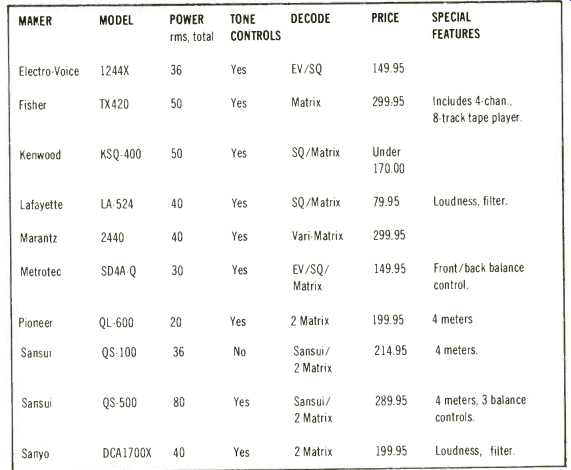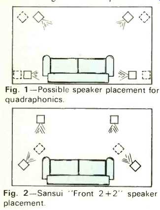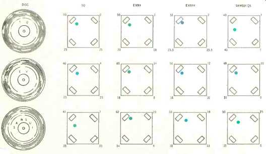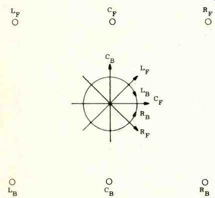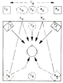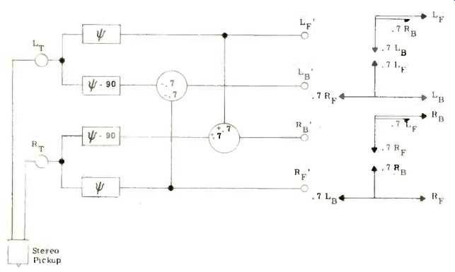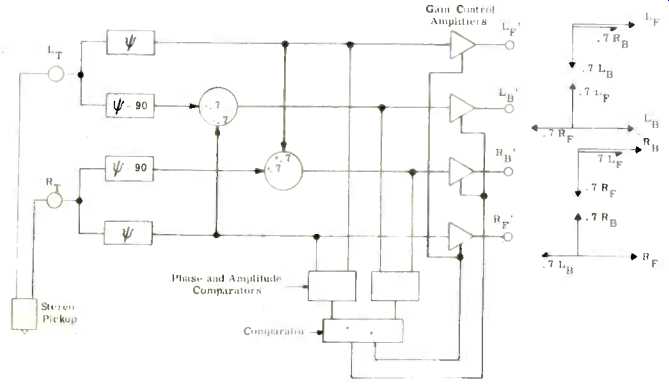 Logic Directed Decoder Our ultimate goal, however, was to provide matrix system performance which would be indistinguishable from that obtained with the discrete system. It is possible to achieve this goal by virtue of three remarkable psychoacoustics phenomena we have all experienced: … that in a normal living room there is …. that a source of a continuous steady- …with ease. 2. The finding that a varying source of sound, such as speech and music can be readily localized. 3. The precedence or Haas effect,' which teaches us that when two or more similar sources are present, the ear credits the one heard first with being the source of sound. Thus, if we can provide an electronic logic to instantaneously enhance the relative strengths of the dominant sources produced by the matrix, and similarly attenuate weaker sounds, we should be able to give the listener the complete experience of four discrete channels. The control function performed by the SQ logic is shown diagrammatically in Fig. 10. While the matrix portion is identical to that in Fig. 9, the output amplifiers have voltage controlled gain characteristics responding to pre-ordained amplitude and phase positions of the transferred signals, as sensed by the logic. For example, the existence of one of the front channel signals results in the generation of two signals transferred to the back channels which have identical amplitudes and which are in a precise quadrature orientation. The comparator senses this relationship and causes the front channel gains instantly to be enhanced, while the back channels are rapidly attenuated. Thus, the listener hears only the appropriate front channel signal regardless of his orientation in the room. By contrast, if one of the back channel signals is momentarily predominant, the reverse effect takes place; the front channels are attenuated and the back channels enhanced. The resulting quadraphonic field provides a total awareness of the four independent channels of the master tape. With single channel signals present, the logic maintains the appropriate channel constantly "open," and greatly attenuates the transferred signals relative to the main signal; thus, transmitting substantially discrete channels of information. Recording Procedures Every competent artist and producer learns how to obtain best results from a particular medium, and SQ is not an exception: Caution should be exercised to maintain phase integrity of common "panned" signals. Panning across the diagonals or splitting a signal four ways between the channels requires a special encoder connection (on newer encoders available with a switch). Ordinarily, signals panned to center-back will be heard only in the quadraphonic and stereophonic modes, and if they are to be present in a monophonic display special circuit arrangements are needed-so it is best to avoid the center-back soloists. Some producers, who strive for special effects, find it desirable to "mix" the SQ program using an encoder-decoder combination in the monitor circuit until they develop a "feel" of the system. However, with the vast majority of instrumental and orchestral performances, the original quadraphonic master tape is simply converted into the SQ record by connecting it to the input channels of the encoder and conveying the encoder output to the conventional disc recording chain. Decoding either with the SQ matrix or matrix/logic decoder produces a realistic and faithful reproduction of the quadraphonic master tape. Conclusion As we conclude our review of quadraphonic disc developments, I would like to leave you one last thought: There is much more to quadraphonic high fidelity than may be expressed by any single performance parameter: Frequency response, output level, signal-to-noise ratio, playing time, precision of directional localization, transmission through AM radio systems, equipment cost and complexity, and compatibility with 100-million record players and FM-multiplex radios-all these must be considered. To do less would be an act of irresponsible engineering. Much has been made of "discreteness" of quadraphonic carrier-type discs, and even our own initial developments used carriers. We found that while a carrier disc is able to approach discrete performance, it does so at the expense of other performance parameters, and only through a precarious balance of several complex processes, involving not only matrixing, but also compression, carrier modulation, ultrasonic disc recording and reproduction, demodulation, expansion, and reverse matrixing-often resulting in a troublesome and unstable action. On the other hand, the SQ matrix provides us with a simple and competent quadraphonic system. The SQ encoder reorders the four corner signals from the original master tape into two pairs of orthogonal modulations and places them on the disc retaining all the qualities of the standard recording processes. Playback is done with standard stereophonic equipment followed by matrix decoding into four channels carrying predominantly the four corner signals, and within the front and back channel pairs retaining complete channel discreteness of the original master tape. Full 360° panning fidelity and compatibility with all phonographs and broadcast processes is retained. An electronic logic is provided to augment the front-back channel separation of the matrix, resulting in a performance which is difficult to distinguish from the original discrete four-channel master tape. Since there appears to be no limit to human imagination and perseverance, we expect that experiments with carrier discs will continue--figuratively speaking--hacking in that direction against all odds. We observe that the choice of design parameters of the presently offered carrier discs does not appear to provide an optimum system configuration. Some optimization; indeed, appears to be feasible, and there even have been suggestions made about using the SQ matrix for the basebands of the carrier