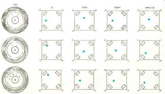 This exhibit shows the performance of the best (from the point of view of high-frequency response) currently available phonograph pickup cartridge, with 0.7 x 0.25 mil diamond stylus, retailing for upward of $100, measured at 11 gram force on the 111 in. and 6-in. radius grooves of the STR-120 record. The curves show that, while response extends to approximately 35,000 Hz at the 11-in. diameter groove, it does not go much beyond 27,000 Hz at 6 in. Thus, one cannot count on being able to recover much beyond 7,000 Hz from the 20 kHz carrier channel toward the end of the disc, even if one does not record all the way into the center of the record. While the restricted frequency range of the pickup, in theory at least, can be improved with future refinements, other related problems do not appear to be amenable to conceptually simple solutions. Fig. 3 depicts the baseband modulation at high frequency as a solid curve produced by the cutter (triangle at left) and replayed with a 0.2 x 0.7-mil elliptical stylus (ellipse at right). The maximum modulation angle we encounter in records is 45°--(actually less than that on the negative modulation slopes because of the "smearing" action of the burnishing facet which gives rise to modulation noise). Let's superimpose a carrier shown in dash-line upon the base band. The lateral velocity of the carrier as defined by its slope is of the same order of magnitude as that of the baseband; its radius of curvature actually may be considerably smaller. Therefore, the aforementioned carrier takes up as much or more "modulation space" as the baseband itself. In order to cut the composite wave on the lacquer disc, the magnitude of the combination has to be diminished, say, by a factor of … or 6 dB. This is precisely what we had to do with our experimental carrier discs to obtain a quiet cut and to avoid excessive distortion. Even with the above-mentioned reduction in level, the pickup with elliptical stylus was unable to recover the ultrasonic signals at diameters below 6. in. This appears to be tied-in with the elasticity of the groove material which results in a high-frequency cutoff as predicted by Miller'. Thus, it became clear to us, as our experiments proceeded, that the carrier disc approaches would neither meet the compatibility requirements enumerated earlier, nor always fulfill their discrete promise because: A) The signal level, frequency response, distortion, and signal-to-noise ratio were marginal. B) The special pickup and complicated decoder were too costly to satisfy the needs of the mass market. C) Playing time per side was inadequate for the repertoire. D) FM multiplex quadraphonic transmission problem remained unsolved. […] problems were exacerbated by the vagaries … ultrasonic frequencies often resulting …. Recent Carrier Disc Developments Improvements and implementations of carrier disc technology have been reported last year by Inoue and his associates', and more recently by Shiga and Coopers. As we review (their findings, we conclude that even the advances they have reported do not substantially change our conclusions. To review briefly: 1. Inoue uses a 15 kHz baseband, as we did, but with a 30 kHz carrier which is FM-PM modulated over a swing of 20-45 kHz. Thus, his system like our early one, is limited to the 15 kHz capability. While it has been reported that pickups suitable for Inoue's method are now available for the top line of players, there is historical experience for doubting that hey will reach the mass market any time in the near future. Unfortunately, the FM-PM modulation method is extremely sensitive to turntable speed; and any pickup response cutoff earlier than 40 kHz will cause a dis-symmetrical carrier recovery, generating distortion. Also, Inoue uses a compression expansion scheme to diminish carrier noise which further increases playback equipment complexity and cost, and raises added channel separation problems. 2. Shiga and Cooper, we understand, have simplified the carrier problem by adopting a lowered carrier frequency and modulation range to' achieve discrete or semi-discrete performance in the lower 3 kHz portion of the baseband, returning to pure matrix performance at frequencies above 3 kHz. While, on the one hand,' this results in a commendable simplification of the recording problem, on the other, it builds in an unalterable quality limitation in the system. Thus, of the three carrier methods discussed above, we think the SSB approach we chose, with all its problems, in the end might have resulted in the best compromise. However, this is not the place to debate the specific sub-issues. The key point to be made here is that the optimum carrier system parameters have not as yet been evolved as witnessed by the diverse problems and solutions we have described, and the carrier disc technology will require considerably more time and effort before it can seriously be considered as a mass market product for the home. And, even if it were to be fully developed, it still will include certain limitations-such as incompatibility with stereo multiplex broadcasting-that will make its widespread adoption undesirable. SQ Quadraphonic Matrix System Knowing all the carrier-disc complexities discussed above, we concentrated' our efforts on pure matrix systems which resulted in the development Of the SQ matrix which, as it turns out, provides a viable method of quadraphonic recording and reproduction without the use of carriers. The first important attribute, and the source of total stereophonic compatibility of the SQ matrix is that, for the front signals of a hexaphonic array of sound sources, it retains precisely the same modulation format as normally found in a stereophonic disc. The LF and RF signals form 45° and-45° modulations, respectively, as shown in Fig. 4, and the matrixed center-front channel (CF) forms a lateral modulation. Our problem was how to provide the same capability for the back channel signals. Tim