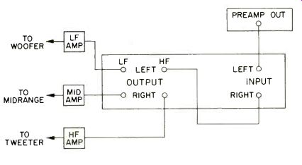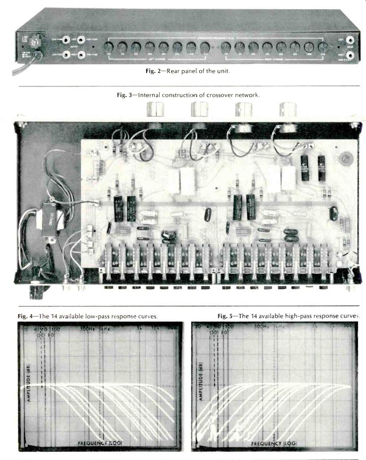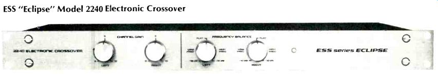 Equipment Profiles:E88 "Eclipse" Model 2240 Electronic Crossover/Leonard Feldman; Garrard Model 86SB Turntable/George W. Tillett-------------------- ESS "Eclipse" Model 2240 Electronic Crossover MANUFACTURER'S SPECIFICATIONS: Available Frequencies: 100, 150, 200, 250, 500, 800, & 1250 Hz, or (via multiplier button) 1.0,1.5, 2.0, 2.5, 8.0 & 12.5 kHz per channel. Frequency Response: Low Pass: Within 0.25 dB 20 Hz to-3dB at selected crossover; High Pass:-3 dB at crossover to within 0.25 dB up to 20 kHz. Crossover Slopes: 12 dB per octave. Gain: 0 dB in pass bands. Dimensions: 19 in. W x 1 3/4 in. H x 9 in. D (48.3 x 4.4 x 23 cm.) Weight: 5 lbs. (2.3 kg.) Price: $300.00. ![]() The advantages of using electronic crossovers in a bi-amp or tri-amp sound reproducing system, as opposed to passive crossover networks built into multi-driver speaker systems, have been described in audio literature over the last several years in great detail. To summarize the advantages here, biamping or tri-amping of audio systems is said to require less power per individual amplifier for a given level of composite complex signals, elimination of passive components between amplifier and speaker driver, more accurate reproduction of frequencies in the vicinity of crossover points, and retention of high damping factors as seen by the speaker drivers themselves. The ESS 2240 Electronic Crossover is basically a stereo device with bi-amping capabilities when used with a pair of stereo power amplifiers and a preamplifier or with a stereo receiver with preamp-main amp interruption facilities plus a second stereo power amp. Alternatively, the 2240 may be used monophonically to create a tri-amplification system, as shown in the hook-up diagram of Fig. 1, in which case two Model 2240s would be required for stereo. The crossover network is intended for standard rack mounting and utilizes just one standard rack space (13/4 inches) in height. The brushed aluminum front panel has 4 rotary controls, a pair of overall channel gain controls for left and right channels and two "frequency balance" controls (one for each channel) which adjust relative gain between low and high frequency output bands. A tiny red pilot lamp indicates that power has been applied as there is no on/off switch on the unit (a fact which poses no real problem since the unit would probably be connected to one of the switched convenience outlets on associated preamplifier equipment or to a switched outlet expander in a pro installation). Actual crossover frequency selection is made via fourteen buttons (seven per channel) plus two "times ten" multiplier buttons, all located on the rear panel as shown in Fig. 2. A total of 14 crossover frequencies may be selected for each channel (see manufacturer's published specifications above). [Editor's Note: For this photo we have removed the metal shield which keeps inquisitive fingers from randomly selecting crossover points.] There are two standard phono-tip input jacks which accept signals from preamplifier outputs and four output jacks (two for low-pass and high-pass bands of each channel). The device is line fused on the rear-panel with a 1 ampere fuse. The view of the internal construction of the crossover network (Fig. 3) discloses that active filter circuits are employed throughout. No inductive components are used, and three identical integrated circuits take care of all lowand highpass filtering plus gain circuitry. The single large circuit board is made of glass epoxy and high-quality, tight-tolerance capacitors are used in critical frequency-determining circuits. The preliminary owner's manual supplied with our test sample did not contain a schematic diagram of the circuit, so we can only comment on end results attained in our measurements. ![]() Fig. 1--Wiring required to use the ESS 2240 as a mono three way crossover. ![]() Fig. 2--Rear panel of the unit. Fig. 3--Internal construction of crossover network. Fig. 4--The 14 available low-pass response curves. Fig. 5--The available high-pass response curves. With some 28 individual response curves available in the 2240, we really appreciated having our Tektronix spectrum analyzer even more than we had up to now. Without it, we would still be plotting point-by-point responses, and this report might not have appeared until several months later! Be that as it may, Fig. 4 is a storage 'scope display of all 14 lowpass filter response curves available, while Fig. 5 shows the 14 complementary high-pass response curves. Since the frequency calibration of our analyzer is extremely precise and frequencies are swept logarithmically, verification of the-3dB points for each curve can be made right from these scope photos and were found to be very precise, with variations (from-3 dB at the specified frequencies) never off by more than 0.5 dB in the worst case and generally much closer than that. The display in Fig. 6 resulted from two separate frequency sweeps. During the first sweep (with crossover frequency set to 1 kHz) the input to our analyzer was connected to the "low pass" output jack of one channel of the 2240 to obtain the left-hand trace. After first reconnecting the analyzer's input to the high pass output jack of the same channel of the 2240, the sweep of frequencies was made once more, yielding the "text-book perfect" composite crossover characteristic which was photographed directly from the storage scope face. "The three-way crossover arrangement pictures in Fig. 7 was achieved by connecting the 2240 as suggested earlier in Fig. 1, and low-to-mid crossover of 500 Hz was chosen while mid-to-high crossover selected was 12,500 Hz. The "frequency balance controls" described earlier are particularly useful if you plan to use power amplifiers which are not equipped with input level controls. Set to one extreme, these controls provide a low-pass output which is 10 dB lower than the high-pass output, while when set to the other extreme, the reverse situation is obtained
