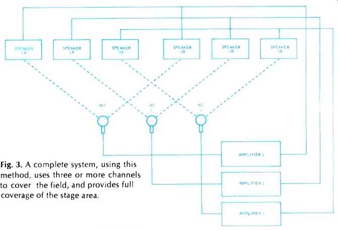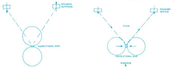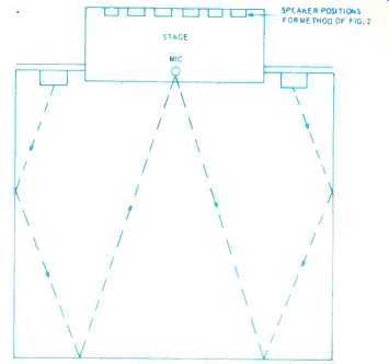 The diagram of Fig. 3 is that of a slot-loaded enclosure as used by Bozak. These are very popular in Europe and are used extensively for airport installations. Care has to be used in design to avoid cavity effects. The majority of enclosures are sealed, but reflex loading with narrow ports is sometimes used in the larger systems. Electronics for Public Address NORMAN H. CROWHURST PUBLIC ADDRESS SYSTEMS are the story of overcoming acoustic problems. From the earliest days, this consisted of using one or more microphones with one or more loudspeakers to make the program sound-someone speaking or a musical performance-more audible to the audience. If acoustics are not very bad, a relatively simple arrangement of microphone, amplifier, and loudspeakers does the trick. But then, when the acoustics are not bad, possibly the auditorium does not really need reinforcement in the first place, except maybe for the speaker or vocalist who has always used one and cannot be heard without. Apart from this, sound reinforcement is more generally needed where the audience cannot hear without it, which means the acoustics are not good, one way or another. So various tricks were used fairly early in the game to help the system do a better job than the simple microphone, amplifier, and loudspeaker combination could do, with no trimmings. The recurrent problem has always been acoustic feedback, from the loudspeakers to the microphone, before adequate `gain' could be obtained to make the program more audible to the audience. Transducers Before we turn to the purely electronic devices, it will be well to emphasize something that time and again has been found to be very important concerning the electroacoustic devices-microphones and loudspeakers: they must be as flat as possible in their frequency response--free from peaks and dips. Acoustic feedback always occurs first at some specific frequency: that is where the trouble begins. In a good system, feedback should be almost ready to start at many frequencies at the same time, over a fairly wide frequency band. The presence of marked peaks in either the microphone or the type of speakers used, will result in a tendency to start a feedback howl at one of these peak frequencies while the general reproduction of adjacent, non-peak frequencies is still quite inadequate. Auditoriums also exhibit frequencies at which feedback more readily starts, often due to natural resonances associated with the dimensions of the building. But in few instances are these peaks nearly as difficult to manage as are those peaks that occur in microphone or loudspeaker response. When an acoustic howl starts, it sets up a standing wave pattern in the room, and this pattern is usually related in some way to the dimensions of the room. If the system, from acoustic input to the microphone to acoustic output from the loudspeakers, is close to flat, the correction needed to minimize the effect due to building acoustics is usually not serious, but it can be very helpful. Acousta-Voice This is the approach used by Altec Lansing's "Acousta-Voice" method. Acousta-Voice is not so much a system as an approach to doing the job. The Acousta-Voice engineer, trained by Altec's people, visits the auditorium and conducts a real-time analysis of the building's acoustics, to find where its peaks and valleys are. These are carefully and precisely analyzed and then a permanent filter is adjusted to offset the acoustic deviations from flat response. When the Acousta-Voice filter is inserted into the system, the overall response of the system, in that auditorium, is flat. This enables the system to be operated at notably more gain than is possible without the correction, and the performance is more free from noticeable coloration at the level where it is operated. Perhaps Acousta-Voicing can be regarded as a refinement of the older methods that employed tone controls and notch filters. The main difference is that the old method used controls that were available on a specific system, or some components thrown together by a man with a good "ear" for such things, and thus matched the performance, as well as possible, to the needs of the moment. To a considerable extent, this method depended on, and was limited by, the skill of the operator. Acousta-Voicing is more precise, scientific, not subject to trial and error, or hit and miss. Frequency Shifting Another approach that seems to have fascinated many because of its sophistication, is the frequency-shifting principle. Every input frequency is shifted a few hertz up or down, so the frequency content in the output from the loudspeakers differs from that going into the microphone, although the intelligible content of the program is virtually unchanged. This method has proved successful, if expensive, on speech, but for obvious reasons, it is not good for music. Shifting frequency, say 5 Hz, in the upper register may Make little enough difference that only"' highly skilled musician would notice it. But down in the bass register, the same 5 Hz could be a change in pitch of a semitone or two, which would be disastrous to the musical effect, even as discerned by a musically untrained ear. Possibly frequency shifting would have proved far more popular for situations where speech-only is a reliable expectation, if it were not for the fact that, being highly sophisticated, it is also costly. Acoustic Nulling Another approach to the acoustic feedback problem is worth noting, and putting in perspective relative to other efforts, so confusion between different methods is avoided. This has been the subject of some experiments conducted by Electro Voice in collaboration with Brigham Young University. While it involves additional electronics to do the job, it relies on acoustic nulling of the feedback signal. If two loudspeakers are connected anti-phase and a microphone is placed precisely equidistant from them, as in Fig. 1, and their levels are adjusted so the intensity receive