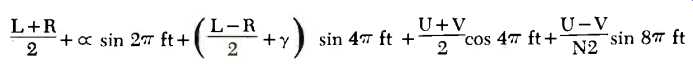 4-Channel QUART By modulating frequencies around 76 kHz, it is possible to add a fourth channel and by careful adjustment of the various parameters it should be possible to ensure that the degradation of signal to noise is no worse than 7.5 dB-smaller than in any other system known to the author. For those whose mathematics is good, the three -channel signal can be represented as follows: ![]() where L= the left channel signal, R-= the right channel, A the ambience signal, f= 19,000, t=time in seconds; cx and gamma are constants. The 4 -channel system can be represented as follows: ![]() where U and V are rear left and rear right channel signals respectively. This article has also appeared in the British "Hi-Fi News" and the author will welcome any correspondence on the subject of quadraphonic sound. The address is: Michael Gerzon, Mathematical Institute, St. Giles, Oxford, OX1 3LB, England. ============= (Audio magazine, sept. 1970) = = = = |