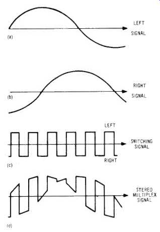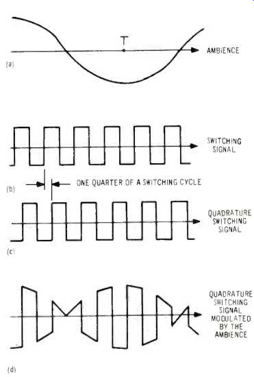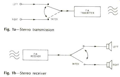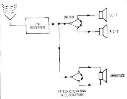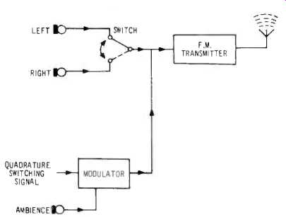 by MICHAEL GERZON ![]() THERE SEEMS TO BE no doubt that in the long run, multi -channel stereo will become the standard for Hi-Fi. The real problem to be solved is how multi -channel sound can be recorded or broadcast cheaply and efficiently. The original Vanguard quadraphonic tapes cost $14.00 each for the usual LP length--which is too much. (Prices will come down with a rush when the demand increases). RCA have just announced that they will release a number of 4-channel tapes in August using the standard 8 track cassette but no prices are available as we go to press. Much work is going on behind the scenes to develop disk and tape systems which will be inexpensive and compatible and just what system will be finally adopted is anyone's guess at the moment. One proposal involves the addition of two coded signals at 72 kHz and 92 kHz. ![]() Fig. 1a--Stereo transmission. Fig. 1b--Stereo receiver The main objections to this method are a rather low modulation level on all channels and a high noise level, poor frequency response (up to only 9 kHz) on the rear channels plus the difficulty of avoiding high -frequency chatter distortion. It seems to have been overlooked that there is sufficient room in the ordinary FM multiplex system to squeeze in a third or fourth channel without affecting the performance of present-day receivers. It is well known that the present method of broadcasting stereo does not allow audio frequencies above 19 kHz to be transmitted. Thus, the combined frequency range theoretically required by both left and right channels should be 2x38 kHz. However, stereo multiplexing uses up a range of 3 x 19...57 kHz for each half of the spectrum. (In the U.S., the figures would be 53 kHz+53 kHz-ignoring SCA requirements, Ed.) It is in this 'surplus' 19 kHz that a third or fourth channel can be squeezed. The writer of this article has taken out a patent on such a system which is called QUART-meaning Quadrature Ambience with Reference Tone for 3 or 4 channels. First let us see how a 3 channel QUART is squeezed into a 'pint pot.' In order to transmit two channels with a single transmitter (i.e., ordinary stereo ), a rapidly operating electronic switch--switches the left channel, then the right, then the left and so on, into the transmitter. See Fig. la. This switch operates at a very high rate (4 times 19,000, or 76,000 times per second) so that if the left- and right -channel electrical signals are as in Figs. 2a and 2b, then the switched signal fed into the transmitter might look like Fig. 2d. This is called the stereo multiplex signal. Figure 2c shows a square waveform which represents the way the switch is operating at each moment of time-the switching signal. As the switch in the transmitter functions at a high speed a listener picking up the broadcast with an ordinary mono receiver just hears the average of the two channels--a good mono signal. But in a stereo receiver there is a switch operating exactly in step with the one in the transmitter that switches the left and right signals into the two channels. How does the receiver switch keep in step? This is obviously very important and it is accomplished by a 19-kHz sine wave called the pilot tone which is transmitted by the station and the circuit is so arranged that the pilot tone keeps the switch synchronized (like an electric clock) . The QUART system adds a third channel using a system called "quadrature modulation" because it involves an additional switch operating exactly one quarter of a cycle out of step with the switch just described. A similar technique is used to convey color information in some TV systems. Consider a third rear channel audio signal which we will call the "ambience" signal as in Fig. 3a. Let the switching signal for stereo multiplex be represented by Fig. 3b. Now consider a second switching signal in quadrature with the first, i.e., a quarter of a cycle out of step with switching signal number one as shown in Fig. 3c. At the transmitter end, the ambience signal is made to modulate the quadrature switching signal; in other words at each moment we give the quadrature switching signal an amplitude proportional to the value of the ambience signal. If the ambience signal happens to be negative (as at time T in Fig. 3a) we then reverse the polarity (or the sign) of the quadrature switching signal also. By this means, we obtain a quadrature switching signal modulated by the ambience signal as shown in Fig. 3d. Figure 6 shows the usual stereo signal plus the ambience-modulated quadrature switching signal as transmitted. To see how a receiver reacts to this complicated signal, consider a stereo receiver picking up a quadrature signal modulated by the ambience as in Fig. 6a. The switch in the receiver operates in step with the usual switching signal of Fig. 6b and the outputs of the left and right channels will be as shown in Figs. 6c and 6d. It will be seen that both these outputs are of a high frequency and will therefore contain no audio frequencies. Thus an ordinary stereo receiver picking up a QUART transmission will ignore the modulated quadrature switching signal and will respond only to the normal stereo signals. A three -channel receiver using the QUART system will be similar to a conventional stereo receiver-plus a device to recover the ambience channel. The detector for the third channel will use switching similar to the switching used for stereo, except that it will take place in quadrature ( i.e. a quarter of a switching cycle out of step) with the stereo switching (see Fig. 5). As before, a pilot tone of 19 kHz is also transmitted to synchronize the receiver's switches with those at the transmitter. In the QUART system a low-level signal of 38 kHz in step with the stereo switching signal is also transmitted. This is called the reference tone and it helps in the synchronizing process as well as providing a signal to switch on a light for 3 -channel indication. While the QUART system is a little com