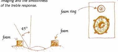 REARRANGING AND REDECORATING It is a week later. Only twice have I rearranged the furniture in my office/listening room. Now I can sit comfortably at the proper distance, mid way between the speakers. I am quite pleased with the sound on most material, but sometimes there is too much treble. I am not imagining it. The treble seems at once too bright, yet deadly accurate. With measuring equipment and laboratory-quality microphones, I find that the speakers are flat as far as half an octave beyond the highest frequency I can hear, but they still sound too bright. How am I to ex plain this paradox? My listening room is too live, no doubt. I get a bigger rug from another room. It helps the room, but there is no effect on the perceived brightness of the tweeters. I idly contemplate placing acoustic foam on all vertical surfaces. My wife has been very tolerant about rearranging furniture, but I know she'll draw the line at covering the glass on the French doors with textured foam. I am not really very eager to do this anyway. I have an inspiration. Instead of treating the room, I'll treat the speakers. After a trip to the hardware store to purchase some foam weather-strip ping, I remove the grilles and make foam circles about the tweeters. The idea is to block the dispersion of treble sound, limiting it by means of the foam barrier to a cone of sound 45° off-axis to the speakers (see Fig. 1). It works! The unpleasant edge to the treble is gone! I sit back to enjoy my handiwork, and make a surprising discovery. The imaging is uncanny. Each instrument and voice takes on an exact physical and solid presence at some point between the speakers. The image is extremely stable and never wavers. With some material the sound even seems to come from the right of the right speaker or to the left of the left. Such imaging is not uncommon with electrostatics, but only twice be fore have I heard it so pronounced with dynamic loudspeakers. I get a pair of ancient Advents (the original model) I'd been using with my TV, hook them up to my system, then treat the tweeters with the foam tape. Their imaging is improved. Not as good as the Snells', but much more defined than before. I note the same effect with a pair of the original EPI 100s my wife had when we got married. What have I discovered? I spend the next few weeks modifying friends' speakers. In every case they prefer their speakers with the foam treatment. Where the image is very well defined to begin with, there is less improvement because there's less room to improve. Even so, no one has removed the foam rings. Hundred-dollar boxes or $4,000 towers--it doesn't matter. Everyone agrees the sound is better. I return to the stereo store, and George lets me put foam rings on his demo speakers. We listen. "I like it" he says, then calls in his manager and makes him guess what's going on. They must like the sound, because the foam rings are still on the demo model when I stop by some weeks later. I have brief fantasies of going into manufacturing, but the device is not patentable. Without a functioning distribution network, imitators would flood the market before a profit could be made. Nor would a manufacturer want to pay royalties or buy such a simple idea. Yet I can still share my discovery with the audio community. A magazine article would help finance my continued experiments. There is one last test before sharing my discovery with the world. I call up the Critic. The Critic makes his living from sound, reviewing and passing judgment on music and equipment. If he believes in the tweeter rings, they are ready for the world. THE CRITIC I've gotten an invitation to visit the Critic in his home, despite having revealed that I intend to modify his speakers. I've come with my wife because we have a dinner party that evening in the neighborhood, and as a former musician she's interested in my audio activities. "I'm just afraid that after listening to your system, he'll go out and buy a couple of hundred dollars worth of records," she says to our host. "I'm afraid you'll just have to watch him carefully," the Critic replies, his eyes twinkling. His listening room is deceptive. It seems small and narrow, but it's not.