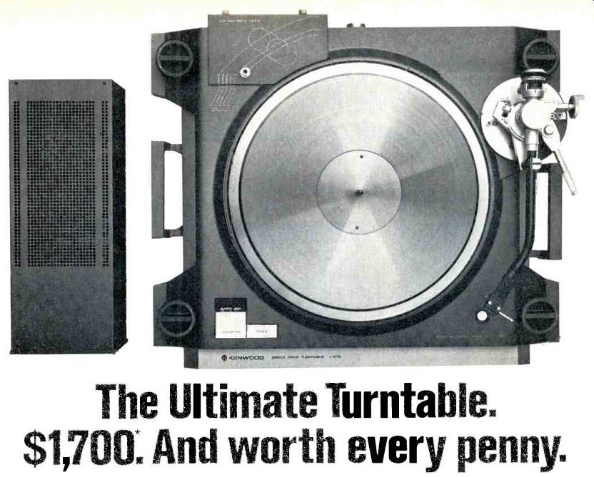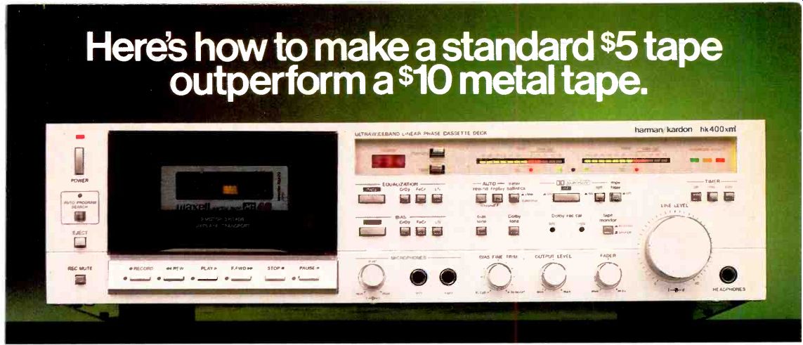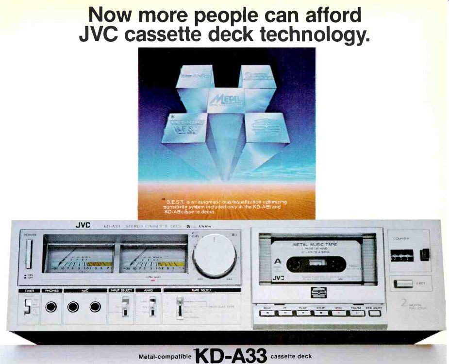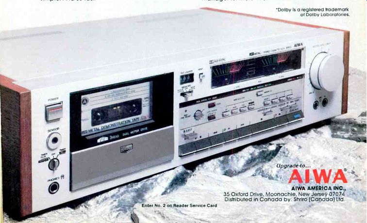 ----------Low-mass, high rigidity tonearm. ----------Ultra-rigid closed pickup loop. ----------The L-07D's external Dynamic Phase Compensator We even designed a separate power supply and logic control for the L-07D. An external Dynamic Phase Compensator that automatically regulates rotational accuracy and isolates the cartridge from electrical interference. For the full technical story, please write us at the address below. Or better yet, see your nearest Kenwood Audio Purist Group dealer for an audition of the remarkable L-07D turntable. If your ears can appreciate what the L-07D can do for your records, the price won't seem so extravagant. AUDIO PURIST GROUP KENWOOD Not all Kenwood dealers carry these products. For the Audio Purist Group Dealer nearest you, write Kenwood, PO. Box 6213, Carson, CA 90749. * Nationally advertised value. Actual prices are established by Kenwood dealers. ------------------- The tonearm that isn't. The traditional tone arm has been replaced. By Linatrack. A revolutionary tracking system developed by Revox. This sophisticated and highly refined electronic servo-system ensures that your records are played just the way they were cut, with perfect tangential tracking. We've eliminated the causes of distortion inherent in conventional tone arm design. There's no need for an anti-skating device because there is no skating force. Our unique LED/photo diode array monitors the stylus angle and makes instant corrections to keep the tip absolutely perpendicular. Pivot friction has also been dramatically reduced by our unique single-point jeweled pivot/magnetic support and suspension system. With Linatrack, tracking error is reduced to a phenomenal 0.5° or less, virtually eliminating distortion and protecting your records from excessive wear. The high torque direct drive motor of the Revox B790 uses Hall-Effect magnetic sensors tied to a quartz crystal to constantly read and instantly correct rotational speed. This eliminates the moment-to-moment deviations , found on even the most expensive conventional direct drive motors. You can verify speed accuracy with the fast responding LED digital readouts. The readouts also provide an accurate log of manual speed adjustments. Even with its advanced features, the Revox B790 is a pleasure to operate with safe and convenient automation. It works with virtually every cartridge and is ruggedly built to stand up to years of daily operation. For more good reasons to play your records without a tone arm, experience the B790 at your Revox dealer. Studer Revox America, Inc. 1425 Elm Hill Pike, Nashville. TN 37210, (615) 2M-5651 Offices: Los Angeles (213) 780-4234 / New York (212) 255-4462. In Canada, Studer Revox Canada, Ltd. --------------------- hk ![]() Record a standard $5 tape on one of the new Harman Kardon High Technology cassette decks with Dolby HX*. And a $10 metal tape on a conventional deck. Any conventional deck. Now compare. The Harman Kardon deck with Dolby HX will give you substantially better performance from the standard tape. More dynamic headroom. And better signal-to-noise ratio. Yet the recording made on our Harman Kardon High Technology deck costs about half as much. Which can save you a small fortune if you plan a tape library of any size. Of course our new High Technology decks are metal capable, too. So you can use Dolby HX and metal tape for performance that can't be topped by anything less than a professional quality open reel deck. But Dolby HX is only part of the performance story. Our heads cost more. And they deliver more. The heads used in a cassette deck probably dictate the performance you'll get more than any other single component. That's why at Harman Kardon, we spent a lot more time and money on our head designs and materials. We started with Super Sendust Alloy, the costliest and most advanced material available. In manufacturing, we machine our head gaps to incredibly precise tolerances, and align them with equal care. Obviously, this process takes more time and costs more money. But it results in frequency response unheard of in a single speed cassette deck at any price. Even our most economical deck, for instance, gives you ruler-flat frequency response from 15 Hz to an incredible 19,000 Hz from a conventional tape. You also get features like Dolby NR, a front panel bias fine trim, MPX filter and memory. As you move on up the line, the specs just get better. And so do the features. Like the world's first headroom safety indicator to prevent tape saturation far more accurately than any peak level indicators. You'll also find built-in Dolby and bias test tones. Normal and slow meter ballistics. A fader control. Plus our exclusive Auto Program Search System that scans a tape automatically, sampling the beginning of each cut until you've located the one you want. Yet the new Harman Kardon High Technology cassette decks do share one thing in common with the conventional decks. A conventional price tag. So before you settle for a deck that will set you back $10 or more every time you want a quality recording, audition the new Harman Kardon Decks with Dolby HX. You'll get performance that beats metal. At about half the price. 'Dolby and the double-D symbol are trademarks of Dolby Laboratories. Dolby HX is a standard feature on all Harman Kardon High Technology decks except the 100M. The hk100M with frequency response from 15-19kHz ± 3dB. The hk200XM with frequency response from 15-19kHz ± 3dB. The hk300XM with frequency response from 15-20kHz ± 3dB. Harman/kardon 240 Crossways Park West, Woodbury, NY 11797 Toll free: 1-800-528-6050 ext. 870 ----------- JVC ![]() Now more people can afford JVC cassette deck technology. KD-A33 If you've found that an affordable price usually means a sacrifice of performance, take heart. The JVC KD-A33 metal-compatible cassette deck includes much of the technology found in our most expensive decks. Yet it happens to be one of our least expensive decks. For example, 