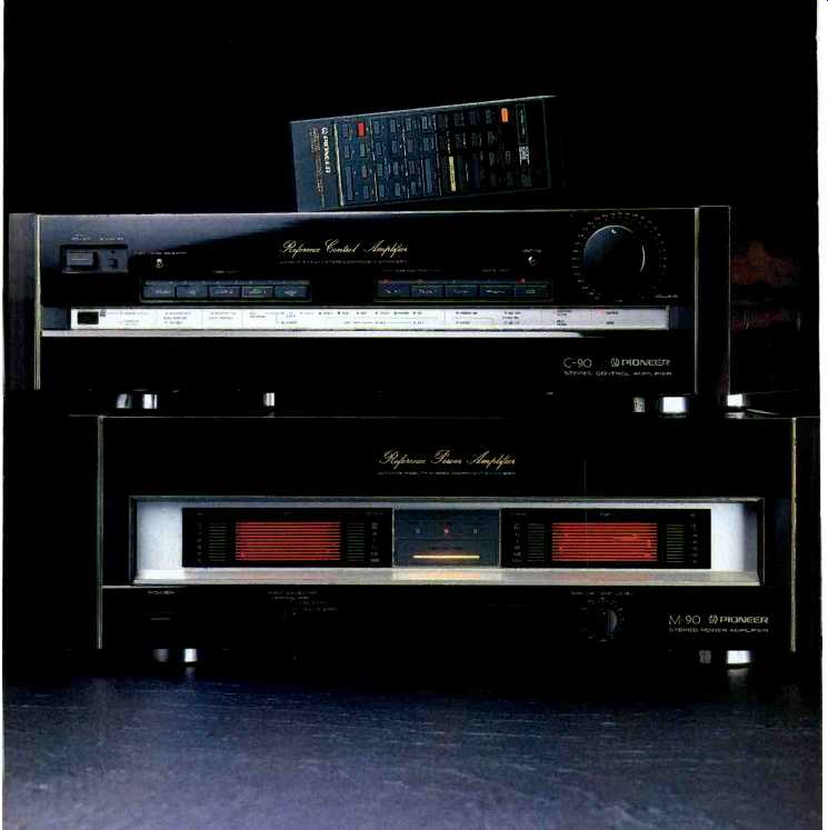 Reference Amplifiers C-90 Reference Control Amplifier We've given the C-90 a twin-mono amp construction which features separate power supplies and chassis layouts for the left and right channels. This elaborate construction shuts out mutual interference between channels, thus dramatically reducing intermodulation distortion. There's also an independent power supply that uses an exclusive transformer for video circuits, displays, relays, microcomputers and electronic switches. We've also isolated the circuits in the C-90 from the external world because we know that a preamplifier is as susceptible to external disturbances and vibration as any other component. Preamps handle very delicate signals measured in microvolts and millivolts. When subjected to vibration, parts vibrate in sympathy, resulting in a type of distortion called "microphonics." Though subtle, this effect is discernable, especially with the tremendously wide dynamic range possible with digital programs. So we constructed feet from polycarbonate (for optimum shock absorbing response), anchored circuit boards to the chassis with rubber dampers, used flexible copper screws to cushion shocks, and employed a massive solid-aluminum volume control knob. In order to retain higher purity and integrity, we shortened signal paths as much as possible through the use of relays, electronic switches and other means of electronic control wherever applicable. This has resulted in a drastic reduction of signal loss and deterioration (noise, distortion, crosstalk, etc.). To boost the delicate signals from moving-coil cartridges, Pioneer's exclusive "hybrid" booster combines a quality transformer and an optimum-gain phono equalizer. With one-half the normal number of turns of coil, the transformer's thicker wire reduces DC resistance and stray wire capacitance for better high-frequency response. The reduced gain in the transformer is compensated for by an equalizer specially designed for low-noise performance. All this ensures that our "hybrid" booster provides a flat response from lows to highs and well-damped sound, making your "analog" records sound better than ever. Pioneer's policy of using only quality parts is expressed throughout the amplifier, from circuit boards to wiring, from capacitors to semiconductors. Copper plating is used for the chassis and screws, for instance, to reduce subtle magnetic distortion. In addition to high-quality sound, the C-90 also provides tremendous convenience: it connects, switches and controls six video components two play-only units (LD players, TV tuners, etc.), three record/playback VCRs, and one processor unit. Besides, it provides two monitor outputs, and a 5-pin RF converter output that accepts an optional RF modulator (JA-RF5) for connecting a conventional TV. Using the sharpness, detail and noise reduction controls, you can even enhance the video as you watch or dub. And for added convenience, the C-90 comes with a remote control that lets you control volume and input selection, as well as handle other Pioneer audio/video equipment with the "SR" mark. Adding a touch of class to the amplifier is an aluminum front panel finished with a lacquer-like shine. M-90 NON SWITCHING AMP' Reference Power Amplifier The demand for a reliable and high-output power amplifier has never been greater now with the wide dynamic range made possible by the Compact Disc. The M-90 Reference Power Amplifier was designed especially for this digital age. Speaker systems can have rated impedances of, say, 6 or 8 ohms, but when they play music with wide dynamic variations, the actual impedance can go much lower, especially at low frequencies. With dynamic digital sound, an amplifier must be equipped with a power supply that performs reliably even under the heaviest load. And that's why we've created the M-90: its power supply features two outsize transformers, large electrolytic capacitors (for a total capacitance of 48,000µF) and four bridged rectifier circuits with fast-recovery diodes. And in the power amplifier, 16 high-power transistors (8 per channel) are used in an elaborate "four-in-parallel" configuration. What this means is that the M-90 is ready to deliver a continuous average power output of 200 watts per channel, min., at 8 ohms from 20Hz to 20,000Hz with no more than 0.003% total harmonic distortion. What's even more amazing is its dynamic power: 300 watts at 8 ohms, 550 watts at 4 ohms and 800 watts at 2 ohms (with EIA dynamic test signal). We also have made signal paths as short as possible to ensure signal integrity. The volume control for CD input is located on the front panel, of course, but actual level adjustment is performed by a potentiometer located behind the input terminals and linked by a long shaft. In addition to the input for a control amp, the M-90 has an input, with volume control, for direct connection of a Compact Disc player to allow you to enjoy purer-than-ever digital sound. Another line-level direct input is also provided that permits you to add other digital equipment in the future. The M-90 also has an output to allow you to return the signals to the preamp for equalization or recording on a tape deck. We used our exclusive Non-Switching Circuit Type II for the power output stage, thus ending switching distortion. And we have elaborated on this design to reduce distortion further across a wide power output range. Thermal distortion is also drastically reduced by stabilizing the idling current supplied to power transistors from the moment power is turned on. Moreover, we've reduced non-linear distortion of power transistors to 1/30 that of our class-B amps. To ensure quality sound, we used quality parts, such as gold-plated in/output jacks, OFC (Oxygen-Free Copper) wiring, and 70µm thick copper-plated circuit boards. To reduce magnetic distortion, the entire chassis is copper-plated, and so are screws used throughout. Sophisticated craftsmanship is evident from the exterior: the power