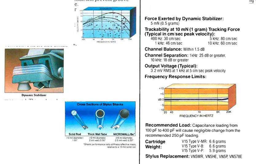 Do you know how important a cartridge and stylus are? True high fidelity sound reproduction begins with the phono cartridge. It is the only point at which the recording is linked to the rest of your stereo system. Your system could have the most sophisticated turntable, receiver, and speakers but reproduce poor quality sound if the cartridge is not functioning correctly and accurately. A top quality Shure cartridge or stylus also reduces record wear. With regular replacement, it can extend the life of your collection. What goes on inside a cartridge? The diagram on the left illustrates the basic structure of a Shure moving magnet cartridge. (1) Sound actually starts when the diamond stylus tip (needle) rides in the record groove. The motion of this tip moves a (2) magnet. The magnet and tip are connected by the (3) stylus shank. Inside the cartridge body, (4) magnetic conductors surround the magnet. (5) A coil of pure copper wire wraps around one leg of each conductor. As the magnet moves, it distributes the magnetic field among these magnetic conductors. Energy flows through the center of the copper coil and produces the electrical signal. This signal corresponds to the original motion of the tip and is electrically transmitted to the other components of your stereo system by terminal pins (6) bonded to the ends of the coils. What shouldn't go on inside a cartridge? The internal components of many cartridges are held in place with glue. Over time, they can loosen and movement can cause resonances that color or blur the signal and lessen the stereo effect. To eliminate this problem, all Shure cartridges feature (7) DURA-BODY ENCAPSULATE construction (see diagram to left). This unique encapsulation technique holds all components tightly in place. It ensures performance uniformity and cartridge longevity, eliminating the possibility of short or open circuits in the electrical components that could render the cartridge inoperative. Stylus tips-which one is right for you? The shape of the diamond tip is the single most differentiating factor among styli. Certain shapes work better with one type of high fidelity equipment and for different musical preferences than others. The Spherical or "conical" Tip has a simple, rounded tip. It was particularly well-suited to early LP recordings and pre-stereo records, although it is compatible with modern stereo recordings. The Elliptical Tip works better with the newer, more lightweight tonearms. It is elongated, like an oval, and fits the record groove undulations better than the spherical tip, especially at higher frequency ranges. The Hyperelliptical (HE) Tip is an improvement over the spherical and elliptical designs. The area of the tip that actually touches the record groove wall is longer and narrower to allow it to faithfully reproduce the highest frequency ranges with less distortion. The Micro-Ridge Tip represents the ultimate in low-distortion sound reproduction due to its flawless tracing ability. The smaller contact radius dimension of the Micro-Ridge reduces distortion to an absolute minimum. It is today's state-of-the-art design. Which tip provides the least amount of distortion? Distortion resulting from the tip shape is due to the inability of the tip to trace high frequency and complex signals. Spherical tips introduce the greatest amount of this type of distortion. The exclusive Shure 9.9% Micro Ridge Tip reduces these effects to a minimum. How long does a stylus tip last? Stylus life varies by tip shape.* The patented Shure Micro Ridge Tip is designed to provide as much as 1500 hours of playing time before requiring replacement. This is twice as much as ordinary elliptical designs. 'Many other factors affect stylus life (tracking force. condition of your record collection, variations in stylus diameter and quality. etc.) so a prediction of usable stylus life is always an estimate. Spherical 1.6% 1 cl 6 mil Spherical E 2nd harmonic distortion average both channels 3.7 kHz, 31 cm/sec peak 74% recorded velocity H I M distortion, average both channels 1 kHz/1.5 kHz, 15 cm/sec peak recorded velocity 4.6 % 2.9% öe0.4% .2 x .7md 2 x 1.5 mil 15 = 33 Mil Elliptical Hyperelliptical Micro-Ridge Useful Stylus Life Elliptical Hours playing time Audible distortion Hyper-elliptical Micro-Ridge 1500 How can a stylus be protected from damage? Shure's patented Side-Guard Stylus Protection System protects your stylus from damage by guiding it into a protected area in the stylus grip when it is accidentally bumped against a record or the edge of the turntable platter. Side Guard The finest achievement in sound reproduction. The V15 Type V-MR. Shure's V15-Type V-MR features the revolutionary Micro Ridge Stylus Tip for unsurpassed tracing, particularly in the essential high frequency range. It provides an incredible 60cm/sec.; enough to handle the hottest signals of today's superdiscs. The patented MR Tip is also MASAR"-polished to further reduce record wall friction and prevent groove wall damage to extend record life. A patented Dynamic Stabilizer functions like a miniature shock absorber to compensate for record warps which might result in groove skipping, cartridge , bottoming and signal wow. The stabilizer's 10,000 electrically conductive fibers also simultaneously discharge static electricity from the record surface and sweep microscopic dust from record grooves. The Beryllium MICROWALL/Be 1 t Stylus Shank delivers incredibly accurate, high-frequency trackability with the lowest effective stylus mass of any shank yet measured. This reduced mass results in a truer, more refined sound with significantly less record and stylus wear. You'll also hear crisper highs and more forceful bass with a rich audio depth you've never heard before. ![]() ![]() ![]() ![]() ![]() ![]() ![]() ![]() ![]() ![]() ![]() SPECIFICATIONS For the sophisticated listener. The M111HE and M110HE Relax and enjoy your favorite music at its best. The M111HE and M110HE offer you bri