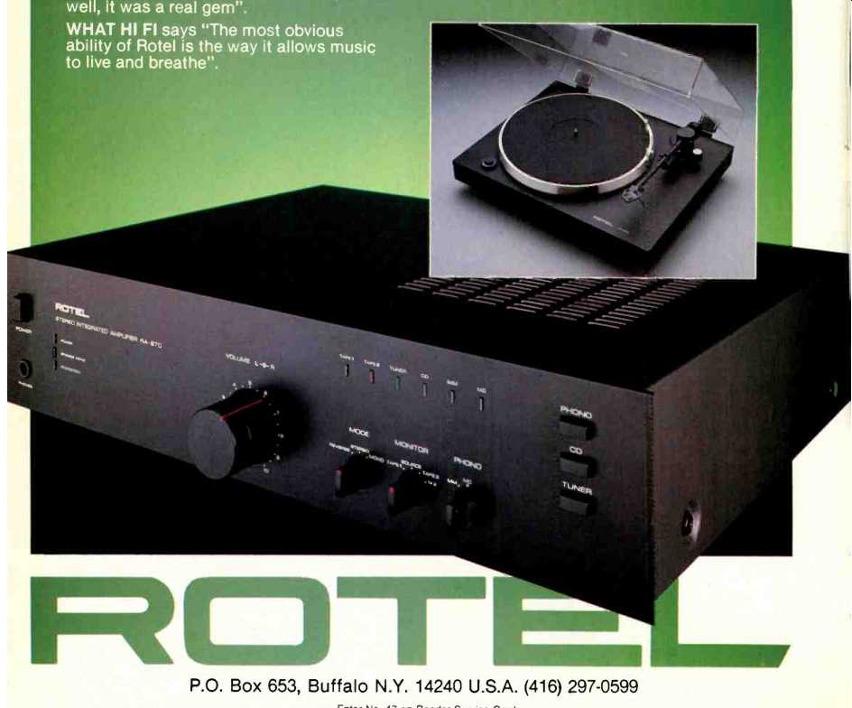Back Issues Available Dear Editor: I have a Life Member subscription to Audio, and I have compiled a large quantity of the magazines from Volume 38 (1954) to the present, with only five copies missing in all. In addition, I have 13 more sets, almost all complete. I also have back issues of Hi-Fi / Stereo Review, QST, Electronics, Radio News and Communications, as well as 25 volumes of Riders TV Service. I no longer have room to store all these magazines, and wonder if any of your readers would be interested in purchasing them. I have a complete inventory of issues. Edward Scribner Schoharie, N.Y. Editor's Note: If you are interested in purchasing back issues from Mr. Scribner, send a letter to him care of this magazine (1515 Broadway, New York, N.Y. 10036). We will forward all inquiries. -A. H. CD Fulfillment Dear Editor: I address this observation to the manufacturers of Compact Discs. The disc itself has the capacity to contain over 60 minutes of music. It is somewhat disappointing to purchase a collection of works just to find out that it only has 34 minutes of music on it. Why not use the Compact Disc to its maxi- mum capacity by filling out the remaining 26 minutes or so with another collection? It would be nice to feel that you get close to 100% of what you pay for, and not just 50%. Harlan Lassiter; Newport Beach, Cal. Off the Beaten Format Dear Editor: Thank you for mentioning the fact that we offer real-time duplicated cassettes in both Dolby C and "Type X" (dbx-compatible) formats, in addition to the Dolby B format. (See "Spectrum," February issue). In addition, we have products in the other two formats Mr. Berger discussed, PCM digital cassettes and 15-ips open-reel tapes on metal reels. We offer all of our releases (over 45 titles) in all formats. Our price for PCM digital cassettes (VHS and Beta formats) ranges from about $25 to $31, while our price for the 15-ips open-reel tapes ranges from about $30 to $36 on metal reels ($5 less on NAB -hub plastic reels). Our open-reel tapes, whether on "standard" tape at 7 1/2 ips or on mastering tape at 7 1/2 or 15 ips, are available in 2- or 4-track with no noise reduction, or with Dolby B, Dolby C, or "Type X" noise reduction. Audio readers may also be interest-ed in our plans to offer our complete tape catalog in one additional format, Beta Hi -Fi, for the same price as our PCM digital tapes. I feel that the Beta Hi-Fi system is an excellent choice for the audiophile who wants very high - quality sound but doesn't want the expense, trouble, and inconvenience of open reel at 15 or 30 ips, especially with wider tape. Bob Sellman, Direct-to-Tape Recording Co., 14 Station Ave. Haddon Heights, N.J. 08305 Erratum In the feature article, "Cassette Test Update: 12 Formulations," in the September issue, the figures for two Type I and two Type II formulations appeared incorrectly. Below are the correct versions. ![]() Type I: Realistic Low Noise (top) and Supertape Gold Type II: Swire Laser UHDII (top) and TDK HX-S =================== Vintage AD: ROTEL. Perfect bass ... Perfect treble... Perfect sound...forever. ROTEL introduces a refreshing new range of audio equipment designed exclusively to appeal to hi fi enthusiasts. Its acceptance in the UK, where Rotel was designed and conceived, is overwhelming. ![]() HI-FI TODAY says "Rotel have engineered some outstanding products which offer amazing sound and remarkable value". NEW HI FI SOUND says "The sound was open, lively, detailed and enjoyable to listen to, and as for the RA820B amplifier, well, it was a real gem". WHAT HI FI says "The most obvious ability of Rotel is the way it allows music to live and breathe". HI FI CHOICE says "The Rotel system stands out in its ability to play records properly. The stereo soundstage is well defined, and with a good cartridge there is clarity, precision, and evenness of reproduction that allows the music to sound lively and vivid...Quite clearly, its performance is something special". Listen to Rotel yourself and let's hear what YOU have to say. P.O. Box 653, Buffalo N.Y. 14240 U.S.A. (416) 297-0599 ------------------- (Audio magazine, Nov. 1984) = = = = |