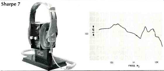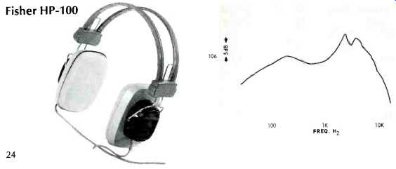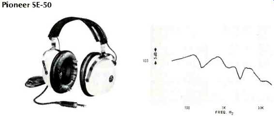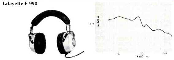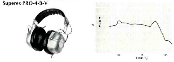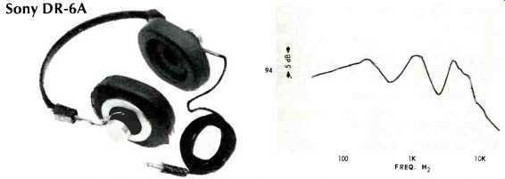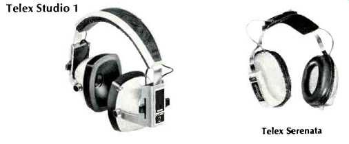 ---- Lafayette F-990 ![]() White plastic shells, 8 ohms d.c. resistance per phone. Round foam-filled vinyl pads, brown adjustable plastic band, foam filled vinyl head pad. Cord attached to one phone, 7 ft. in length, and fitted with removable plug. Sensitivity, 112 dB SPL; isolation, 9 dB. Weight, 20 oz. Price, $29.95. ---- Pioneer SE-50 ![]() Plastic shells, white vinyl covered; d.c. resistance, 8 ohms per phone. Each phone fitted with level control for total signal and a second control for highs. Phones consist of 3-in. cone low-frequency unit and horn-type high-frequency unit, with capacitor dividing network. Leather covered adjustable steel band, leather foam filled head pad. Leather foam-filled pads 4x432 in., removable. Coiled black cord extends to 16 ft., fitted with permanent plug. Furnished in attractive black vinyl covered case with red and white lining. Sensitivity, 103 dB SPL; isolation, 15 dB. Weight, 20 oz. Price, $49.95. Sennheiser HD-414 ![]() Gray plastic shells, 2000 ohms d.c. resistance per phone. "Open-Aire" ear pads of fine foam, 23 inches in diameter, 3 in. thick. Gray plastic band with no head pads, unnecessary because of light weight. Cord 15 ft. long, split to the two phones. Left phone identified by yellow plastic band on cord, right by red band. Cord furnished with removable black plug, and plastic "reel" furnished to wind cord on. Sensitivity, 97 dB SPL; isolation, 2 dB. High impedance permits direct use with preamp output and with tape recorder monitor jacks designed for high-Z phones. Weight 5 oz. Price, $29.95. Sharpe 7 ![]() Green plastic shells, d.c. resistance 16 ohms per phone. Removable plastic pads 3.25x5 in., liquid-filled. Green plastic adjustable band with plastic head pad. Green coiled cord extendable to 15 ft., fitted with permanent plug. Sensitivity, 103 dB SPL; isolation, 8 dB. Weight, 18 oz. Price, $19.95. Sony DRA-6A ![]() Plastic and aluminum shells, d.c. resistance 8 ohms per phone. Removable ,foam-filled vinyl pads 3.5x4.25 in. Adjustable single steel band plastic covered. Cloth covered 7-ft. cable, removable plug. Sensitivity, 94 dB SPL; isolation, 12 dB. Weight, 133í oz. Price, $27.50. Superex PRO-4-B-V ![]() Dynamic cone woofer, ceramic tweeter; d.c. resistance, 8 ohms per phone. Available with impedances of 60, 2000, and 15,000 ohms. Dual steel band, adjustable, plastic covered, with vinyl head pad. Green plastic shells. Removable foam-filled vinyl pads 3.5x4 in. Black 4 wire coiled cord extendable to 15 ft., detachable plastic plug. Sensitivity, 111 dB SPL; isolation, 20 dB. Weight, 23 oz. Price, $59.95. Telex Studio 1, Telex Serenata ![]() These models were not available in time to include their performance characteristics, but they will be included in a future issue. Ivory plastic shells; surgical silicone compound ear pads. Adjustable steel band, plastic cover, with head pad. Slide-type level controls on each phone, together with tone control for each. Coiled cord, 25 ft. long, with molded permanent plug. Weight, 24 oz. Price, $99.95. Studio 2 without controls), $84.95. - - - - -