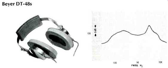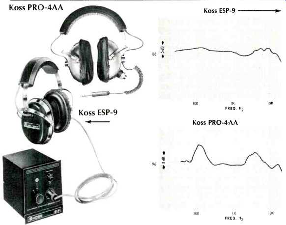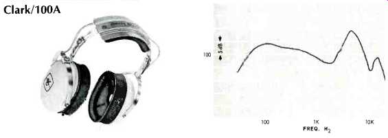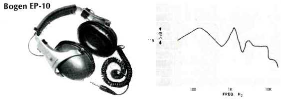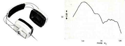 AKG K-60 Gray plastic shells; d.c. resistance, 550 ohms per phone; for 600-ohm circuits, although usable with typical receiver headphone jacks. Removable silver-colored vinyl pads 33íx43í in., foam filled. Double flat steel headband, plastic covered. Right and left phones identified by colored dots on band-yellow for left, red for right. Gray plastic cord, split to phones, 7 ft. long, detachable plug. Sensitivity: 95 dB SPL; isolation 19 dB. Weight, 11 oz. Price $39.50. Beyer DT-48s ![]() Aluminum shells, marked L and R; d.c. resistance, 5 ohms per phone. Foam filled vinyl pads 3x4.5-in. Adjustable steel hand with plastic top, two vinyl-covered foam pads. Cord 10 ft. long, split to each phone, with yellow and red bands to indicate left and right. Metal-shell plug, detachable. Furnished with leather-like vinyl zippered case. Sensitivity: 106 dB SPL; isolation 21 dB. Weight, 16 oz. Price: $98.00. Available with 50-ohm impedance for use with Nagra and Stellavox recorders as Model DT-48N, $98.00. Bogen EP-10 ![]() Olive plastic shells; d.c. resistance, 8 ohms per phone. Removable leather-like black vinyl pads, foam filled, 3.75x4.75 in. Plastic headband, foam rubber head pad. Coiled black cord to left phone, extends to 6 ft., permanent molded plug. Sensitivity, 115 dB SPL; isolation, 6 dB. Weight, 20 oz. Price: $29.95. Clark/100A ![]() Gray plastic shells; d.c. resistance, 20 ohms each phone. (Also available in 300 and 600 ohms.) Removable molded foam pads 34x4 in., adjustable fiat steel band with molded foam pad. Black coiled cord extends to 10 ft., permanent molded plug. Sensitivity, 98 dB SPL, isolation 10 dB. Weight, 16 oz. Price $50.00. Fisher HP-100 ![]() Light gray plastic shells with molded frame for flat foam pads over ears; d.c. resistance, 50 ohms each phone. Plastic covered wire headband. Gray cord split to each phone, 8 ft. long, with permanent molded plug. Red plastic indicator on right phone, yellow on left. Sensitivity, 104 dB SPL; isolation, 2 dB. Weight, 15 oz. Price $39.95. Jensen HS-2 ![]() White plastic shells; d.c. resistance 4 ohms per phone. Pads of 7/8-in. foam, 3.25x 4.25 in., circumaural, dark gray in color. Adjustable two-wire headband, plastic top and foam head pad. Cord to left phone, 8 ft. long, and fitted with permanent plug. No identification as to which phone is intended for which ear. Sensitivity, 104 dB SPL; isolation, 2 dB. Weight, 15 oz. Price $39.95. Koss PRO-4AA, Koss ESP 9 ![]() Only electrostatic phones in group. Black plastic shell, with removable vinyl liquid-filled pads 3.25x4.25. Single wide steel band, adjustable, with plastic cover and foam head pad. Cord connected to left phone, 6 ft. long, and fitted with 5-prong plug which mates with socket on E-9 Energizer, which plugs into a.c. socket, and connected to speaker terminals by 4-wire cable with spade tips. Switch on energizer permits selection of a.c. or signal-powered polarizing circuit, and a second switch turns on speakers which are connected to terminal strip on rear of Energizer. Sensitivity, 88 dB SPL; isolation, 11 dB. Weight, 19 oz. exclusive of Energizer. Price, $150.00, including Energizer. ---- Tan plastic shells; d.c. resistance, 8 ohms per phone. Removable liquid-filled pads 3.25x4.25. Wide steel band, adjustable, with plastic cover, foam head pad. Coiled 4-conductor cord, extendable to 10 ft., removable plug. Sensitivity, 96 dB SPL; isolation 10 dB. Weight, 19 oz. Price, $60.00.