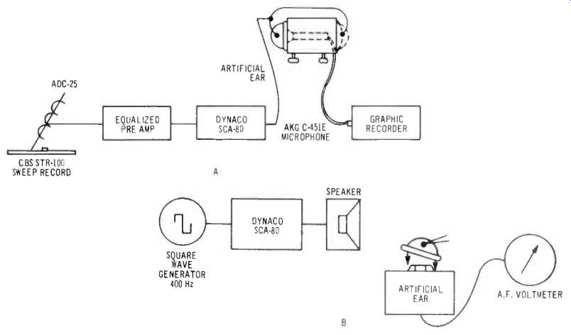 by C. G. McPROUD STEREO HEADPHONES as we know them today apparently made their appearance in 1959, and while there was only one manufacturer that year, now there are many. John Koss introduced the idea of "Stereophones" and has made a successful business of phones ever since. Earphones are not new, of course. They have been used by radio "hams" for at least fifty years, and before that they were used for any listening that was necessary. They were necessary then because the signals were low in level, and there were no amplifiers to make them audible over loudspeaker--seven if we had loudspeakers. And the first loudspeakers were simply a single phone coupled to a horn. This arrangement gave way in the 20's to the first dynamic horn driver, introduced by Magnavox and still coupled to a horn. Even though the cone loudspeaker had been invented in about 1877, it did not become popular enough--or good enough--to enjoy general use until late in the 20's. The first earphone was similar to the telephone receiver, from which it derived, purely as a means to provide a smaller device which could be worn on a band over the head instead of being held in the hand as one did the old telephone receiver. It consisted of a magnet, a coil of wire, and a diaphragm. The minute currents through the coil varied the attraction of its core to the iron diaphragm, resulting in movement of the diaphragm which moved the air in contact with it to create sound waves. The field created by the coil alone would attract the diaphragm on each half cycle of the signal, so the magnet was necessary to provide a "bias" to the diaphragm. Then the diaphragm would be attracted more on one half cycle and less on the next half cycle, rather than equally on both half cycles. Without the magnet, the reproduced signal would be twice the frequency of the applied current; with it, the sound would be equivalent to the signal current. Somewhat improved phones were made with an armature inside a coil and a small linkage between one end of the armature and the center of a diaphragm. This was the principle of the original " Baldwin" phones, which were somewhat more sensitive than the earlier types, and which could have better quality. Another type was the ribbon phone of RCA manufacture. This was one of the first really high quality headphones. It consisted of a thin ribbon imbedded into a diaphragm in such a way as to be held between the poles of the coil, together with the permanent magnet. These phones were called "High Fidelity Headphones," and carried the designation MI-3453 by RCA. Dynamic headphones made their appearance in the 30's, and one excellent type was provided by Western Electric. They were used by mixers for location recording in the early days of sound movies. Later types consisted of tiny hearing-aid devices which were worn with molded plastic earpieces which effectively eliminated air leakage and provided excellent low-frequency response. "Stereophones" With the advent of stereophonic recording, the first listening was always done with phones-hence the name "binaural" became a part of the vocabulary of any knowledgeable audiophile. In fact, it took some doing to eliminate the word from our lexicon, and we still haven't succeeded in eliminating "monaural" which is often used when monophonic is meant. John Koss introduced his "Stereophones" during the 50's, employing a 3 1/2-in. dynamic speaker in each of the two earpieces. They created quite a sensation-so much so that many other manufacturers began to get into the market with their products so that today there must be upward of a hundred separate models available. Koss alone lists nine models, ranging in price from $150 for the ESP-9 Studio Monitor down to a lowest price of $19.95, which is simply an improved model of his first Stereophones. Our September issue listed 35 separate models, and two more are listed in the November issue. And for the Product Preview issue, we limited each manufacturer so that not every model could be listed. Furthermore, not every manufacturer was included in the listings. Because of the many makes and models, we planned to cover the subject as thoroughly as possible in this issue, giving more details of the models selected by the manufacturer, providing response curves and comparing sensitivities and the sound isolation effect of many of the popular headphones on the market. As a starter, we requested samples from a number of manufacturers, and soon we had an office full of headphones--fifteen in all. And still not every manufacturer was included, and certainly not every model they produce. Performance Measurements The measurement of headphone performance is relatively complicated. The phones must be coupled to a microphone by means of an "artificial ear" of specific characteristics-and here there is a considerable difference of opinion. There are U.S. standards, International Electrotechnical Commission standards, and the British National Physical Laboratory standards-and they do not all coincide. The basic artificial ear coupler consists of a 6-cu. cm. volume between the phone and the microphone diaphragm, while a 2.5 cu. cm. volume is used for hearing-aid measurements. Various types are available commercially, and at relatively high costs, so we borrowed the one used by Koss, together with a Bruel and Kjaer 1/2-in. condenser microphone, its cathode follower and power supply. These we used as standard, since they were used by Koss in measurements on their ESP-9 Studio Monitor Stereophones, which are in the category of highest quality. Then to make sure that we could continue headphone measurements after we returned the artificial ear and the B & K microphone to Koss, we built our own artificial ear, using an AKG C-451E condenser microphone. Our model consists of a 5 1/2 maple body, 6 1/2 in. long with a 3/4-in. hole through the center for the microphone. The 6-cu. cm. volume was retained as in the Koss model. The C 451E microphone is a 3/4-i