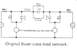 A Word About Right and Left By and large, most of the headphones described in these columns have some form of indication as to which is intended for the left ear and which is for the right. But we found that there is not much consistency in the way the plugs are wired to the phones. The custom of wiring the jacks in receivers seems to be that the right channel feeds to the tip and the left channel feeds the ring, with the sleeve being common to both channels. About half of the phones tested were connected in accordance with this "standard," and the others were connected with the tip to the left phone and the ring to the right. Not that it makes much difference, except that if you are accustomed to hearing the violins on the left in real life, you may be surprised to be hearing them on the right when you plug the phones into your receiver or amplifier. With removable plugs, you could change the connections at the plug; with permanent molded plugs integral with the cord, you couldn't--you would need to make the change at the phone jack on the receiver or amplifier-or put the phones on "backward." When listening to loudspeakers, both ears hear the two channels-but with headphones, the channels are isolated. With the usual recording methods, the sound is unnatural-although many people prefer it! In order to restore correct "balance," crosstalk of appropriate phase and amplitude must be introduced between channels. One circuit which does this is the Bauer crossfeed arrangement, which is reproduced below ( see AUDIO November, 1962). ![]() ------ 4 Original Bauer cross-feed network.