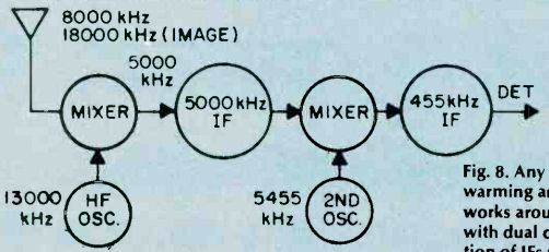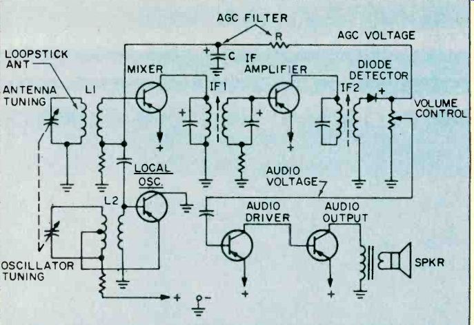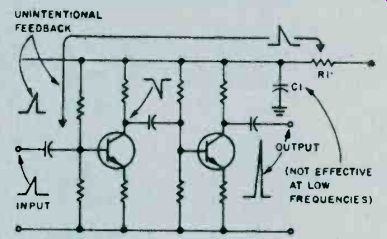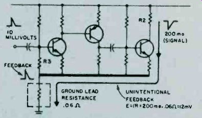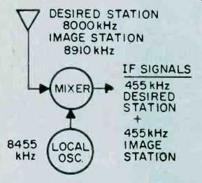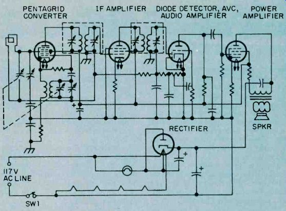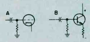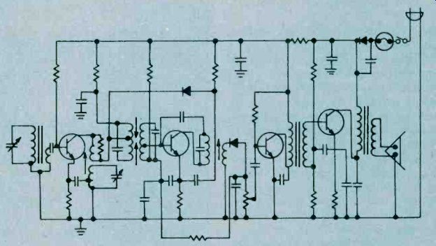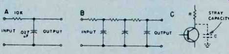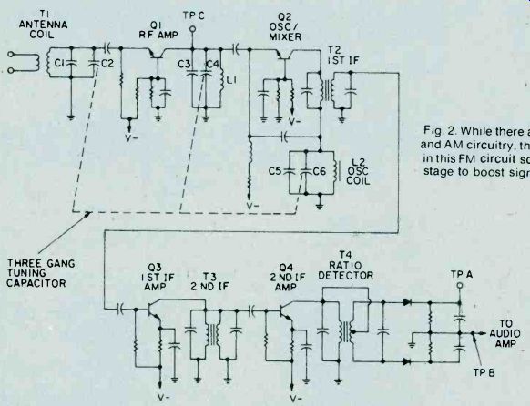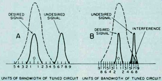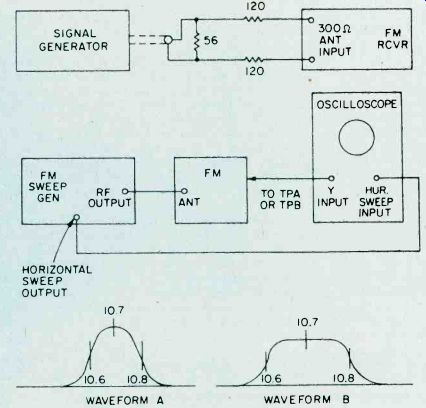 Fig. 6. Adjust the secondary of the discriminator transformer 'til it centers 10.7 MHz. As you progress with the IF alignment, you may find that you can lower the RF output of the signal generator to prevent overload of the receiver. When you are satisfied that all IF transformers are tuned so that no further increase in meter reading can be attained, the IF alignment is complete. The next set of adjustments will align the upper and lower settings of the tuning capacitor. This is accomplished in two steps, which will have to be repeated several times, since the adjustments have some interaction with each other. The initial adjustments are made at the high end of the broadcast band. Set the tuning dial to a silent point (where no radio station is received) near 1600 KHz. Set the RF signal generator to the same frequency. Adjust the two timer capacitor (C2 and C4 in Fig. 1) for maximum meter reading. Then set the tuning dial of the receiver to a silent point around 600 KHz. and set the signal generator to the same frequency. Adjust the oscillator tuning coil (T1 in Fig. 1) for maximum meter reading. Repeat the adjustments for 1600 KHz and 600 KHz as described above until no further improvement can be made. Once you have done this, the AM alignment will be completed. FM Receiver Alignment. Proper FM alignment requires the use of a sweep generator and oscilloscope, unless the receiver under test has a fixed tuned IF section which is permanently aligned at the factory. The generator may be coupled to the antenna terminals of the receiver using the circuit of Fig. 3, which matches the 50-ohm impedance of the generator to the 300-ohm input impedance of the FM receiver. Some receivers may have highly selective front ends which make injection of the 10.7 MHz IF through the RF stages difficult. In these receivers you may couple the output of the signal generator to the input of the first IF amplifier stage through a 10-pf capacitor. This point is shown in Fig. 2, as test point C. Use only sufficient signal strength to achieve a usable display on the oscilloscope. Fig. 4, is a typical connection diagram of the receiver, generator and oscilloscope. The first section of the FM receiver to be aligned is the IF amplifier. Set the signal generator to a center frequency of 10.7 MHz. and a sweep width of about 450 KHz. An FM sweep generator should have a marker system which allows you to identify the important frequencies of interest, such as 10.6, 10.7, and 10.8 MHz. These markers indicate the desired bandwidth of the IF amplifier. Connect the Y input of the oscilloscope to test point A of Fig. 2, and adjust the scope controls to obtain a display similar to Fig. 5. Adjust all IF transformers (T2, T3, & T4 in Fig. 2) so that the amplitude of the display is maximum, while preserving the symmetry of the waveshape at about 10.7 MHz. Bear in mind that low cost FM receivers will have a waveshape similar to that of waveform A, while high quality receivers will have the preferred waveshape B of Fig. 5. The next step is the adjustment of the Ratio Detector or Discriminator. Connect the Y input of the oscilloscope to test point B of Fig. 2, and adjust the secondary of the Ratio Detector or Discriminator transformer (T4 of Fig. 2) to place the 10.7 MHz marker at the center of the S curve, as shown in Fig. 6. Readjust the primary of the same transformer for maximum amplitude and straightness of the line between the positive and negative peaks. This completes the alignment of the IF section of the receiver. Trimmer. Adjustments. The final adjustments to the FM "receiver are made to the trimmer capacitors, which are connected in parallel with the main FM variable capacitors. These are shown in Fig. 2 as C1, C3 and C5. Note that some FM receivers, especially the higher quality ones, may have four such trimmer capacitors. These adjustments are made with the FM tuning dial set to near the high end of the range, (108 MHz). Set the FM dial to a silent point near 108 MHz. Set the signal generator to the same frequency as the dial setting, and couple the output of the generator to the antenna terminals of the receiver as shown in Fig. 3. Connect a DC voltmeter to test point A as shown in Fig. 2, and use only enough signal output from the generator to attain a reliable meter reading. Adjust C1, C3, and C5 as shown in Fig. 2, for maximum meter reading. As a final check, set the receiver dial to a silent point, near the low end of the range, 88 MHz, and set the generator frequency to the same frequency. Now, by varying the generator about 88 MHz while watching the DC voltmeter, you can determine how accurate the FM dial is. Keep in mind that if you do make this adjustment you will have to go back to 108 MHz and readjust the trimmer capacitors again. In addition, if you are working on an AM/FM receiver slipping the dial pointer will also require a realignment of the RF section of the AM receiver. For. these reasons it is not recommended that the dial be slipped unless it already has been placed far out of calibration through some previous servicing procedure. ======== ======== Signal PropagationThe propagation of all radio waves may be defined as: "The traveling of wave energy through the atmosphere." How do signals get from one side of the world to the other? The ionosphere, a region of the earth's atmosphere extending upwards from 50 to 350 miles (80-560 kilometers), has ionized layers with the ability to reflect electromagnetic energy of certain frequencies. The purpose of this article is to review, briefly, the components of the ionosphere, some propagation characteristics, and some ways that you can tell whether or not the amateur bands are in good condition for DX communications. ![]() Fig. 1. The diagram above shows the effects of interaction between three layers on the reflection of radio waves back to Earth receivers. ![]() Fig. 2. This diagram demonstrates the principle of skip. You can see effects of ionospheric refle