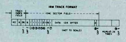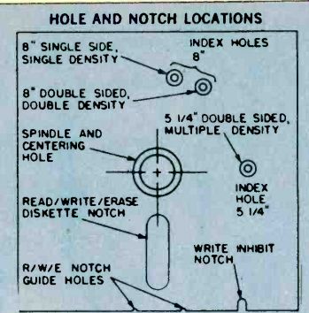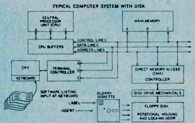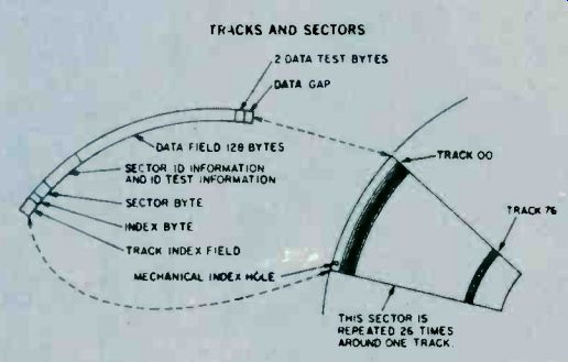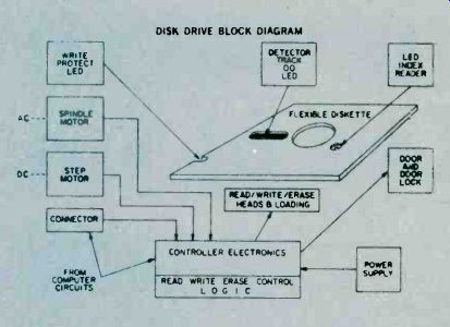 How Floppy Disk Systems Work Sooner or later just about every serious computer hobbyist reaches their computer's memory limit. There are some applications that require too much I/O action to be practical with a cassette based system or require too much memory space to fit in a RAM. It's this need for high-volume storage and rapid access time that makes a hobbyist disk system desirable. These systems don't come close to commercial hard disk systems in terms of performance but they can easily fill the computer hobbyist's memory bill. ![]() ----------- RELATIVE SIZE OF DISKETTE CONTAMINENTS---The metal oxide surface of a floppy disk is very sensitive to contamination. Each one of these contaminants (right) could cause a dropped bit. Since the disk is always kept in it's protective envelope, this is usually not too much of a problem in daily usage. Floppies have become the missing link to a midrange of random access memory systems. The floppy offers higher performance at lower cost than cassette and similar types of Input/Output (I/O) devices. Well Packaged. The present standard floppy is an 8-inch flexible disk of a plastic material coated with a magnetic oxide. Looking a little like a popular 45 RPM record, it is sealed inside a jacket and there are no grooves on the surface. The disk cannot be removed from the jacket which is designed to protect the recording surface. The disk is visible at a slot, a spot, and a hole in the center of the jacket. Users are told by the instructions that we must not touch exposed areas of the disk or write on it with anything firmer than a Q tip. Finally the user is admonished to return the jacketed disk to its outer envelope after they have finished using it. The natural skin oil of fingerprints can damage the quality of music in needle and groove recordings, and in the super-miniature world of floppies, a fingerprint can destroy an entire segment of data. A dust particle can waste a dozen sectors and a human hair can reduce the effectiveness of the Read/Write/Erase (R/W/E) heads. It is understandable why the media, as the flexible disk is sometimes called, is permanently sealed with all of those implicit instructions. There is, however, an internal jacket wiper that continually cleans the rotating disk and removes contaminants, and floppies are reasonably rugged. Hardware. The disk-drive hardware is add-on equipment to the main frame of the computer. Inside the drive are motors, driving mechanisms, and interfacing electronics that enable the drive unit to "talk" with the controller. The diskette is inserted into the drive unit through a small door in the front. Once the door is shut, it is locked by the drive unit logic until the door release button is pushed to disable the drive assembly. The drive spindle centers and grasps the center of the diskette firmly as the motor comes up to speed. During power-up the diskette reaches a speed of 360 RPM, and R/W/E heads are stepped out to track 00 and a mechanical index hole provides the first location pulse for disk timing. In the IBM format this is the only reference to a physical location on the disk. The floppy is firmly held against the recording surface, and the heads are positioned by a precise stepping motor. While the heads are positioned over the desired track, they ride above the spinning diskette. Once the correct track is located, in what is called a "seek operation," a head loading coil pulls the heads down onto the magnetic surface. This operation is called loading the heads and it is controlled by a computer program. When the heads are to be moved again, in another seek operation, to a new track, they are first unloaded, stepped to a new track, and then reloaded to a new track. This requires about three milliseconds per track of movement. It will further require about 50 milliseconds, per track, to move the heads and about 15 milliseconds of settling time. Part of System. Floppies should always be thought of as a part of a sophisticated cluster of mechanical drivers, computer electronics, and software called a computer. Fundamentally this computer consists of a central processor unit (CPU), some memory, some interfacing devices, called controllers here, and an entry device such as a keyboard CRT, and some software. Computer operation is made possible by a written program entered into the computer's memory and operated on by the internal microprocessor. The programs are fed by any one of a number of techniques: a paper tape punch, keyboard, cassette tape, or teletype. All of these are slow and time consuming. New ways are continually being introduced to feed the voracious appetite of computer memories. Floppies are the most versatile of the program instruction loading techniques In a computer's time frame things go on a million times faster than in our brain's time frame. In such a whirlwind existence, telling computers what to do was a difficult problem. The answer was in the development of software which the computer could store in memory for reference each time it needed a new program instruction. ![]() --------- READ/WRITE/ERASE OPERATION--There is no physical track on the disk as with an LP record. The tracks are formed by the passage of the record (write) head over the surface of the disk. The disk itself appears to be a solid sheet of recording tape material. Software. The computer-the IC's, printed circuit boards, filter capacitors, chassis, and power supply-are all part of the hardware. All of this state-of-the-art electronics is just so much junk without a program, a way to make the computer compute. The instructions, written in computer languages, are called software. We talk with the floppy (human to floppy) through a series of interpreters comprised of software and hardware. First we place our instructions, using perhaps, Fortran in a machine assembly language. Located within this language and acting as a general interpreter, is a section of software called a file manager. Its job is to