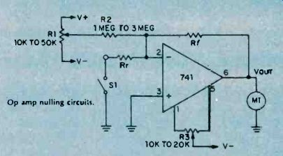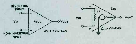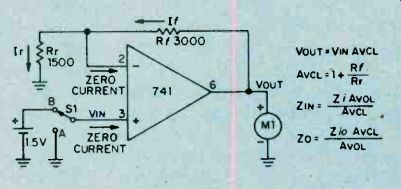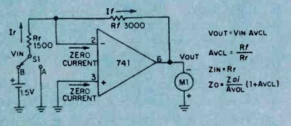 The resulting closed-loop gain, or AvcL, is unity (one unit out for one unit in). However, the high AvoL inside the IC itself is still present, enforcing close compliance with the several rules. As noted on Fig. 2, actual input and output resistances ZIN and Zo are much improved due to feedback. The resultant input resistance now equals Zi times AVOL or400,000 megohms for the741 op amp! The resultant output resistance now equals Zoi divided by AVOL, or .0035 ohms! Consequently, the unity gain follower can duplicate the input voltage at its output without loading down the input voltage source due to the high input resistance and with high accuracy due to the low output resistance. Actually, input and output resistances are degraded somewhat by secondary factors. Nevertheless, this unity gain follower offers the highest input resistance and lowest output resistance of the several basic circuits. Non-Inverting Voltage Amplifier. Stable op amp voltage amplification is obtained by feeding back only a portion of the output voltage. Alter your breadboard circuit to include feedback voltage divider resistors Rf and Rr, as shown in Fig. 3. With Rf equal to 2Rr,,only one-third of the output voltage is fed back to the inverting input. 1 With Si at position A, the + input is at ground voltage and the meter indicates zero. By rule 3, the ‘-‘ input is at virtual ground or zero. With zero voltage across Rr, current Ir is zero. In view of rule 2, If always equals Ir and is zero in this case. With zero current in Rf, the ‘-‘ input and the output voltage must be equal and zero in this instance. ![]() Fig. 4. The circuit arrangement of the op amp provides an inverting output with a gain of 3. Compare it to fig. 3. With S1 at position B, the + input is raised 1.5 volts and the meter indicates 4.5 volts. By rule 4, the ‘-’ input must rise to 1.5 volts matching that at the + input. The op amp does this by forcing a current into the feedback voltage divider as shown. With 1.5 volts across Rr, current Ir equals 1.5 volts divided by 1500 ohms, or 1 mA. Also, the voltage across Rf equals 1 mA times 3000 ohms or 3 volts. Thus, VOUT equals 1.5 plus 3 or 4.5 volts. Closed-loop voltage gain AVCL equals 1 + (Rf/Rr) or 3 in this case. Compared with the unity gain circuit, actual output resistance Zo is three times grater and input resistance ZIN is one third that of the unity gain circuit. This reflects the effect of feeding back 1/3 of the output voltage. To obtain a closed-loop gain of ten, resistor Rf must equal 9Rr, and so forth. Inverting Voltage Amplifier. Alter the breadboard circuit to that of Fig. 4 including reversal of the meter. With S1 at position A, the meter indicates zero. The proof of this result is identical to that of the non-inverting voltage amplifier with switch at position A. With S1 at position B, the meter indicates 3 volts (actually, minus 3 volts since the meter is now reversed). In this case, the ‘-’ input does not rise to 1.5 volts. By rule 3, with + input grounded, the ‘-’ input must remain at virtual ground. Therefore, and quite importantly, the voltage across Rr equals the input voltage, or 1.5 volts divided by 1500 ohms, or 1 mA, flowing in the direction shown. Since If equals 1 mA times 3000 ohms, or 3 volts. With the ‘-’ input at virtual ground, the output voltage must be minus 3 volts as indicated on the reversed meter. The closed loop voltage again, AVCL, is simply Rf/Rr, or 2 in this case. Quite unlike the previous cases, actual input resistance ZIN equals Rr, the input resistor. Compared with the unity gain non-inverting amplifier, actual output resistance Zo is greater by a factor of (1 + AvcL) or three times as much, still acceptable small at this (and even much higher) gain. By connecting additional input resistors to the ‘-’ input and upon applying several input voltages, the amplifier will sum the several input voltages at the output. For this reason, the amplifier is often termed a summing amplifier and the ‘-’ input is termed the summing node or input. ![]() Fig. 5. Using only one external circuit element, this op amp functions as a current-to-voltage converter. Current to Voltage Converter. A variation of the inverting amplifier, the current to voltage converter shown in Fig. 5, omits input resistor Rr. Because the ‘-’ input must remain at virtual ground for linear operation, this circuit cannot accept an input voltage. Instead, it accepts an input current and is used to measure very small currents. If IIN were 1 micro A, the output voltage would be 1 micro A times 1 megohm, or 1 volt. By making Rf very large, the circuit can measure extremely small currents. The input resistance of this circuit is zero. The output voltage, VOUT, equals IIN times Rf. If you breadboard this circuit, you may observe a small output voltage at zero input current. This output "offset" voltage is caused by the flow of a small bias current from output to input through the large feedback resistor, Rf. Unless special opamps having very low bias currents are used, it is necessary to include a nulling circuit to reset. Input Bias and Offset. Although rule 2 assumed zero input currents, an op amp does require a small input current Ib to bias the input stage into linear operation. For the 741, Ib may range up to 0.5 uA. The difference between the input bias currents at the two inputs is the input offest bias current ziio. This current is usually much smaller than Ib. Both Ib and Iio cause an objectionable output offset voltage with Rf is very large. To restore the output voltage to zero, add the nulling circuit potentiometer R1 and resistor R2 as shown in Fig. 6. With Si open, adjust the control until meter indicates zero. If Rr is small, and upon closing S1, you may observe that the meter again loses its zero. This is caused by the input offset voltage Vio resulting from slight mismatches of the input transistors. Input offset voltage Vio is defined as that input vo