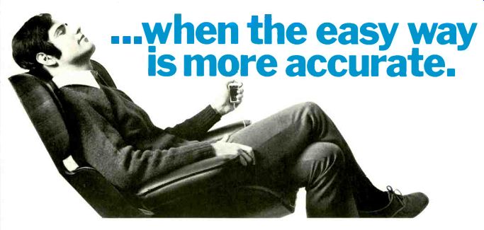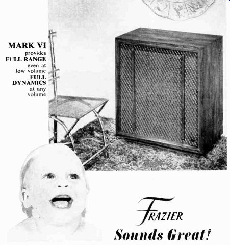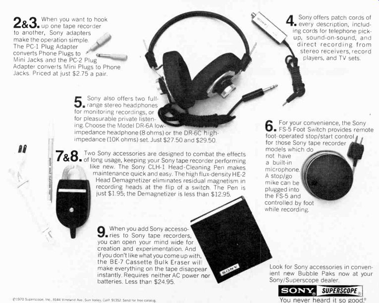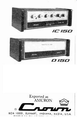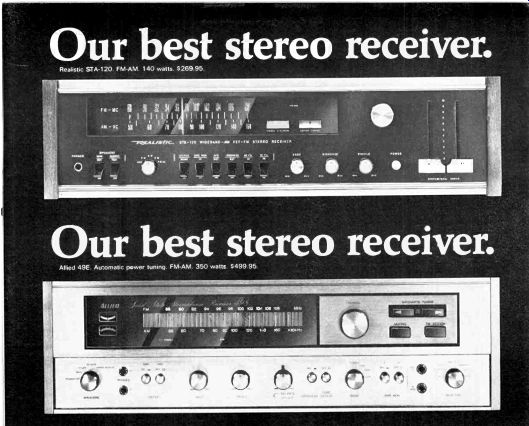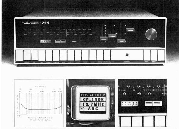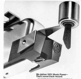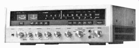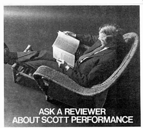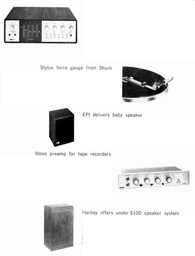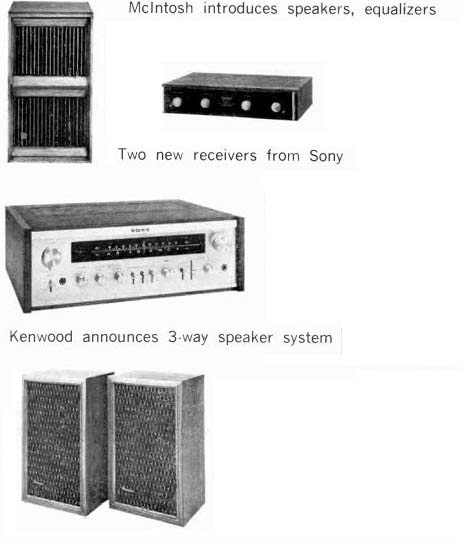 McIntosh introduces speakers, equalizers McIntosh, the Binghamton. New York manufacturer. has a new line of speaker systems which range from $312 for the MC IC, left, to $1.012 for the ML 4C, and which are or Mediterranean cabinet styles. Wide-angle dispersion of midrange and highs. and full. accurate reproduction of bass is claimed for all models. The company also is offering two versions of an "environ mental equalizer"-the MQ 102 corrects for left- and right-bass differences in a stereo system: the larger Model MQ 101. shown here, corrects the bass and the middles and highs too. ![]() ![]() Two new receivers from Sony Sony is offering two new stereo FM/AM receivers, the Models STR-6065 and STR-6055, priced respectively at $399.50 and $299.50. The sets are similarly styled, but the STR-6065 offers higher output power and greater FM sensitivity. Manufacturer's specs rate the STR-6065 for 70 watts per channel continuous power at less than 0.2 percent distortion, with an IHF sensitivity of 2.2 microvolts. The STR-6055 is rated for 40 watts per channel continuous power at less than 2 per cent distortion with an IHF sensitivity of 2.6 microvolts. Both units offer a full complement of features and con trols, including front-panel speaker selector, dual concentric tone controls, headphone jack, and an auxiliary (high-level) front-panel input for quick or temporary patching-in of an external source. The STR-6065 is shown here. Kenwood announces 3-way speaker system Kenwood's first speaker system. the KL-5060,incorporates a 12-inch free-edge woofer, a 6 1/2-inch midrange, and two horn-type tweeters. Crossovers are at 600 Hz and 5,000 Hz: a tone selector can adjust midrange and highs. The speakers are enclosed in an oiled walnut cabinet (with metal grille) that stands two feet high. Weight: 44 lb. Price: $139.95. --------- H-K delivers Citation Eleven preamp This second model in Harman-Kardon's Citation line was first announced some months ago and is now being shipped to dealers. The Model Eleven preamp provides both impressive specifications and versatile operating controls. The $295 preamplifier ($35 extra for oiled walnut enclosure) has abandoned normal tone controls, which cover a broad frequency spectrum, in favor of five calibrated slide-con trolled "audio equalizers." each of which permits adjustment of a portion of the audio band. A special defeat switch removes these equalizers from the circuit. A full array of controls includes high and low filters, and a selector for choosing one or both of two pairs of stereo speaker systems or two sets of low-impedance headphones. Manufacturer's specs claim frequency response within =0.5 dB from below 5 to 125,000 Hz. Residual noise level is given at 90 dB below rated output of 6 volts. Stylus force gauge from Shure A new stylus force gauge, claimed accurate within 0.1 gram up to 1 1/2 grams, is being marketed by Shure Brothers for $4.95. Designed as a positive counterweight balance, the Model SFG-2 can measure stylus pressures up to 3 grams. As shown in the accompanying photo. the counterweighted end of the gauge is aligned with the spindle. and the tone arm is placed over the opposite end with the stylus in a narrow groove. The measurement is then read on a scale. EPI delivers baby speaker EPI has announced the Model 50, a miniature (13 by 10 by 8 inches) $55 version of their larger bookshelf speakers, which consists of two acoustic-suspension drivers plus crossover in a solid walnut box. Frequency response is given at 50 Hz to 18,000 Hz ( ± 3 dB), and the system needs a minimum of 14 watts rms. Mono preamp for tape recorders Telex offers, in its new RP-84, a preamplifier specifically designed for recording and playback use with two- or three-head tape recorders. Because the adjustable bias oscillators can be synchronized when using several of the mono RP-84s, they can be used for multichannel setups-for instance in converting a stereo deck for four-channel use. A high-impedance phone jack and VU meter are incorporated into the Telex unit, which is priced at under $145. A rear-panel selector switch sets up the front-panel slow/fast switch to choose 1 and 3 3/4, 3 3/4 and 7 1/2, or 7 1/2 and 15 ips equalizations. The preamp is rated at 30 Hz to 18,000 Hz ± 3 dB at 7 1/2 ips. Hartley offers under-$100 speaker system Hartley-Luth's Zodiac II is, according to the manufacturer, its first full-range system below $100. Hartley claims the two-speaker system provides a response range of 40 Hz to 18,000 Hz at less than 1.5% distortion. It requires at least 15 watts of power per channel. Dimensions are 18 by 11 1/2 by 8 1/2 inches and it weighs 16 lb. A slightly larger and heavier three-speaker system for $135, the Zodiac III, is also available. Both come in either teak or rosewood. ===================== Vintage magazine ADs:Controls are of the Baxandall type. And there are high filters, loudness contour and tape monitoring switches. All the controls work on the front channels alone, the rear channels alone, or on all four simultaneously. ![]() ![]() The Fisher 701 is the first 4-channel stereo receiver. But we're predicting it will be the first of many. The Fisher 450-T, $399.95. The Fisher 450-T is similar, in many respects, to the 500-TX we describe above. It's got almost as much power (the 450-T has 180 watts), and most of the tuning convenience: the 450-T has AutoScan, plus flywheel tuning. And the $399.95 price includes remote-control AutoScan. The FM section, with 2.0 micro volts sensitivity, will bring in almost as many stations as the 500-TX's FM section, and with the same characteristic ally Fisher sound: clean and natural, at all frequencies. The man who wants to tune the easy way, electronically, more accurately than with the aid of a meter, a light or a 'scope, should start by looking at the Fisher 450-T. Shown in photo at right: The Fisher 500-TX, plus a pair of the world's finest bookshelf speakers (the 4-way Fisher XP-9C's, $199.95 each), F