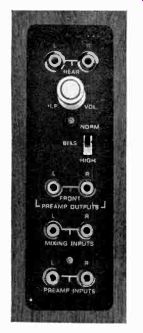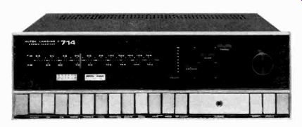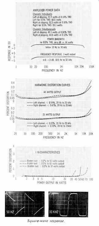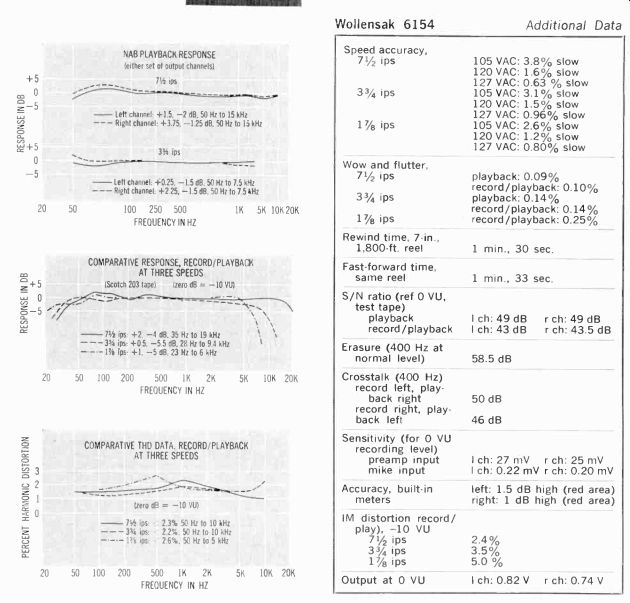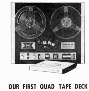 OUR FIRST QUAD TAPE DECK ![]() THE EQUIPMENT: Wollensak 6154, a three-speed (7 1/2, 3 3/4, 1 7/8 ips) stereo tape deck with built-in preamps; quarter-track stereo and mono record and playback, plus four-channel or quadriphonic stereo playback. Dimensions: in walnut case supplied: 16 1/2 by 6 by 13 5/8 inches. Price: $499.95. Manufacturer: 3M Company, 3M Center, St. Paul, Minn. 55101. COMMENT: For the pioneering audio enthusiast who wants to sample four-channel or quadriphonic stereo on open-reel tape (and still enjoy the usual facilities of a conventional tape deck), the 3M Company is offering its Wollensak Quad/Stereo series of which the Model 6154 is the deck version designed for hookup into an external sound system. The unit is, in brief, a home stereo tape machine with two additional playback channels. For quad sound, you connect the deck's four outputs to two stereo amplifiers which drive two pairs of (front and rear) loudspeakers. For conventional two-channel stereo, of course, simply ignore the outputs marked "rear" on the side cf the deck. The unit records in regular two-channel stereo or in mono, and it handles 'eels up to seven inches in diameter. To listen with headphones, there's a topside jack and a separate headphone level control on the side. Another useful feature is the 6154's bias switch for suiting the circuits to different kinds of recording tape, the high position being recommended for low-noise tape such as Scotch 203. A special pair of jacks permits input mixing via the left- and right-channel level controls on the front (or top, if you place the unit horizontally) panel. Each of these controls, by the way, must be moved past a detent position to snap on-a safety feature to avoid accidentally recording over an already recorded tape. A press-to-use record button, which must be operated together with the main start button, further ensures against accidental recording or erasure. For live recording you can plug microphone cables directly into jacks on the control panel. Additional features here include a tape/source switch for monitoring, a stop control, the fast-forward and rewind control, aid the unit's main power switch. Two VU meters, just above the left-hand end of the panel, come on with the power and operate for both recording and playback. Between the tape reels there's a four-digit index counter with reset button. Speed change is accomplished by moving a small slide switch located behind the head cover; this was judged a minor inconvenience. The tape, during record or playback, is held against the heads by pressure pads and a capstan idler which all move into place on their small carriages. Pressing the stop button releases both. There is thus no "pause" or editing control as such. However, you can press the start button and hold it down; this will put the tape in contact with the heads without activating the reels. Then by moving either reel with your other hand it is possible to find a specific passage for editing or splicing-again, slightly inconvenient, but only important to those who do a good deal of their own serious recording. Comparative record/playback response data taken at the unit's three speeds show very good performance at 7 1/2 ips: within plus or minus 3.5 dB from 35 Hz to 20 kHz, with the high end rolling off progressively at the slower speeds. NAB playback response was linear within a few dB at both the 7 1/2- and 3 3/4-ips speeds within the normally tested frequency limits (see accompanying graphs). Regular tape recorder functions aside, the big thrill with the Model 6154 came when we hooked it up to play four-channel tapes. We ran a set of output cables to one stereo amplifier and connected its out puts to a pair of front left and front right speakers. We ran another pair of cables to a second amplifier driving a pair of rear speakers. A few adjustments of the amplifier volume controls and we were ready. The 09-stage brass in the Berlioz Requiem really sounded as if they were coming from far off, through an imaginary hole 'n the side wall. Trick pop arrangements put sound all around us. And so on. Interestingly enough, these sonic-enhancement effects were fully perceptible in what must be classed as an aver age-small room, about 15 by 14 feet. It may be a quirk of irony but it seems to us that the small space of a normal-size room which must accommodate the added equipment needed for quadriphonic sound actually benefits from the added channels to a more dramatic extent than a relatively large room. We have heard quadriphonic sound in rooms ranging in size up to that of a small theater-and it seemed to us that the larger the room, the less overt was the quad effect. Be that as it may, our romp with the model 6154 demonstrated another thing: open-reel tape is the natural medium for four discrete channels; if quad sound succeeds in other formats-such as cassettes, cartridges, or discs-it will have to match some pretty high audio standards to do so. The other model in this series, the Wollensak 6364, comes with a built-in amplifier and carrying case at $599.95; the 6364 plus a pair of A-1050 pedestal-mounted speakers costs $659.95. ![]() --------------38 Connector panel on Wollensak sports extra pair of Output jacks for rear channels in quadriphonic play back. Front channel jacks also are provided, plus regular inputs, mixing inputs, bias switch. headphone level control. --------------------------- Wollensak 6154 Additional Data ![]() FEATURE-LADEN AUTOMATIC RUNS AT PERFECT SPEEDS ![]() THE EQUIPMENT: Dual 1209, anautomatic turntable with integral arm. Chassis dimensions: 13 by 10 1/4 inches; add 1 inch to rear and to right for tone-arm overhang; allow 5-inch clearance above and 2 3/4-inch clearance below mounting board. Price: $129.50. Optional walnut mounting base, Model WB-93, $12.95. Manufactured by Dual of West Germany; distributed in the U.S. by United Audio Products, Inc., 120 S. Columbus Ave., Mt. Vernon, N.Y. 10553. COMMENT: Excellen