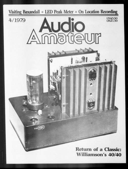 Volume 10, Number 4 October 1979 Contents Showcase--Leach and Jung turned out under a craftsman's hand; Editorials The Williamson 40/40, Power Amplifier--Return of an improved favorite after a decade Conversations with Peter Baxandall; Part 1--A visit with the designer of those fed back tone controls The Saga of Golden Ear and Meter Reader--Psychological distortions in the human as measuring device, by Rod Rees and Ron Shaffer A Power Meter---LEDs give better peak power clues than a needle in motion Location Recording Basics, by William F. Ruck, Jr. Audio Aids---On Heils, ladders, head leveling and Zeners. Kit Report: The Integrex Dolby Noise Reducer, by Fred M. Gloeckler, Jr. Test Report: The Jung-White PAT-5/WJ-1A, by David Vorhis. The Grounded Ear--What dbx is up to with discs, PML's mike, and Sony tape Classic Circuitry