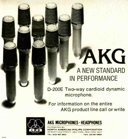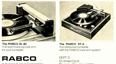 Pioneer SE-405 Stereo Headphones A new addition to Pioneer's growing line of stereo headphones is the Model SE-405, which features full-size acoustically isolating earcups and integral volume controls for each channel. Cushions for the earcups and the extendable (with detented action) headband are foam filled plastic; the cups and headband are linked by pivoted yokes. An 8-ohm dynamic element with a 13/4-inch polyester-film diaphragm is used in each earcup. Frequency range is stated as 20 to 20,000 Hz. Sensitivity is 0.3 volt for a sound-pressure level of 113 dB, and signal-handling capability is 0.5 watt. The coiled connecting cable, 161/2 feet long, is fitted with a standard three-conductor phone plug. Exclusive of the cable, the headphones weigh just over one pound. Price: $44.95, which includes a permanent storage case. Bostedt "Superbend" Speaker Systems INTERNT’L ENTERPRISES COMPANY is importing the Swedish made Bostedt "Superbend" speaker system, a two-way design of markedly distinctive appearance, utilizing an enclosure molded of high-impact plastic. The two drivers-a 5-inch mid-range/woofer (approximately the same diameter as the stovepipe-shaped enclosure) and a 1.5-inch tweeter-radiate horizontally from behind an anodized wire-mesh grille. According to the manufacturer, the balance of high frequencies to low frequencies can be altered by aiming the speaker toward or away from the listening area. Frequency response is 65 to 14,000 Hz ±3 dB, with a 12-dB-per-octave cross over network dividing the frequency band between the two drivers at 1,800 Hz. Nominal impedance is 8 ohms, and minimum recommended amplifier power is 15 watts per channel. Power-handling capability is 35 watts per channel continuous. The Superbend is available in glossy colors of white, black, and red-all with a black grille. The overall dimensions are 12 x 7 1/4 x 6 1/4 inches. Price: $125. Teac Model 360S Stereo Cassette Deck THE Model 360S, the latest cassette deck from Teac, has a transport mechanism with performance comparable to that of Teac's deluxe Model 450 as well as many of the operating features of the more expensive machine. Dolby B-Type noise-reduction circuitry is incorporated. with all calibration controls accessible to the user. Bias and equalization are switchable for CrO2 "high-performance," and standard tapes. In the CrO2 position the playback equalization is also altered to the values recently proposed for that tape type. Two large recording level meters are supplemented by a peak indicator- a light-emitting diode that warns against overload on short-term transients. Slider-type recording- and playback-level controls are used. There is a switchable multiplex filter to remove the 19-kHz pilot signal from stereo FM broadcasts, and a memory-rewind feature that automatically stops the tape at a point preselected on the three-digit index counter. With CrO2 tape, the frequency response of the 360S is 40 to 15,000 Hz +- 3 dB. Response is within the same tolerances to 13.000 Hz with high-performance tape, and to 10.000 Hz with standard tape. Signal-to-noise ratios are 60 dB with Dolby, 50 dB without. Wow and flutter are 0.07 percent. The micro phone inputs have an impedance of 600 ohms; adjacent to them is a stereo head phone jack. that will drive 8-ohm phones. The Teac 360S comes mounted on a wood base; dimensions are 17 3/4 x 4 3/4 x 10 1/4 inches. Price: $359.50. Soundcraftsmen PE2217 Stereo Preamp-Equalizer HAVING offered elaborate one- and two-channel multi-band equalizers for some years, Soundcraftsmen has now added signal-switching and magnetic phono-input facilities to their ten-band stereo equalizer to create the Model PE2217 Preamp-Equalizer, a unit de signed to function as a highly flexible integrated control center for a two-channel stereo system. While VOLUME and BALANCE are conventional knob adjustments, all the frequency-related functions of a typical preamplifier-bass and treble adjustment, filters, loudness compensation-are handled in the PE2217 by the equalizers. The equalizers have ten slider-type controls for each channel spanning a range of ±12 dB, acting at the center frequencies of the ten octaves of the audio-frequency band. Gain-control sliders adjust the output levels of the equalizers; LED (light-emitting diode) indicators permit the equalizers to be set for unity gain to facilitate A-B comparisons with the unequalized signals and to prevent overload of subsequent stages. The remaining PE22 17 controls are all pushbuttons. They activate the I.ED indicators, select reversed stereo, left or right channel to both outputs, or mono, and operate tape-monitoring functions for two stereo tape decks, permitting dubbing from either one to the other. The inputs for two magnetic-phono sources, tuner, and auxiliary are also pushbutton-selected. The equalizers can be switched to affect only the "to tape" signals, the preamplifier output signals, or both. There are tape-dubbing jacks and two stereo headphone jacks on the front panel, and two sets of outputs and six a.c. convenience outlets on the rear panel. The rated output of the PE2217 is approximately 5 volts for load impedances ranging from 600 to 2,000 ohms, with harmonic and intermodulation distortions of less than 0.02 percent. Signal-to-noise ratios are 80 dB for the phono inputs, 95 dB for high-level in puts. Frequency response with the sliders centered is 10 to 100,000 Hz-0.25 dB. The preamplifier measures 20 x 7 1/4 x 11 3/4 inches. Price: $499.50, which includes a walnut-grain cabinet or optional hardware for rack mounting of the unit. ![]() Sanyo RD 4350 Dolby Stereo Cassette Deck THE top model in Sanyo's growing line of Dolbyized stereo cassette decks is the Model RD 4350, equipped with a ferrite record/playback head, a memory-rewind feature that halts the transport at any preselected point on the tape, and a novel tilt-up instrument panel that cants the recording-level meters for easier viewing. Seven piano-type push 