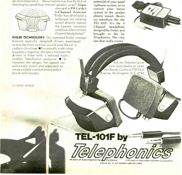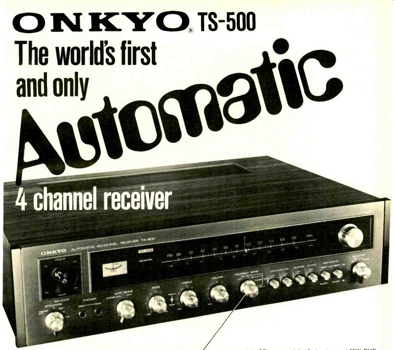 The Only Headphone with Full 4-Channel Separation At long last, there's a quadraphonic headphone that really works: TELEPHONICS TEL-10ff. Based on a technological breakthrough (the "Fixler Effect") the TEL-101F Headphone provides the ambience, separation and realism That only true quadraphonic sound can give. And no other headphone on the market uses the "Fixler Effect!' It's, a Telephonics' exclusive. Modern Hi-Fi and Stereo Guide said, "The new phones put the sound outside your head in a 360 degree circle, just as loudspeakers do!' In Popular Mechanics Robert Angus said, "Fixler Headphones- the only one we've found that really reproduces the 4-Channel speaker experience ... the sensation was exactly that of listening to a good four channel speaker array!' Angus also said in FM Guide's 4-Channel Forecast "Fixler has developed a technique for creating sound directly behind the listener, currently unobtainable with four channel headphones" FIXLER TECHNOLOGY The patented Fixler concept features specially designed drivers positioned so that the front and rear sounds pass the ear in realistic directions. For smooth, wide-range frequency response, the space between the drivers is filled with a selected foam-another Telephonics exclusive. To complete the design, the signals are judiciously mixed and separated to create a whole world of sound within two 4-inch earcups. ![]() US PATENT 3609240 CONVERT STEREO TO 4-CHANNEL Adding the TEL-101A QUADRAMATE to your "Fixler Effect" headphone lets you create 4-Channel sound/from your present stereo system. It's not as impossible as it seems. When a stereo recording is made, sounds reflected from the rear walls enter the microphones at different times and levels. To extract these reflected sounds and play them back through the rear head phone speakers, QUADRAMATE subtracts, adds, and mixes the stereo channels to let you hear reflected sounds from behind, where they belong. To enjoy the full potential of your quadraphonic system, or to convert your stereo system to the quadraphonic sound, there's no substitute for the TEL-101F. It's the 4-Channel headphone designed by Fixler, and brought to life by Telephonics. The only one that really works. Ask for Telephonics at your local dealer, or write our Sandy Curtis at 770 Park Avenue, Huntington, N.Y. 11743. 40 years of Audio Engineering Excellence A Division of instrument Systems Corporation ----------------------------- COMPLETE SET OF MATCHED STORAGE CASES ![]() (A) 60-unit cassette case. 13 1/2" high x 12 1/2" deep x 5 1/2" wide. (B) 30-unit cassette case. 13 1/2" high x 6 1/2" deep x 5 1/2" wide. (C) 12-unit cartridge case. 1314" high x 6 1/2" deep x 414" wide. Units A, B and C have tilted compartments to prevent spillage and include pressure sensitive labels for titling. (D) 6-unit 7" reel case. 8" high x 7 1/2" deep x 5" wide. Holds reels in original boxes. (E) 20-unit 12" record case. 13 1/4" high x 12 1/2" deep x 3 1/2" wide. Holds records in original jackets. Here's the ideal solution to the problem of keeping your records and tapes stored conveniently and attractively. Now you can keep them side-by-side on your bookshelf or cabinet, easy to identify and readily available. Sturdily constructed and covered in a handsome leatherette, the outer case is elegantly embossed in gold and comes in your choice of three popular decorator colors-black, brown and green-lending themselves readily to the decor of any room. One Park Avenue, New York, N.Y. 10016 My remittance in the amount of $ is enclosed for the cases indicated. Signature 60-unit Cassette Cases @ $15.95 each; 3 for $45.00 30-unit Cassette Cases @ $11.95 each; 3 for $33.00 12-unit 8-Track Cartridge Cases @ $7.95 each; 3 for $22.00 6-unit 7" Reel Cases @ $5.25 each; 3 for $15.00 20-unit 12" Record Cases @ $5.95 each; 3 for $17.00 Add 50c per unit ordered for postage and handling. Outside U.S.A. add $1.00 per unit ordered. Payment must be enclosed with order if not charged. Check color choice for back of case (sides in black only): Brown Green Black Print Name Address City, State Zip -------------------- ONKYO TS-500 The world's first and only Automatic 4-ch receiver. Stack your 4-Ch. records in any sequence. ![]() ![]() Sit back, relax and enjoy CD-4, SQ or QS (RM) Automatically! And, for that matter, any and all matrix systems that have been developed! This revolutionary instrument from Onkyo lets you hear it all with one switch setting-"Automatic" There's no confusion. No guess work about proper system choice. No control switching or resetting And, no deciphering of record jackets. Now, you can mix all of your 4-channel records in any sequence , . . and include your 2-ch. stereo discs. Then, sit back and immerse yourself in fine Onkyo sound. The secret is in Onkyo's logic and analog computer circuitry which Automatically demodulates and decodes any 4-ch. program in any sequence. The TS-500 delivers 25W RMS power per chan. 8 ohm, 4-ch. Artistry in Sound driven. It is BTL strapped for 2-ch. stereo at 50W RMS power, 8 ohm, per channel. A 4 channel balance control, continuously variable, provides ideal program balance. And, you may use the manual switch control for selection of any individual 4-ch. mode. All functions, 4- Ch. and Stereo. Automatically light up on the dial for at-a-glance convenience. The TS-500 features differential and direct coupled amplifier circuitry to assure superb response and broad power bandwidth. FM sensitivity and selectivity are unparalleled. Distortion at rated power is a conservative 0.5%. $749.95. SPECIAL FREE OFFER! Famous "Project 3/Popular Science 4-Ch. Test Record Albums for CD-4 & SQ. Both FREE with purchase of Model TS-500. Set up, calibrate & check out your quad system! Offer limited. Ask your dealer. EXTRA-COURTESY OFFER! Onkyo makes it easy for you to check out your own 4-Ch. system for proper operation. Order these unique test records today. $4.49ea. 2 for $8.00 Send check: Project 3 Test Records : 1133 Ave. of 