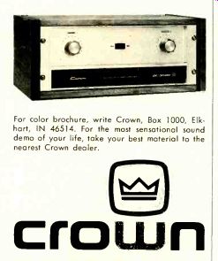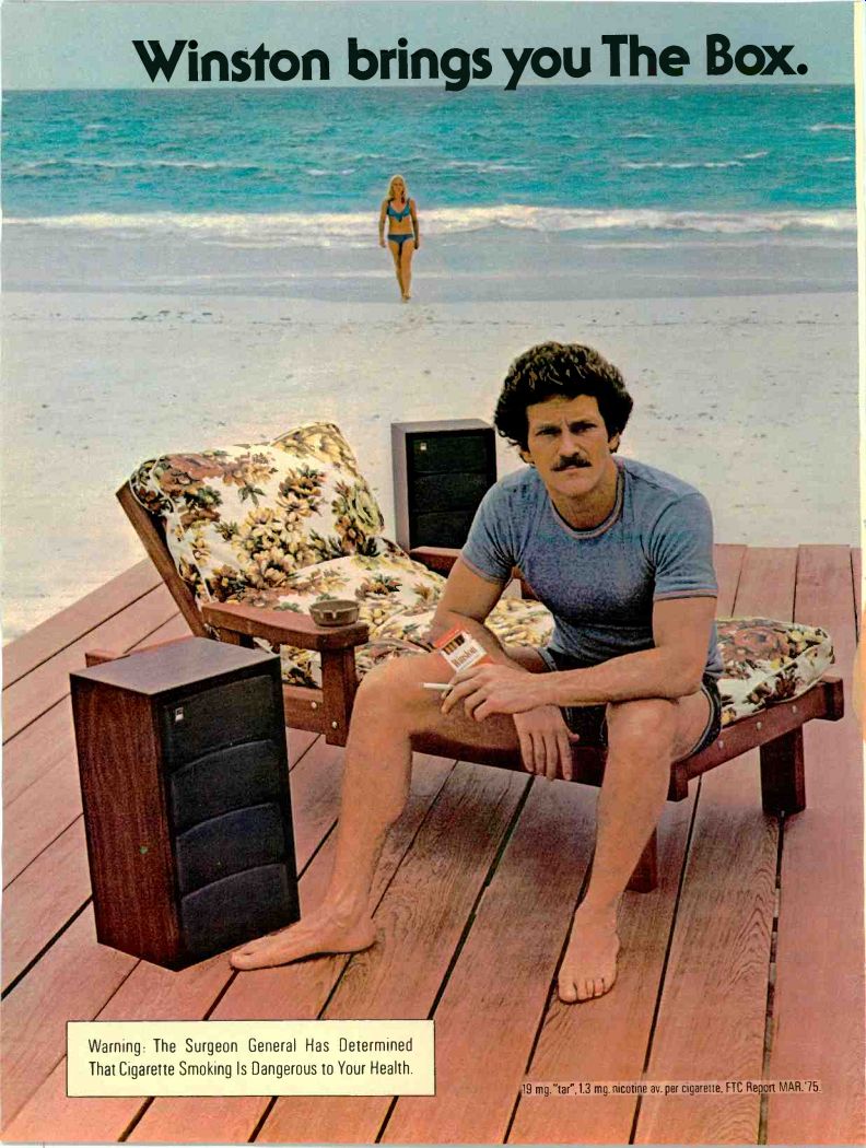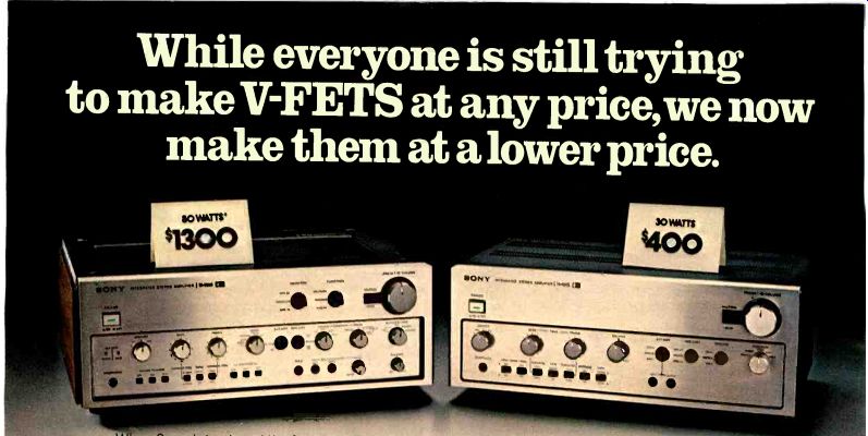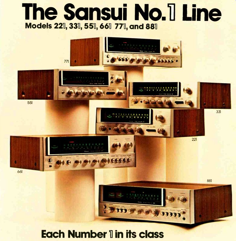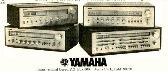 ![]() . The Sansui No.T1 LineModels 221, 331, 551 , 661, 771, and 881 Each Number 1 in its class. You are looking up to the finest stereo receivers today's technology can produce. Each a leader in its class. From the 8 and 12 watts per channel minimum RMS into 8 Ohms load from 40 Hz to 20 kHz with no more than 1.0% total harmonic distortion for the new Sansui 221 and 331 to the 63 wafts per channel, minimum RMS into 8 Ohms from 20 Hz to 20 kHz with no more than 0.3% total harmonic distortion for the full-feature top of the line Sansui 881. From $169.95 to $529.95, every Sansui delivers sophisticated electronics, flawless styling and superb convenience. You can enjoy listening to them at your franchised Sansui dealer. For even more enjoyment, you can own One. SANSUI ELECTRONICS CORP. Woodside, New York 11377 Gardena. California 90247 SANSUI ELECTRIC CO LTD . Tokyo, Japan SANSUI AUDIO EUROPE S A Antwerp, Belgium ELECTRONIC DISTRIBUTORS ( Canada)_ Turn on the Fisher.![]() You'll get a 3-head Dolby deck that leaves you some money for tape. There's no way-to know exactly what you're recording unless your tape deck has a third head for monitoring. But three-head cassette decks have always cost a lot of money. Not any more Now there's the Fisher CR-5010. Its suggested retail price is just $229.95, and it has every thing you need. The monitor head lets you listen to sound immediately after it's recorded. So you can be sure that your connections are secure, your mikes are in the right place, and your levels are OK. Dolby noise reduction cuts down the hiss and greatly improves the signal-to-noise ratio. Switchable equalization makes the most of the new tapes. And there's automatic shut-off and a precision pause control to make it all convenient. You can spend a lot more for a 3-head Dolby deck. But if you want the most music for your money, turn on the Fisher CR-E010. Fisher, 11-40 45th Road, Long Island City, N.Y. 11101 BOSE ON QUALITYThe 1801 Power Amplifier. ![]() Much of the quality that distinguishes a truly outstanding electronic instrument from the average product goes unseen. It lies it the concern and skill of the design engineer, conservative rating of components, and extreme care in manufacturing. For example, power transistors are costly. Yet using a large number assures that each works within its safe-area rating under any load and signal conditions. The 1801 uses 2b such power transistors. A large power transformer is costly and heavy. In the 1801 the transformer is very large to provide tight regulation of supply voltages, providing very large power output with minimum stress on the output transistors. Large amplifiers undergo unusual stresses during turn-on. The 1801 has a relay operated start-up circuit that limits currents and voltages in the power supply circuits during turn-on. Yet what is on the surface perfectly complements the underlying quality of construction and design. 1300 square inches of heat sink. Two oversize VU meters. A two-position in 3ut selector. Individual gain controls for each channel. A three-position speaker selector. And a light emitting diode display of power output. The size, power and features of the 1801 are not for everyone. But for the nearest approach to the ultimate... in quality of design, construction, and performance ... there is no other amplifier. The 1801. By Bose. The Mountain, Framingham, Mass. 01701, USA. ![]() ![]() Winston brings you The Box.Warning: The Surgeon General Has Determined That Cigarette Smoking Is Dangerous to Your Health. The Box brings you Fisher Quad. Fisher Quad System from Winston Box. Only $ 449.00. An $849 value. Manufacturer's Suggested Retail Price Relax, flip on the Fisher Quad. Reach out, flip open The Winston Box. Let four speakers surround you in sound while you light up and enjoy Winston. The sound is real enough to touch. The pleasure is real enough to taste. Fisher Quad and The Winston Box. They're both for real. Winston/Fisher Quad System Pease send me the Fisher Quad, complete with the Fisher guarantee. Winston Boxes. Offer available to persons 21 years of age or over. Allow 4-6 weeks for delivery Offer expires 12/31/75 Offer good in U S A Void where prohibited The Fisher 220X Automatic Turntable with Diamond Stylus and Dust Cover ![]() Crown POWER reveals a new level of listening.Discover the five elements of Crown power that make hearing the DC300A such a unique listening experience. Extreme low distortion: Maximum total harmonic and intermodulation distortion of 0.05% over a bandwidth of 1-20,000 Hz. Such minute levels made it necessary for Crown to design its own intermodulation distortion analyzer, now in use industry wide. Continuous power: 155 watts/channel minimum RMS into 8 ohms stereo, 310 watts minimum RMS into 16 ohms mono, over a bandwidth of 1-20,000 Hz. Complete protection: The DC300A is fully protected against shorted loads, mismatched connections, overheating and excessive line voltage, input overload as well as RF burnout. And this amp will drive any type load, resistive or reactive. Uncommon reliability: The DC300A's big name rock groups demand DC300A's be cause of their rugged ability to withstand tour-long punishment and still produce flawless sound. And major recording studios insist on Crown to keep time losses at a minimum. The professionals know from experience Crown's unqualified dependability. Exclusive warranty: Crown's unique warranty covers not only parts and labor but round-trip shipping for three years. These shipping costs are an important factor in our warranty, and it is not surprising that no other amplifier manufacturer offers this service. For color brochure, write Crown, Box 1000, Elkhart, IN 46514. For the most sensational sound demo of your life, take your best material to the nearest Crown dealer. Crown—When Listening BECOMES an Art. ![]() Technics by PanasonicMany receivers may give you all this. But they cost a lot more. Technics SA-5150 Power and Price At $229