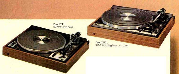 ![]() ![]() Every Dual, from the 1225 to the CS701, is designed to fulfill one basic concept: to provide more precision than you are ever likely to need. Perhaps this is why more component owners-audio experts, hifi editors, record reviewers and readers of the music/equipment magazines-own Duals than any other turntable. These serious music lovers, whose investment in records typically exceeds their investment in equipment, prefer Dual for only one reason. Quality. Until recently, Dual quality has been available only with fully automatic turntables with both single-play and multi-play facility. Now the choice is much broader. Of the seven Dual models, three are single-play only. Two of these are fully automatic; one is semi-automatic. Dual turntables also use all three types of drive systems: belt, rim and direct. The way a tonearm is moved to and from the record is not critical. Nor is the type of drive system. What is critical is how faithfully the tonearm permits the stylus to follow the contours of the groove and how accurately and quietly the platter rotates. If precision performance and reliability are of primary importance to you-as they should be you'll find them in every Dual. Dual 1225, $139.95, less base ... with the 1225, the lowest priced Dual ... all the turntable you may ever need. The Dual 1225 is a perfect example of Dual's basic concept: to build every Dual turntable with more precision than you are ever likely to need. The 1225's vernier adjustable low-mass counterbalanced tonearm can track flawlessly at as low as one gram. Stylus pressure is applied exactly as in every Dual, around the vertical pivot and perpendicular to the groove, maintaining perfect balance in all planes. Anti-skating force is also applied exactly as in every Dual, with separate calibrations for conical, elliptical and CD-4 styli. Other features the 1225 shares with all other Duals include pitch control variable over a 6% range (one semitone) and cue-control viscous-damped in both directions to prevent bounce. The powerful hi-torque motor maintains speed within 0.1% even when line voltage varies as much as 20%. The hefty 3% pound, 10%" diameter platter provides effective flywheel action to minimize the audible effect of any possible speed variation. There are two other models in this series, each with additional refinements. The 1226, priced at $169.95, has a one-piece, die-cast platter and a single-play spindle that rotates with the record. The 1228, priced at $199.95, has-in addition to these-a tonearm mounted in a four-point gimbal suspension, synchronous motor, built-in illuminated strobe and adjustable stylus angle to provide perfect vertical tracking in both single and multi play. Dual CS701, $400, including base and cover ...with the CS701, the quietest turntable ever made. Independent test reports on the electronic direct-drive Dual CS701 have been extraordinary. One reason is that all reviewers acknowledge the CS701's performance to be superior to the measuring capabilities of test instruments. For example: Hirsch-Houck Labs in Stereo Review found the wow level of the CS701 "Essentially at the residual level of our test record-about 0.03 percent." So did Popular Electronics. The Feldman Lab Report in FM Guide was able to detect "no flutter whatsoever!' Stereo & HiFi Times said "arm friction was lower than my capability to measure reliably." It takes very advanced engineering to achieve this level of performance. For example: the motor's unique double field coil produces a perfectly consistent rotating field with no magnetic flux irregularities. Another example: two specially tuned mechanical anti-resonance filters located within the tonearm counterbalance absorb resonant energy that would otherwise transmit acoustical feedback to the stylus. The result: cleaner and smoother frequency response. The reviewers also reached unequivocal conclusions about the CS701 performance. Note the absence of such qualifiers as "one of the" or "among the." For example: High Fidelity said: "..The Dual 701 has placed itself in the select group of products against which we must measure the performance of others." And the highly conservative English publication, HiFi News & Record Review: "The experience of listening to records of the highest quality on this turntable is not likely to be forgotten ...you will never again be satisfied with anything less perfect!" ... with the new Dual 1249, which will give you more reasons than ever to own a Dual. The new 1249, successor to the 1229Q, provides every feature, innovation and refinement of that highly-acclaimed model, plus some new ones. The 8%." tubular tonearm pivots in a newly designed four-point gyroscopic gimbal, suspended within a rigid frame. In single play, the tonearm parallels the record to provide perfect tracking; in multi play, the. Mode Selector lifts the entire tonearm to parallel the center of the stack. The tonearm can be set on the record manually or by using the viscous-damped cue-control or by simply pressing the automatic switch. In addition to single play and multiple play there is also the option of continuous repeat. The dynamically-balanced cast platter and flywheel are driven by an 8-pole synchronous motor via a precision-ground belt. Pitch is variable over a 6% range and can be set to exact speed by means of an illuminated strobe, read directly off the rim of the platter. A similar model, the 601, is available at lower cost ($249.95), without multi-play facility. A third Dual in this series, the 510 ($199.95) has a semi-automatic tonearm with a mechanical sensor that indicates when the tonearm is positioned precisely over the lead-in groove of a 12" or 7" record. At the end of play, the tonearm is automatically lifted by the cue-control and the motor shuts off. United Audio, 120 So. Columbus Ave., Mt. Vernon, N.Y. 10553 Exclusive U.S. Distribution Agency for Dual Also see: Source: Stereo Review (USA magazine) |
