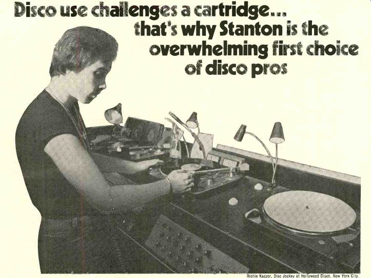 ![]() Disco use challenges a phono cartridge ... that's why Stanton is the overwhelming first choice of disco pros.Discotheques represent one of the most grueling professional situations for a pickup that can be imagined. Not only must the cartridge achieve a particular high level of sound excellence, it must do so in the "live" environment of back cueing, slip cueing, heavy tracking forces, vibration and potential mishandling where a damaged stylus means much more than lost music, it means lost business. The Discotheque is a commercial venture. It must have as little "down time" as possible ... that is why disco operators look for durability and reliability in their equipment. And, that is why leading dealers and professional distributors recommend the Stanton product for this purpose. Richie Kaczor, Disc Jockey at Hollywood Disco Stanton has two cartridges eminently suited to Discotheques, both designed with optimum ratios of vertical stylus force, compliance, stylus shank strength ... the calibrated 681SE, which possesses superb audio performance, and the more modest 500AL. Both are tough. Both perform beautifully, and dependably. And that's what a Discotheque needs. Whether your usage involves recording ... broadcasting ... disco or home entertainment, your choice should be the choice of the Professionals ... STANTON. For further information write: Stanton Magnetics, Inc. Terminal Drive, Plainview, New York 11803. New York City. Or: Use your Stanton to play these: GREAT MEN OF MUSIC (Time-Life Music series) Also see: Source: Stereo Review (USA magazine) |