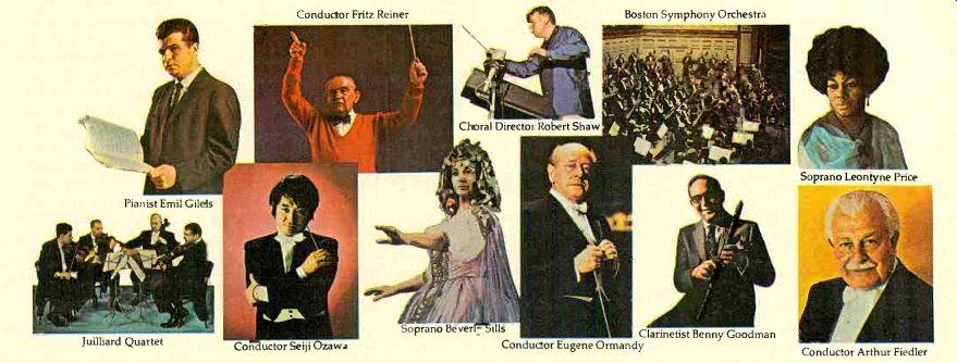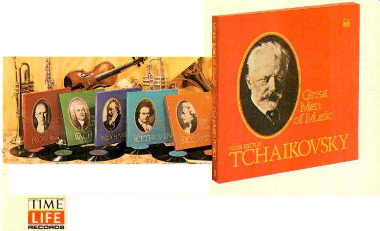 ![]() The World's Great Performers Play The World's Great Music. Everywhere they appear it's "Standing Room Only." And you'll find out why when you hear the world's most celebrated musical artists (some of them are pictured below) in TIME-LIFE RECORDS brilliant new series, GREAT MEN OF MUSIC. You'll hear Van Cliburn re-create the performance that won him the Tchaikovsky Competition in Mos cow . . . Eugene Ormandy conduct the Philadelphia Orchestra in Mozart's powerful Jupiter Symphony . . . Arthur Fiedler lead the Boston "Pops" through the bubbling Suite from The Love for Three Oranges. . . . Here is a complete home library of legendary performances, all re corded in the highest quality stereo sound. Featuring: Juilliard Quartet Conductor Fritz Reiner Conductor Seiji Ozawa Boston Symphony Orchestra Soprano Beverly Sills Clarinetist Benny Goodman Conductor Eugene Ormandy Soprano Leontyne Price Conductor Arthur Fiedler ![]() Just as you cannot understand a great painter by looking at a single picture, you cannot know and appreciate a great composer by hearing just one or two of his works. Now you can collect a sumptuous library of albums, each devoted to the masterworks of one immortal composer -- Beethoven, Bach, Mozart, Handel, Prokofiev, Rachmaninoff, and others. In each four-record album you hear a superb selection of the forms in which each composer worked- sonatas, concertos, symphonies, tone poems. . . . And as you hear a variety of compositions by a single composer . . . as you compare one composer's work with another . . . as you follow the extensive notes that explain what each composer was trying to do and how he achieved his effects . . . you will come to appreciate the greatness of great music as you never have before. Here is a genuinely new and exciting approach to music that can open up a whole new world of taste and pleasure for you and your family. You can discover how richly rewarding an experience great music can be by auditioning the first album in GREAT MEN OF MUSIC for 10 days free. You'll receive four records of the stirring, melodic music of Peter Tchaikovsky, lavishly packaged, plus the deluxe edition of The Golden Encyclopedia of Music (a $45.87 value in all). It's just $17.95 plus shipping and handling if you decide to buy- yours to examine for 10 days free by returning the attached card, or writing to: Time Life Records, Time-Life Building, Chicago, Ill. 60611. Each album contains four stereo LP records engineered by RCA to the highest standards of recorded excellence accompanied by a handsome 24-page booklet illustrated in color and black and white packaged in a sumptuous, heavy duty box. GREAT MEN OF MUSIC. Give them your own audition for 10 days...FREE Also see: CLASSICAL DISCS and TAPES Source: Stereo Review (USA magazine) |