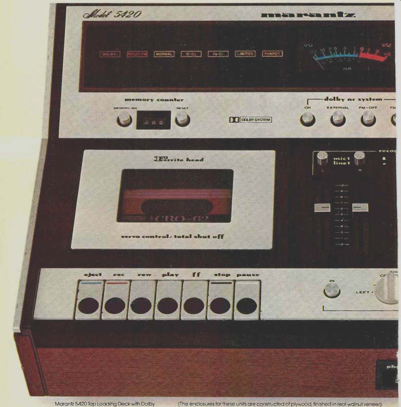 ![]() ![]() ![]() Marantz Stereo Cassette Decks--- the decks that live up to their name.----------- [1] 3- 1/2-inch professional VU meters with peak LED overload and lighted function indicators. Exceptionally large, readable VU panel features special Light Emitting Diodes that illuminate when recorder is overdriven by a high level signal. Illuminated function indicators tell you at a glance which function is in operation. [2] Built-in Dolby System that works with built-in mixing console; also permits external Dolby processing on other tape recorders. Instantly switches for external Dolby encoding on reel-to-reel decks. Has 25 microsecond de-emphasis switch for FM Dolby. Works in conjunction with built-in mixer for Dolbyizing multiple input sources. [3] One button each for Normal, CrO2 and FeCr tapes automatically selects both bias and EQ. Eliminates confusing combination adjustments of separate bias and EQ switches. Single control calibrates both bias and EQ automatically for best frequency response on any cassette tape. [4] Full 4-input mixing console with pan pot and master gain control. Four inputs-any combination of mic and line-are operated by four individual slide potentiometers plus one master gain control for fade-in/fade-out. Two pan pot controls permit inputs 3 and 4 to be assigned to either left, center or right stage. Can operate as a separate mixing panel for master-quality recordings with external tape recorders. [5] Built-in adjust able stand that changes the angle of the control panel from flat to 20 degrees. Angles top loading decks for most suitable viewing and operation. ------- Marantz cassette decks. Performance and sophistication that surpasses every other deck line on the market. Quality and technical excellence equaled only by Marantz receivers, components and speaker systems. Top loading. Front loading. With Dolby. Without Dolby. The Marantz cassette deck line lets you select a model that exactly suits your needs. Six decks in all, with design features as exciting as their performance. The Marantz 5420 top loading deck with Dolby for example, keeps wow and flutter down to 0.07%. Plus, it offers a wide frequency response (30 Hz to 17 kHz) and an exceptionally high signal-to-noise ratio (up to 60 dB). Other outstanding features include long-life ferrite heads, sophisticated DC servo drive systems with total shut-off and memory tape counters. See the complete Marantz line at your local Marantz dealer. Send for a free catalog. We sound better. Marantz 5120 Top Loading Deck with Dolby Marantz 5220 Front Loading Deck with Dolby (Cabinet optional) Not shown. Marantz 5400 Top Loading Deck without Dolby, Marantz 5200 Front Loading Deck without Dolby, and Marantz 5020 Front Loading Deck with Dolby. 'Dolby System under license from Dolby Laboratories, Inc. 1976 Marantz Co., Inc., a subsidiary of Superscope. Inc.. 20525 Nordhoff St., Chatsworth, CA 91311. In Europe: Superscope Europe, S.A. Brussels. Belgium. In Canada: Superscope Canada. Ltd. Ontario. In the Far East, Marantz For East, Tokyo, Japan. Prices and models subject to change without notice. Consult the Yellow Pages for your nearest Marantz dealer.