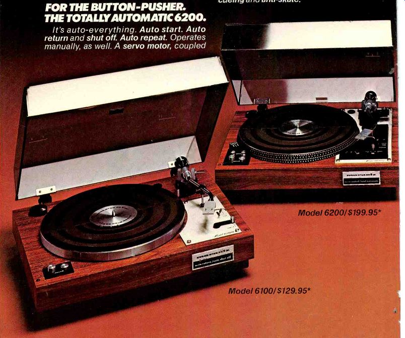 High on performance, the belt-drive 6100 features a super-dependable AC synchro nous motor. The convenience of auto return and shut off, Plus full protection of your valuable records with a precision S shaped tone arm, gentle-action viscous-damped cueing and anti-skate. FOR THE BUTTON-PUSHER. THE TOTALLY AUTOMATIC 6200. It's auto-everything. Auto start. Auto return and shut off. Auto repeat. Operates manually, as well. A servo motor, coupled with belt drive, assures optimum speed accuracy. Stroboscopic pitch control "fine tunes' speed to compensate for off-pitch records or for playing along with a musical instrument. The 6200 cares for your records, too, with a precision S-shaped tone arm, gentle-action viscous-damped cueing and anti-skate. Model 6200/$199.95 Model 61001 $129.95 Suggested list prices. Actual selling prices at dealer's discretion. All models come comp ete with anti-static turntable mat, plastic hinged dust cover, base enclosure, and low capacitance phono cables that assure 4-channel capability whenever you need it. The base enclosure for the 6300 is constructed of plywood, finished in genuine walnut veneer. The enclosures for the 6200 and 6100 are finished in walnut grain vinyl veneer FOR THE TOP-OF-THE-LINER. THE DIRECT DRIVE, OPTO-COUPLED AUTO LIFT 6300. Features and technological excellence galore. Starting with absolute speed accuracy assured by a combination of direct drive design and DC servo motor that automatically compensates for voltage/speed fluctuations. Of course, there's auto lift and shut off, but on the 6300 it's opto-coupled--a significant Marantz exclusive. It means no tracking distortion caused by mechanical linkage between auto mechanism and tone arm. The secret: a tiny beam from a light-emitting diode maintains constant contact with a photo transistor during play. At record's end, a sliding blade cuts contact, activating a circuit that lifts the tone arm and shuts off the motor. There's more. Stroboscopic pitch control "fine-tunes" speed to your personal preference. And viscous damped cueing gently, smoothly lowers the precision S-shaped tone arm onto the sensitive disk surface. Vertical/ lateral counter balancing and anti-skate result in lowest distortion and tracking error. Marantz We sound better. Model 6300/ $269. 1976 Marantz Co., Inc., a subsidiary of Superscope, Inc., 20525 Nordhoff St, Chatsworth, CA 91311. Prices and models subject to change without notice. Consult the Yellow Pages for your nearest Marantz dealer.