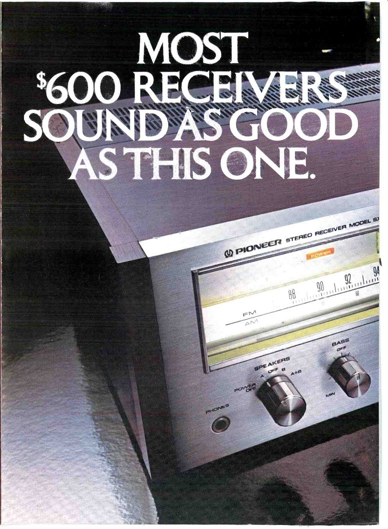 The average $600 receiver sounds as good as the new Pioneer SX-650 until you start listening to prices. If $600 is your kind of price, an SX-650 should qualify as your kind of receiver. Not only will it give you the kind of features and sound quality you'd expect for that kind of money; it'll also leave you with roughly half your receiver budget unexpectedly unspent. But suppose your idea of a receiver price is somewhere under $300 The SX-650 is going to sound better to you than anything you thought you could afford. Because it has more power, a wider frequency range, less distortion, and far greater versatility than most other receivers in that category. All this might sound a little extravagant; but an authentic breakthrough, an achievement like the SX-650, doesn't happen often. We've learned that when our promises seem to sound especially rich, the best thing to do is simply review the facts. It's a fact that the SX-650 provides a continuous power output of 35 watts per channel, min. RMS into 8 ohms, from 20 to 20,000 Hz, with no more than 0.3% total harmonic distortion. It also delivers each instrument and voice at its intended level, balanced within ± 0.3% of the RIGA curve. The facts of its stereo separation, selectivity and sensitivity, however, must be experienced: numbers are impressive, but sometimes only hearing is believing. You'll also be impressed by what you don't hear from the SX-650. You won't hear an assortment of background noises, or the thousand miscellaneous acoustic devils that live in the limbo between FM stations on lesser receivers. On your next visit to a high fidelity dealer, listen to a Pioneer SX-650 with any reasonably accurate speakers. You'll find either its price or its performance amazing. Depending on which you hear first. PIONEER U.S. Pioneer Electronics corp. , Moonachie: New Jersey 07074. Promotional purposes only, the SX-650 is priced under $300. The actual resale price will be set by the individual Pioneer dealer at his option. Also see: LETTERS TO THE EDITOR (Feb 1977) AUDIO BASICS: The Greater Good TANDBERG (ad) Source: Stereo Review (USA magazine) |